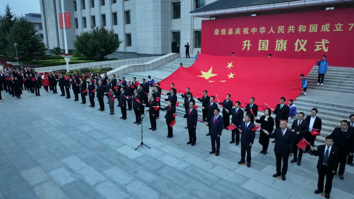 记者申彬衔:“万里山河披锦绣,祖国欢腾颂盛世,金秋时节,万物美好,崇信大地生机无限,今天6时46分,崇信县庆祝中华人民共和国成立七十四周年升国旗仪式将在这里隆重举行。以此祝愿伟大的祖国更加繁荣昌盛,祝愿崇信的明天更加灿烂辉煌。”