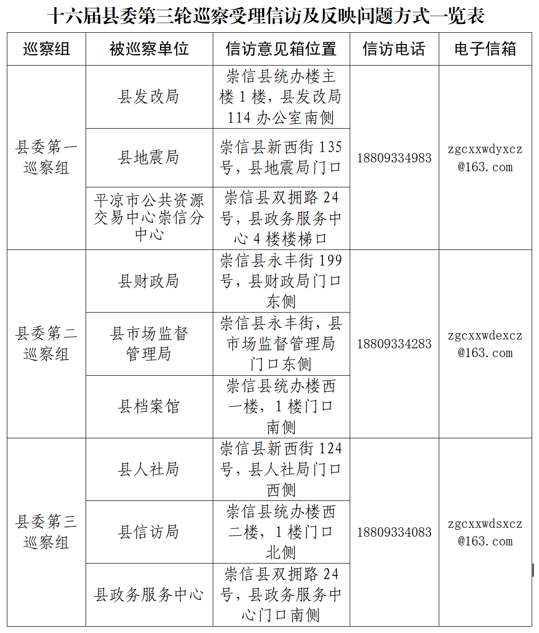 根据县委统一部署,十六届县委第三轮巡察对县财政局、县发改局、县人社局、县市场监督管理局、县信访局、县政务服务中心、县地震局、县档案馆、平凉市公共资源交易中心崇信分中心9个单位开展常规巡察。截至4月17日,县委3个巡察组全部完成巡察进驻工作。