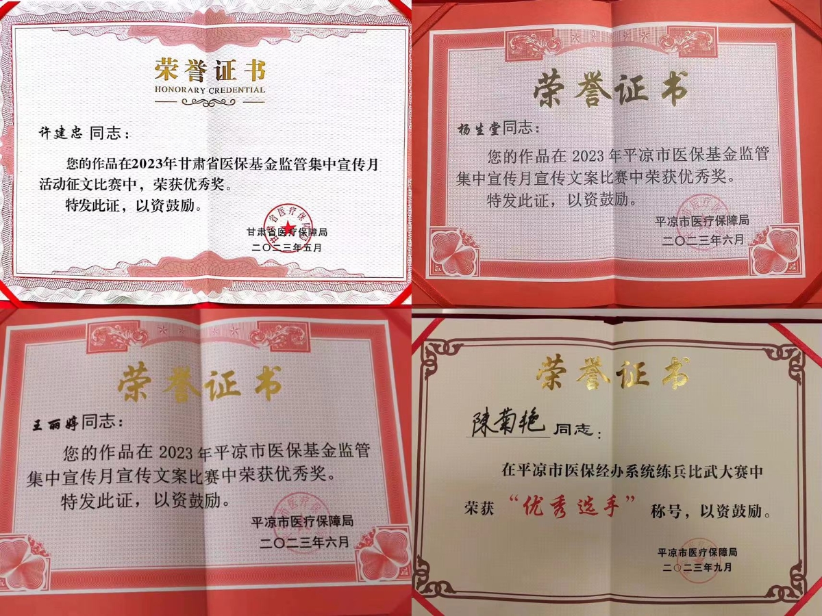 在全省医保基金监管集中宣传月活动中, 县医保局报 送的宣传文案《把 “ 关 ” 守 “ 金 ” ,维护人民利益》快板词 (作者:医保基金社会监督员 许建忠 ) 荣获省医保局个人省级优秀奖 ;医保局 基金监管股负责人 杨生堂 同志 报送的宣传视频《安全规范用基金,守好人民“看病钱”》和崇信医养康复护理院王丽婷 同志 报 送的宣传视频《安全规范用基金,守好人民“看病钱”》分别获得市级优秀作品奖 ;县医保局获得优秀组织奖。获奖数量居县(区)前列。