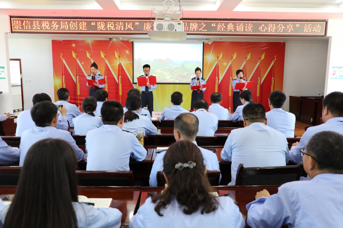据悉,此次“经典诵读 心得分享”活动是崇信县税务局深入推进“陇税清风”廉洁文化品牌创建的一个缩影。今年以来,崇信县税务局以加强廉洁文化建设为抓手,通过扎实推进政治监督具体化、精准化、常态化,深入开展纪法教育、警示教育、革命传统教育、家庭助廉教育,精心打造融思想性、教育性、警示性于一体的廉政文化长廊和廉政教育基地,严管厚爱帮助年轻干部成长成才等系列举措,培育深耕廉洁文化沃土,全力创建以“十廉十风”为主要内容的“陇税清风”廉洁文化品牌,让“陇税清风”在崇信税务落地生根、开花结果。崇信县税务局党委书记、局长郭永军表示,下一步,崇信县税务局将继续以强烈担当和务实举措深化细化“陇税清风”廉洁文化品牌创建,在夯实基础、创新载体、丰富内涵、打造亮点上加力加效,将“陇税清风”融入税收工作全过程各方面,护航崇信税收现代化行稳致远。