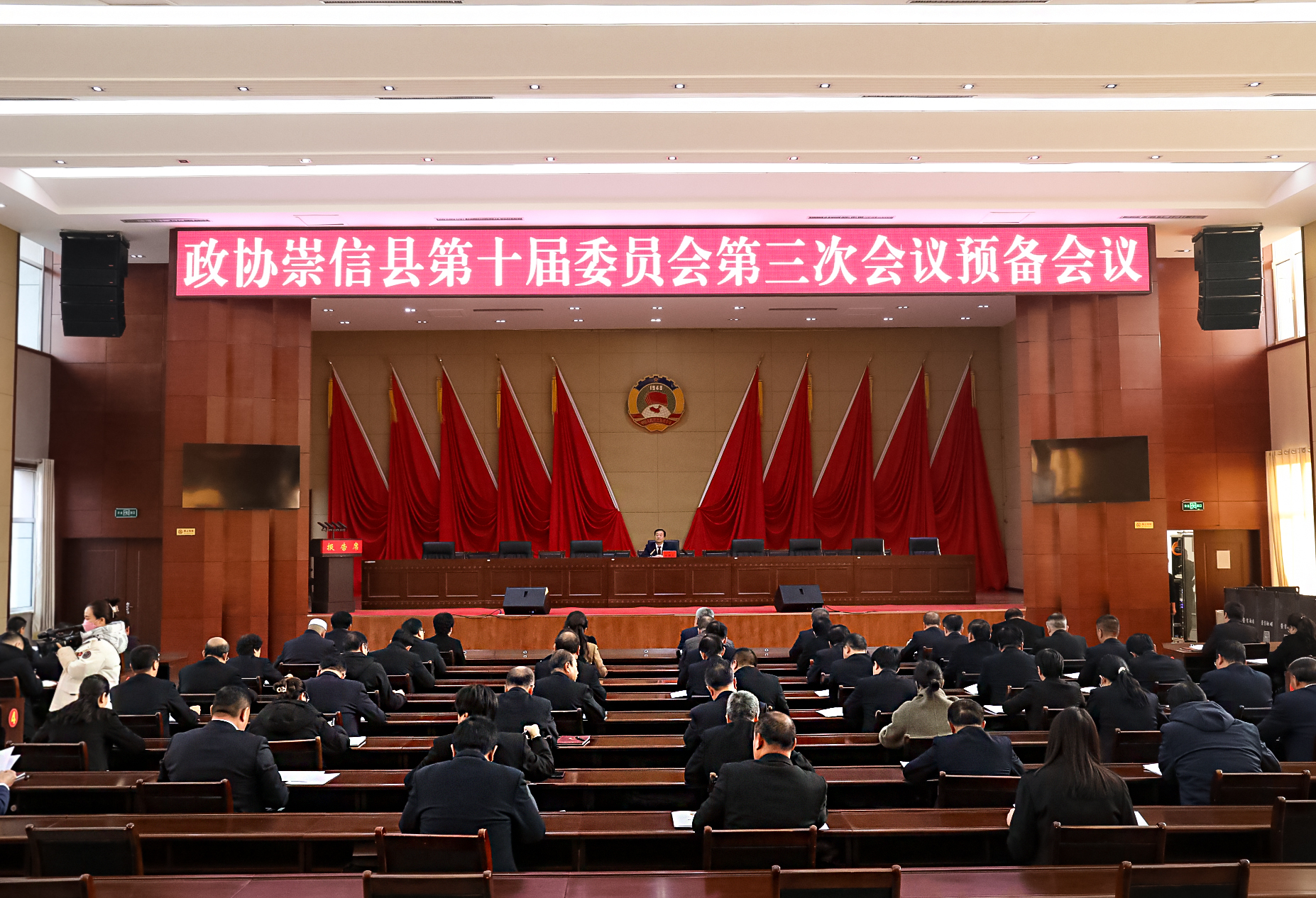 12月22日,政协崇信县第十届委员会第三次会议预备会议召开。会议应到委员103名,实到会委员95名,符合《政协章程》规定。县政协主席完新义主持会议,县政协副主席刘志刚、赵瑛、张忠喜及全体政协委员出席会议。