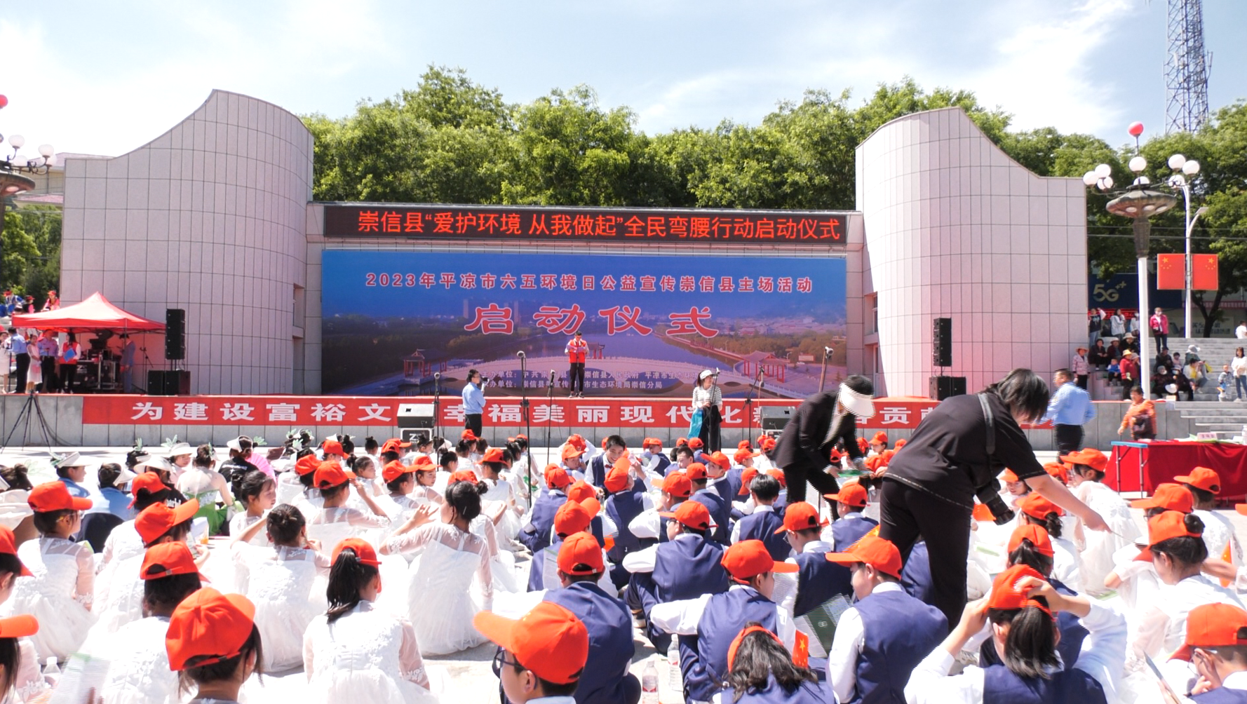 “6·5”世界环境日当天,崇信县“爱护环境 从我做起”全民弯腰行动启动仪式在李元谅广场举行。