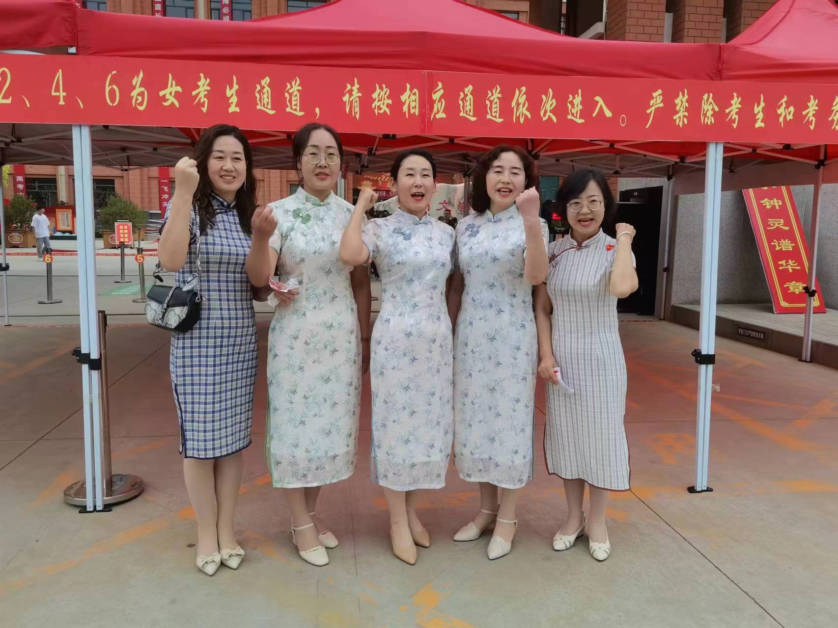 早上7点,记者在崇信一中门口看到考生和送考的家长早早就等在那里。考生们个个意气风发、自信阳光,送考的老师们身着旗袍,贴心地检查学生随身携带地身份证、准考证等考试用品,并为每个考生胸前贴上金榜题名爱心标签。