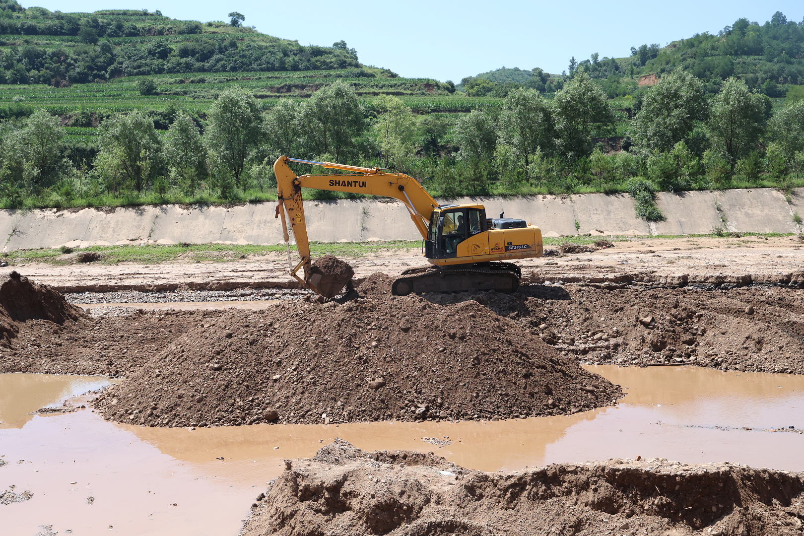 记者在黑河河堤垮塌施工现场看到,铲车、挖掘机等工程机械来回运送石料,由水务部门、镇村干部、施工工人组成的抢险“突击队”头顶酷暑烈日,装沙袋、筑河堤,及时除险加固。