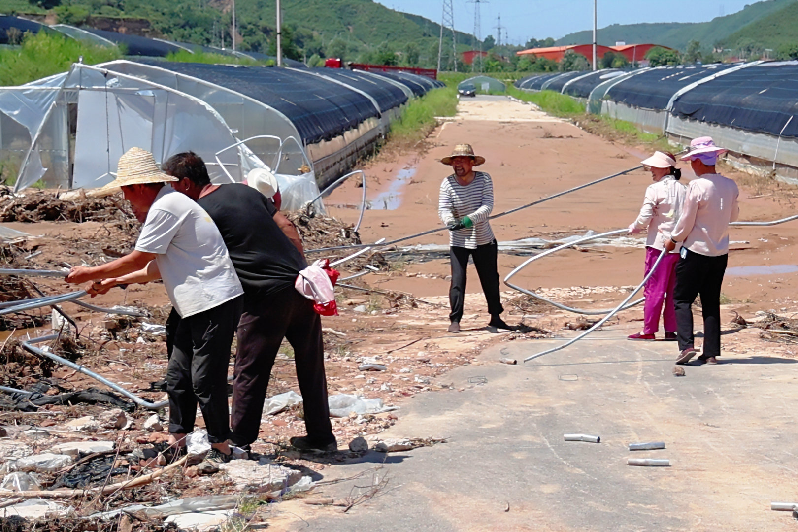 在新窑镇周寨村降雨导致数十亩蔬菜大棚被水冲毁,田间积水严重,灾情发生后,新窑镇广大党员干部、群众自发行动、不等不靠,积极开展生产自救,抓紧抢排农田积水,争分夺秒开展清淤排涝,加快恢复生产生活秩序,全力把灾害损失降到最低。