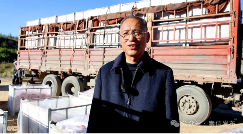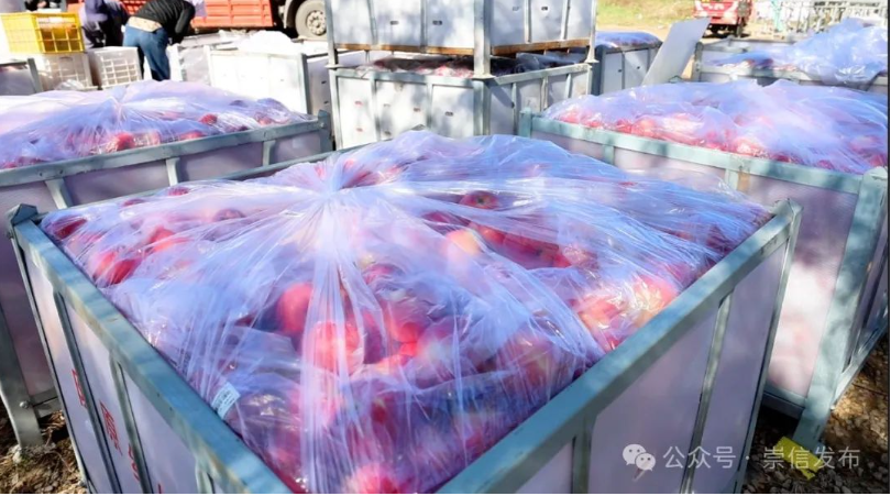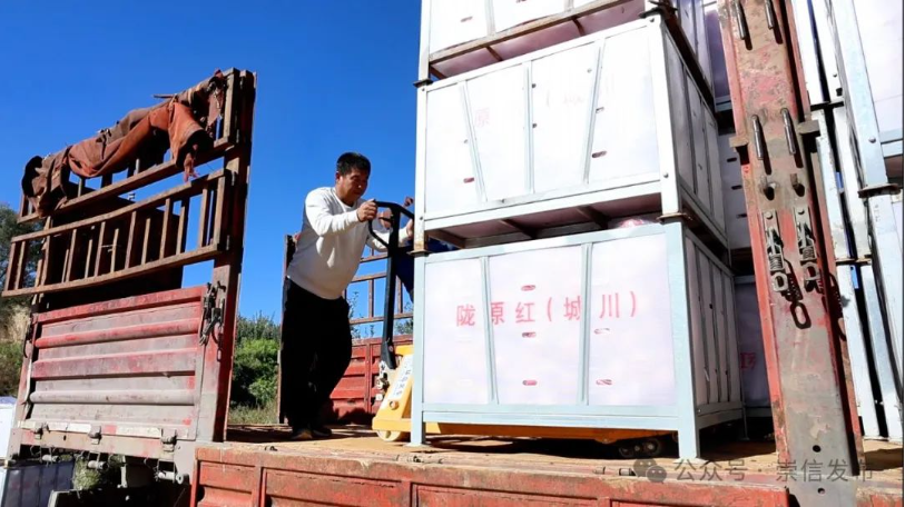 崇信县甲天下果品生态果业有限责任公司总经理郭峰说:“我们甲天下公司的苹果基地喜获丰收,预计产量达到120万斤左右,产值突破400多万元,通过电子商务渠道,积极和长沙C C鲜果超市对接联系,现在装车发往超市配送中心。”