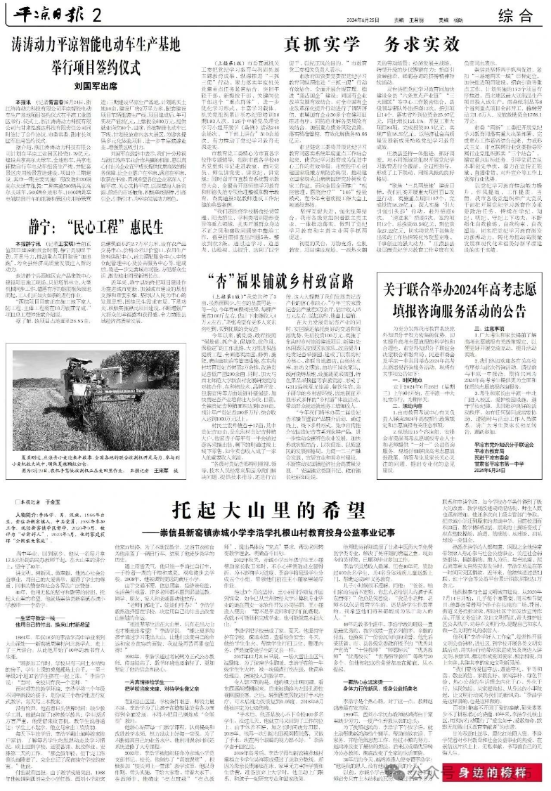 甘为春蚕吐丝尽,愿化红烛照人寰。李浩学凭着对乡村教育和社会公益事业的热爱,在崇信这片沃土上,无私奉献,书写着自己的无悔人生。