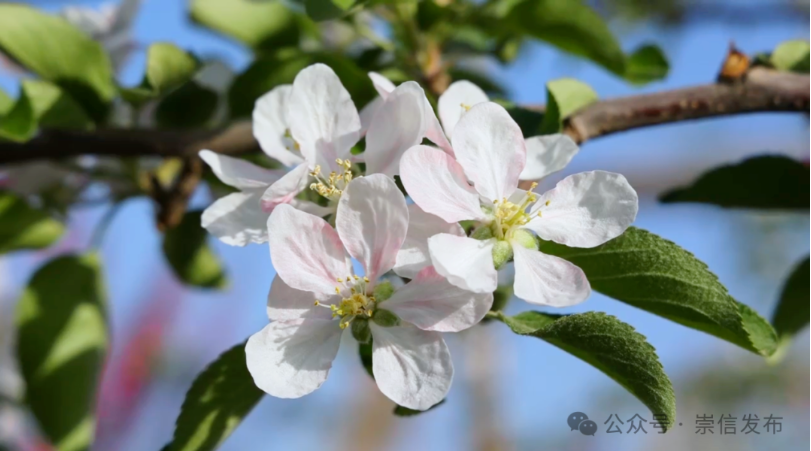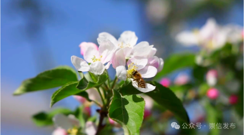 走进苹果园,一排排苹果树白绿相间,洁白的花朵盛放,吸引无数蜜蜂争相拜访,一簇簇、一朵朵白里透粉的花骨朵暗香浮动,清丽雅致,走在果园里,仿佛置身画卷当中,美不胜收。