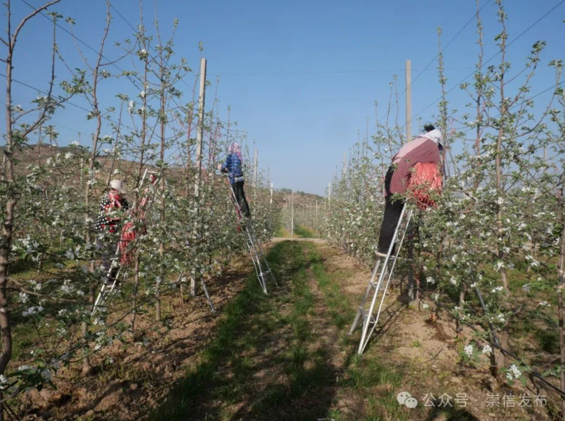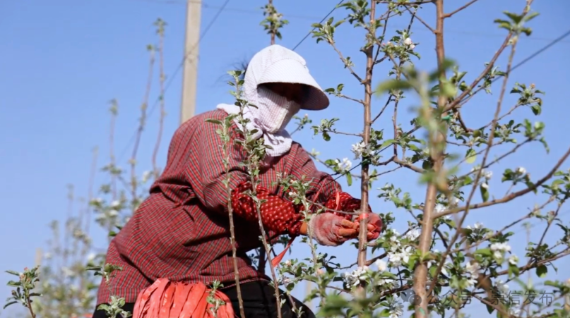 随着气温逐渐回升,果树也进入了春季管护的关键时期,记者看到喷药机来回穿梭在果园里,果农们三五成群,忙着疏花、拉枝,为秋季的苹果丰收蓄力,现场一派热火朝天的劳动场景。