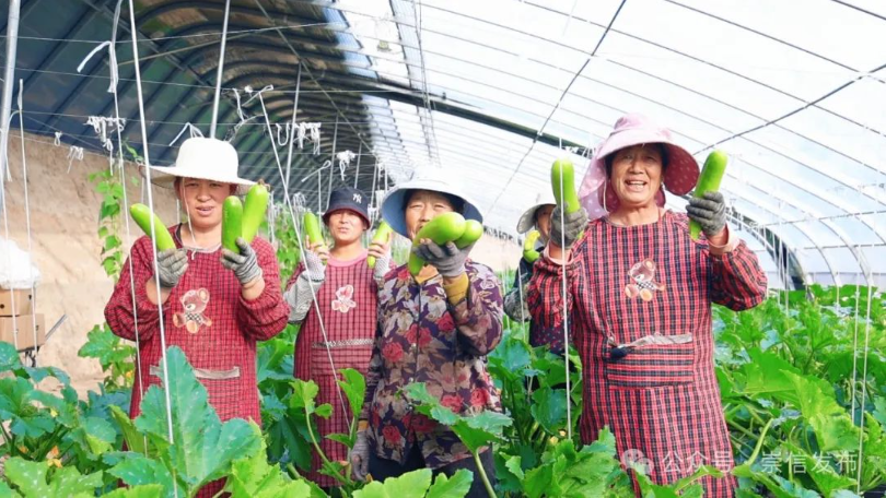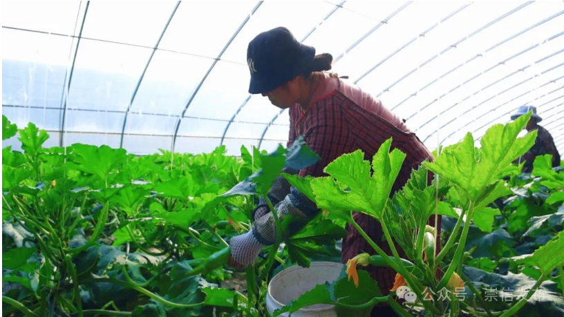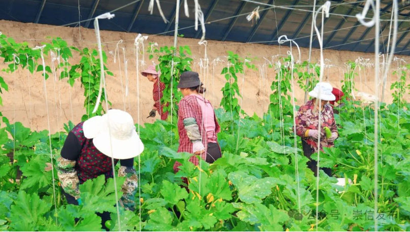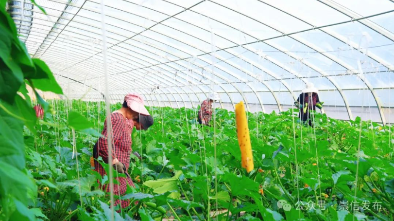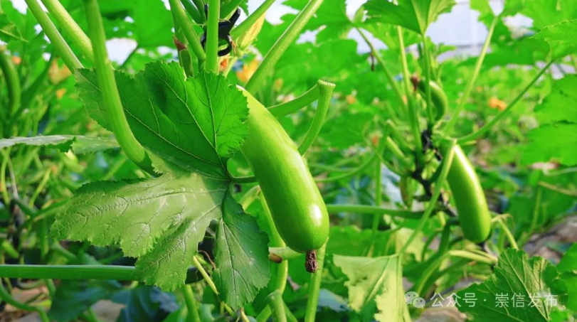 时下,走进崇信县锦屏镇平头沟村设施蔬菜种植基地,一片生机勃勃的景象映入眼帘。硕大的叶片紧密相连,在绿叶的掩映下,西葫芦郁郁葱葱、长势喜人,工人们忙碌地穿梭其间,忙着采摘成熟的西葫芦。