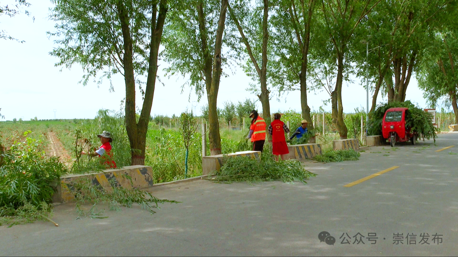 在乡村主干道上,党员群众、公益岗及志愿者对道路两旁树木的枯枝、下垂枝、病残枝等进行修剪,消除安全隐患,美化行道树,营造安全良好的出行环境。