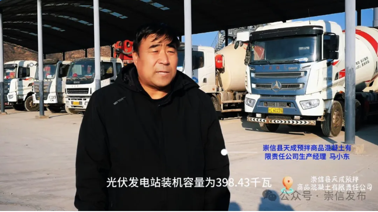 崇信县天成预拌商品混凝土有限责任公司生产经理马小东:“2022年底我公司安装了光伏发电站装机容量为398.43Kw,从2023年4月份发电以来,发电量不仅满足了站内一部分用电需求,还能在将剩余的电余电上网,产生效益。2024年我公司全年光伏发电量为27.1万度,电费支出较未安装光伏时,节省约13万元,另外,余电上网收益约6.5万元,对我们企业来说,节省了很多成本。”