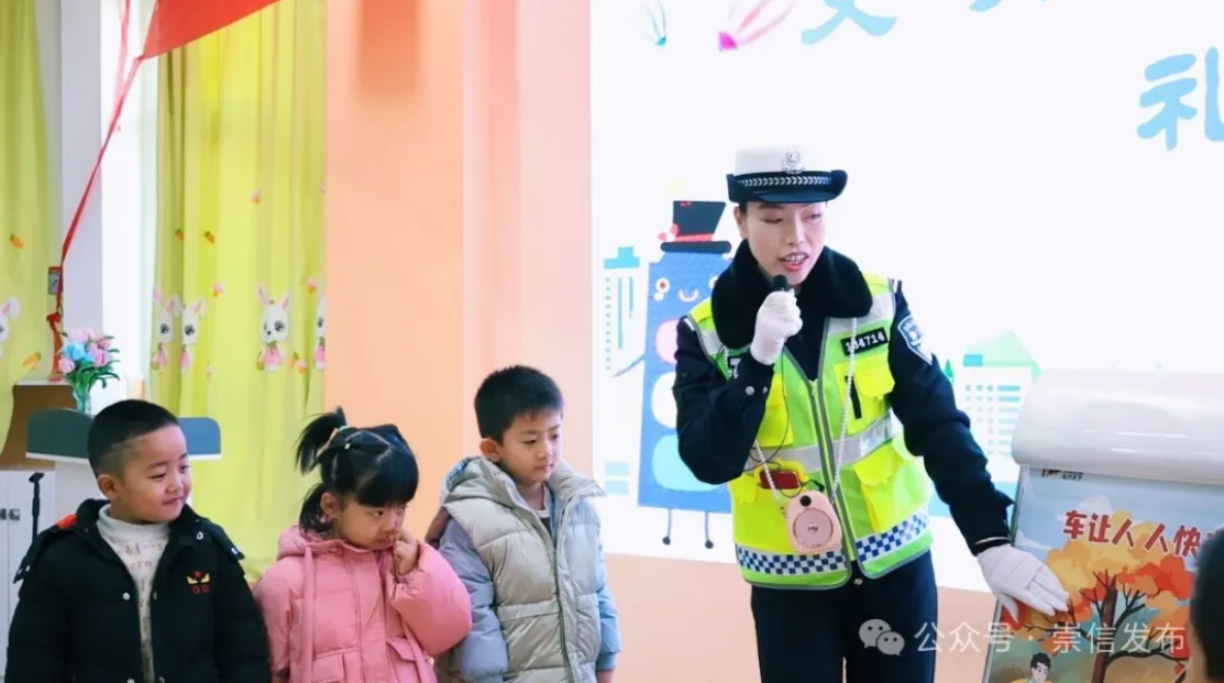 活动中,县交警队民警走进崇信县幼儿园、县第四幼儿园开展“交通安全伴我行”互动课堂。结合幼儿认知特点,用童趣化语言讲解交通信号灯、斑马线、常见交通标志等基础常识,通过趣味问答、交通手势模仿等形式,重点强调幼儿乘车、过马路时“不追逐打闹”“不随意横穿马路”等安全要点,让孩子们在轻松互动中掌握安全出行知识。
