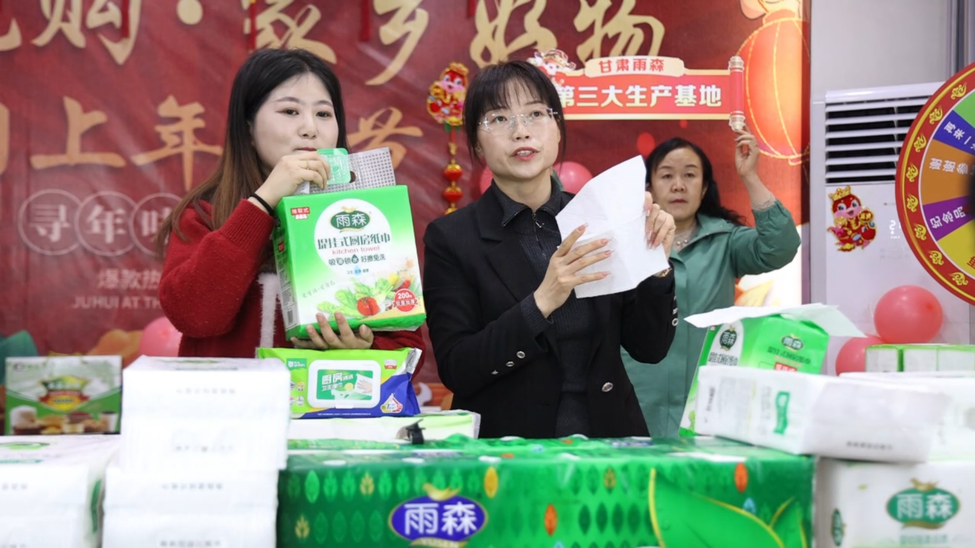 主播李娟说:“我是崇信的一名乡村推介官,今天很荣幸能参加崇信县2025年年货节直播活动,今天通过直播间把崇信的苹果、红牛,还有雨森纸推向全国各地。”