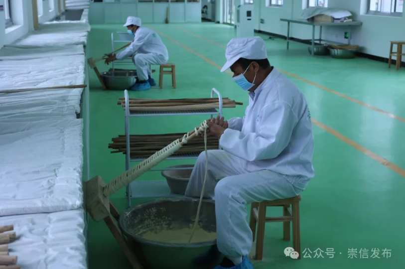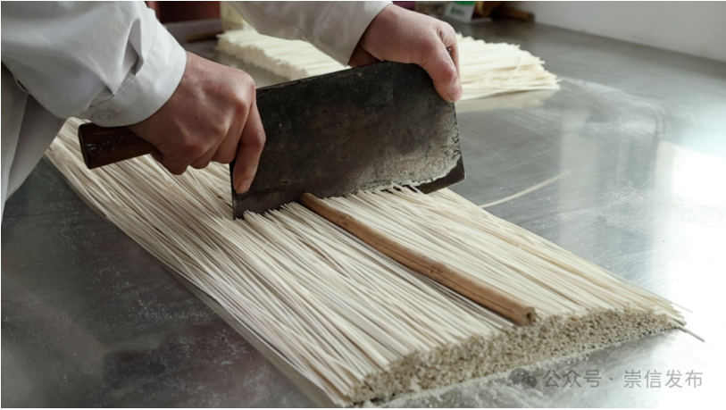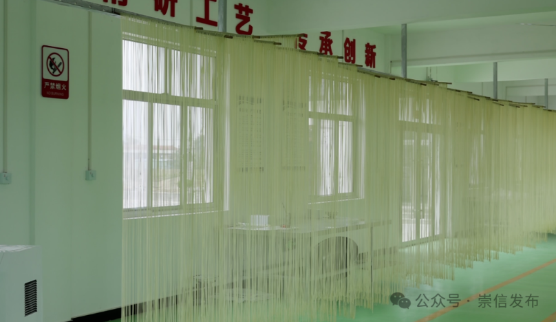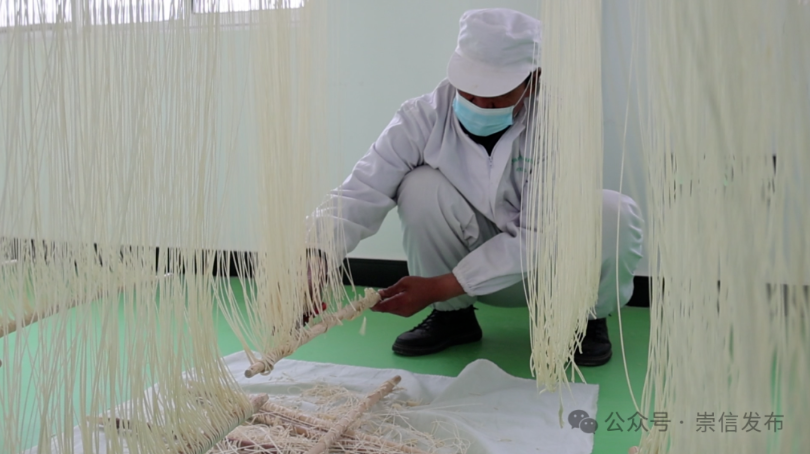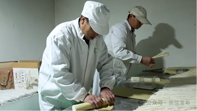 初春时节,在崇信县木林乡汭塬香食品加工厂生产车间和木林乡沟老村手工挂面作坊内呈现出一片繁忙景象,从选料到和面、抻面、开条、上架、切面、包装一道道工序在师傅们手中娴熟地操作,晾晒架上一排排拍闪着银光的挂面随风轻摆,丝滑如弦、细密雪白,浓郁醇厚的面香扑鼻而来。