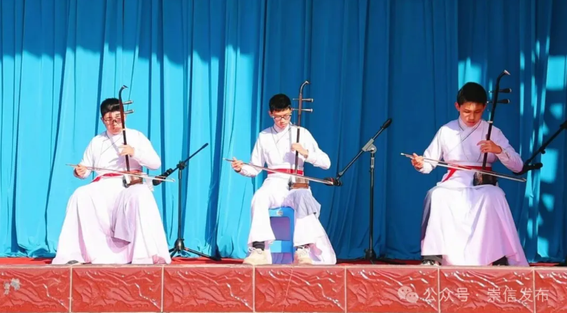 文艺演出环节气氛热烈。器乐合奏《战马奔腾》以激昂旋律拉开序幕,瞬间点燃全场热情;舞蹈《敕勒歌》舞姿舒展,意境悠远,勾勒出辽阔草原的壮美画卷;节目《移风易俗三句半》语言诙谐、节奏明快,让文明新风吹入欢声笑语;合唱《春风十万里》歌声嘹亮,寄托了对美好生活的真挚礼赞;非遗展示《学唱弦子腔》则将地方传统戏曲与剧情生动融合,让观众近距离感受到传统文化的魅力,赢得阵阵掌声。