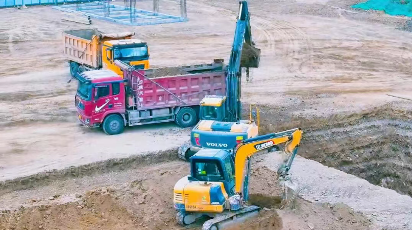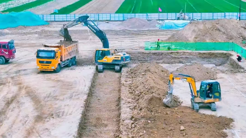 走进项目建设现场,挖掘机、洒水车等工程车辆往来穿梭,工人们在各施工区域紧张有序地忙碌着。目前,1号车间主体结构已见雏形,一层框架、钢柱钢梁已全部完工,工人们正加紧进行二层框架施工。一旁的研发中心同样进展迅速,化验室一层框架混凝土已浇筑完成,消防水池垫层浇筑完毕,工人们正紧锣密鼓地开展底部钢筋绑扎作业。与此同时,3号车间的基础开挖工作也已全面铺开。