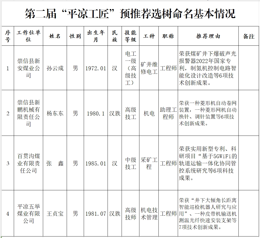 按照平凉市总工会《关于开展平凉市第二届“平凉工匠”学习宣传选树命名活动的预通知》(平工发〔2023〕5号)精神,县总工会根据评选条件和评选要求,拟推荐平凉新安煤业有限责任公司孙云成、崇信新鹏机械制造有限公司杨东东、崇信百贯沟煤业有限责任公司张鑫和平凉市五举煤业有限责任公司王贞宝4名同志拟申报平凉市第二届“平凉工匠”候选人,现予以公示,接受广大职工群众监督。如发现有影响推荐评选的问题,可通过电话、来信、面谈等形式反映,我们将认真受理。