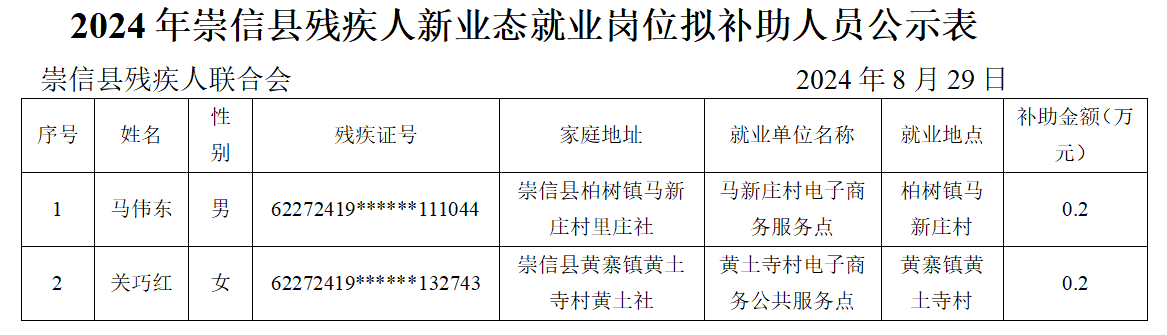 为做好我县2024年残疾人自主就业创业扶持工作,经乡镇(城市社区)摸底、推荐,对初步认为符合“新业态就业岗位补贴”项目条件的残疾人情况进行公示。公示时间为5个工作日(2024年8月29日至2024年9月4日)。公示期内接受本县群众监督,对与事实不相符的,请知情部门及群众,可通过各种方式和途径向崇信县残疾人联合会进行举报。