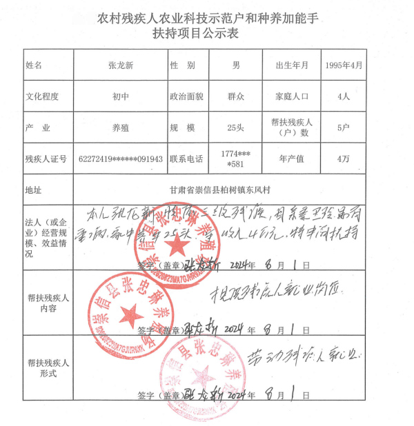 根据2024年全市农村残疾人农业科技示范户和种养加能手扶持项目实施方案,为助力残疾人大力发展地方特色农业优质产业和其它农业产业项目,提升科技含量,扩大产业经营规模,带动和帮扶更多残疾人家庭发展种植养殖和加工业等产业。经崇信县残联对符合条件的扶持对象资格审查,现将符合条件的扶持对象进行公示。公示时间为5个工作日(2024年8月29日至2024年9月4日)。公示期内接受本县群众监督,对与事实不相符的,请知情部门及群众通过各种方式和途径向崇信县残疾人联合会进行举报。