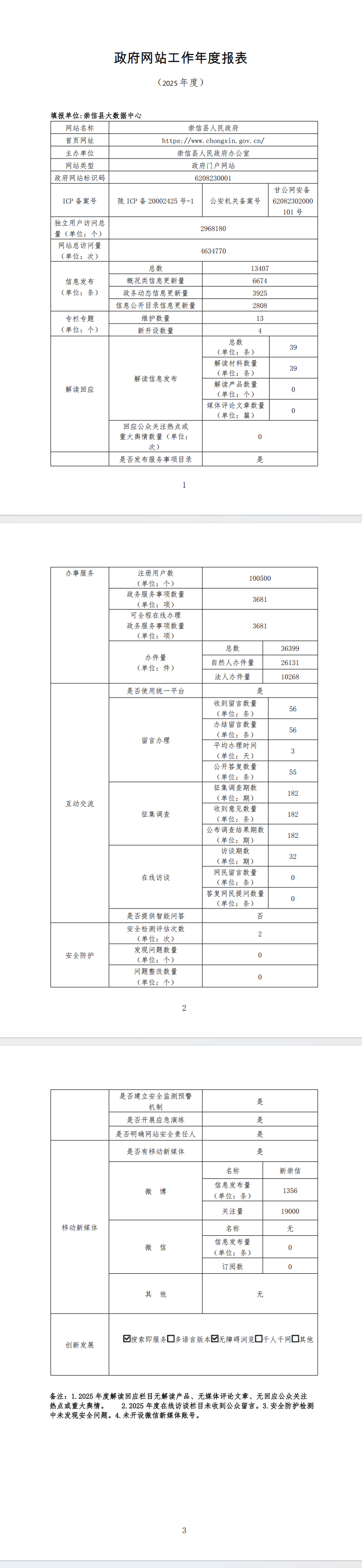 关于2025年崇信县政府门户网站工作年度报表的公示 发文日期:2026-01-16 11:11 来源:崇信县大数据中心 作者:崇信县大数据中心 编辑:路小曼 扫一扫在手机打开当前页 上一篇: 崇信县第十八届人民代表大会常务委员会公告(第27号) 下一篇: 关于对下达2025年农村客运补贴和城市交通发展奖励资金费改税部分审核情况的公示