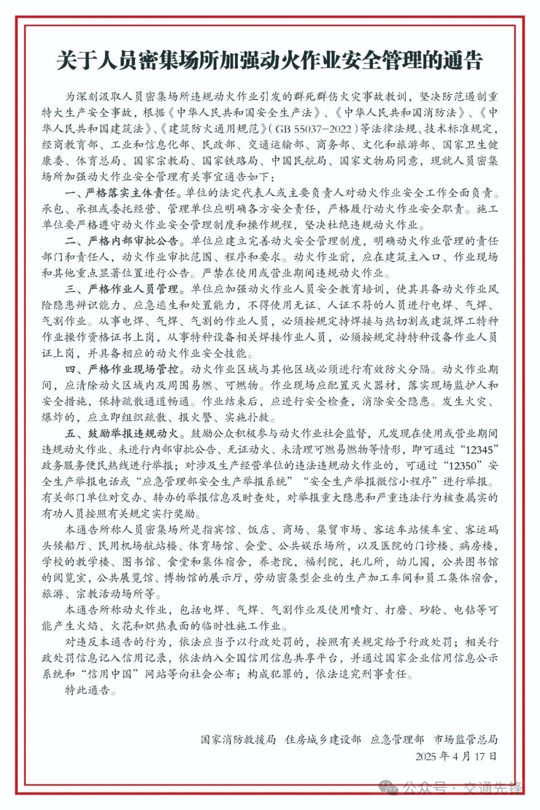关于人员密集场所加强动火作业安全管理的通告 发文日期:2025-05-01 16:51 来源:崇信县交通局 作者:袁福奎 编辑:袁福奎 扫一扫在手机打开当前页 上一篇: 关于切实做好2025年汛期公路灾害风险隐患排查整治的通知 下一篇: 关于印发《2025年全县交通运输行业“安全生产月”活动实施方案》的通知