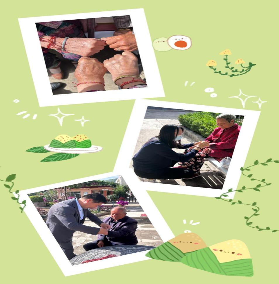 端午节系五彩绳有祈福纳吉、平安健康的美好寓意,一缕五彩绳,编织着健康和祝福,中心的工作人员给老人系上五彩绳,表达对老人的美好祝愿。
