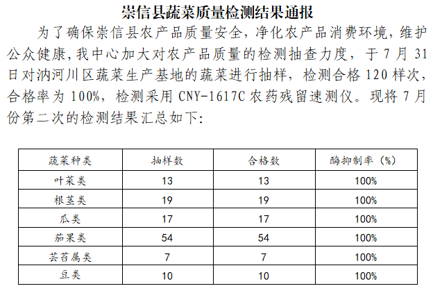 2020年7月份崇信县蔬菜质量检测结果通报(第12期) 发文日期:2020-08-03 00:00 来源:崇信县农业农村局 作者:崇信农牧局 编辑:崇信农牧局 扫一扫在手机打开当前页 上一篇: 2020年8月份农产品农药残留检验报告单(第13期) 下一篇: 2020年7月份农产品农药残留检验报告单(第12期)
