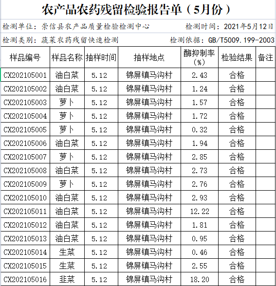 2021年5月份农产品农药残留检验报告单(第6期) 发文日期:2021-05-18 00:00 来源:崇信部门信息公开 作者:崇信农牧局 编辑:崇信农牧局 扫一扫在手机打开当前页 上一篇: 2021年6月份崇信县蔬菜质量检测结果通报(第7期) 下一篇: 2021年5月份崇信县蔬菜质量检测结果通报(第6期)