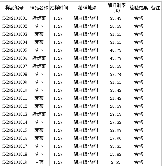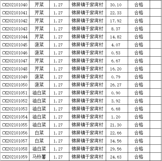 2021年1月份农产品农药残留检验报告单(第1期) 发文日期:2021-01-29 00:00 来源:崇信部门信息公开 作者:崇信农牧局 编辑:崇信农牧局 扫一扫在手机打开当前页 上一篇: 2021年2月份农产品农药残留检验报告单(第2期) 下一篇: 2021年1月份崇信县蔬菜质量检测结果通报(第1期)