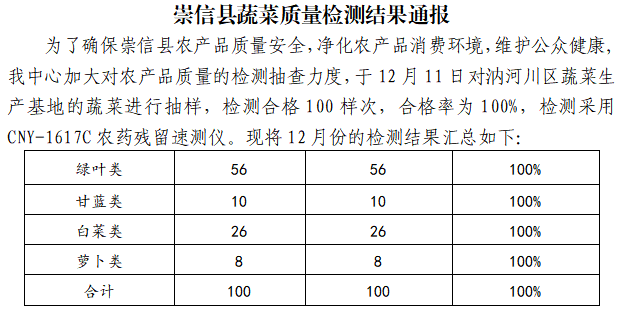 2019年12月崇信县蔬菜质量检测结果通报 发文日期:2019-12-11 00:00 来源:崇信县农业农村局 作者:崇信农牧局 编辑:崇信农牧局 扫一扫在手机打开当前页 上一篇: 2020年1月份崇信县蔬菜质量检测结果通报 下一篇: 2019年案件信息公开表