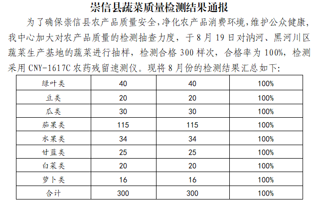 2019年8月崇信县蔬菜质量检测结果通报