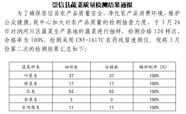 2020年3月崇信县蔬菜质量检测结果通报(第4期) 发文日期:2020-04-01 00:00 来源:崇信县农业农村局 作者:崇信农牧局 编辑:崇信王军 扫一扫在手机打开当前页 上一篇: 2020年3月农产品农药残留检验报告单(第3期) 下一篇: 2020年3月农产品农药残留检验报告(第4期)