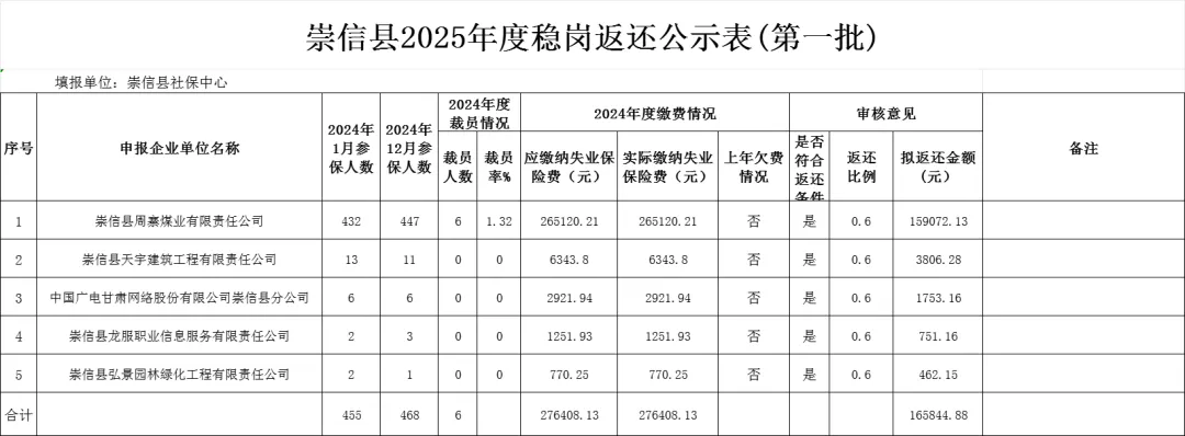 根据《甘肃省人力资源和社会保障厅甘肃省财政厅国家税务总局甘肃省税务局关于做好失业保险稳岗惠民政策落实工作的通知》(甘人社通〔2025〕166号)文件规定,现对崇信县拟享受2025年度失业保险稳岗返还的崇信县周寨煤业有限责任公司等5户企业予以公示,接受社会监督。如发现不符合实际情况和政策规定的问题,可通过电话、来信、面谈等形式反映,我们将认真受理,并及时反馈核实情况。如不存在影响享受稳岗返还政策的问题,将按照有关规定实施返还。