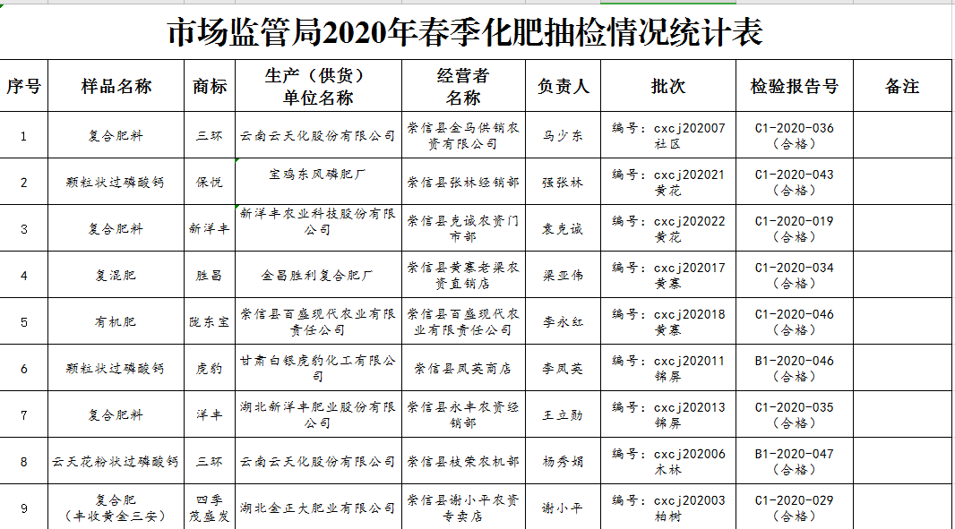 市场监管局2020年春季化肥抽检情况统计表 发文日期:2020-04-22 00:00 来源:崇信县市场监督管理局 作者:崇信食药监局 编辑:崇信食药监局 扫一扫在手机打开当前页 上一篇: 中华人民共和国产品质量法