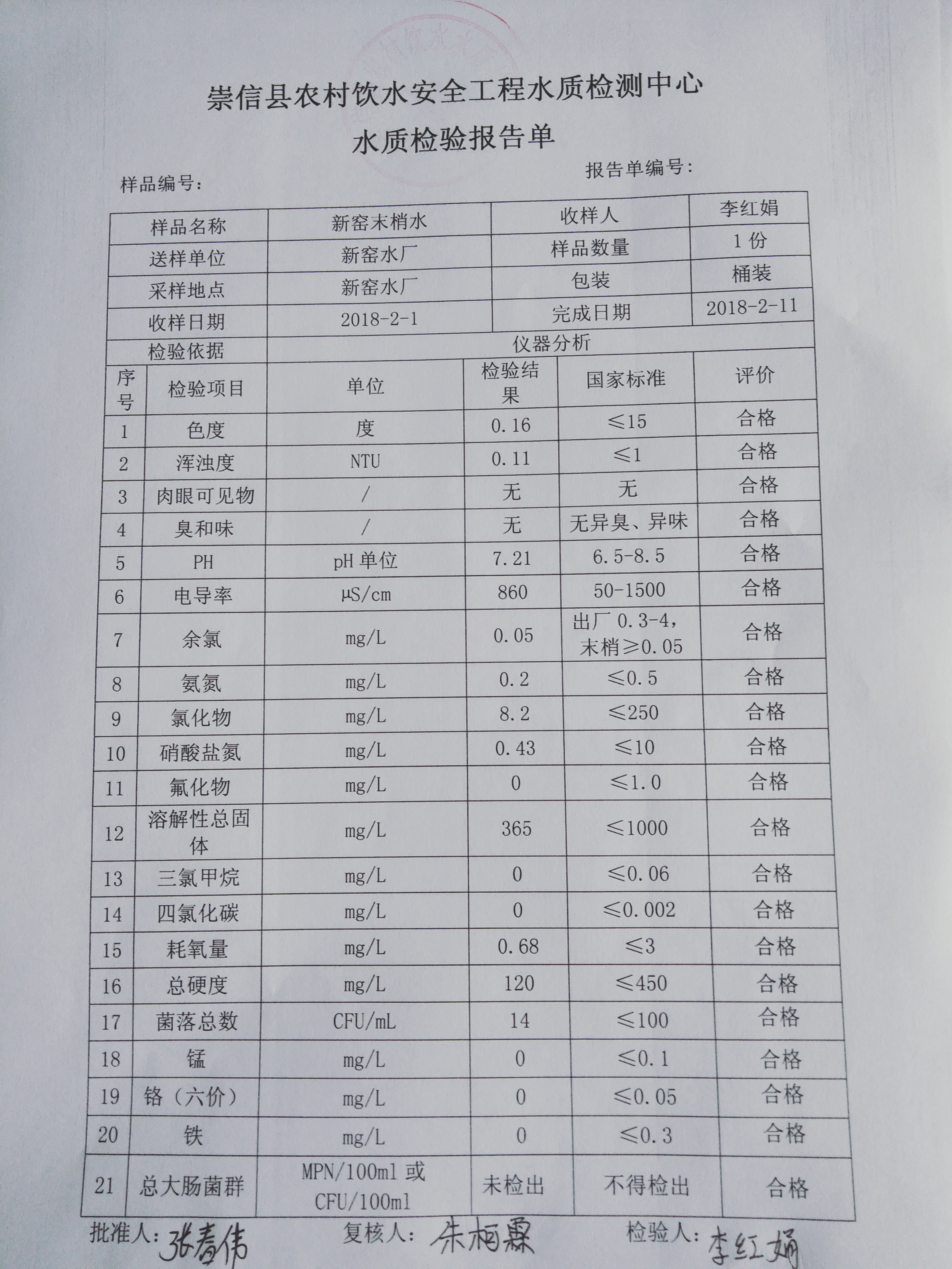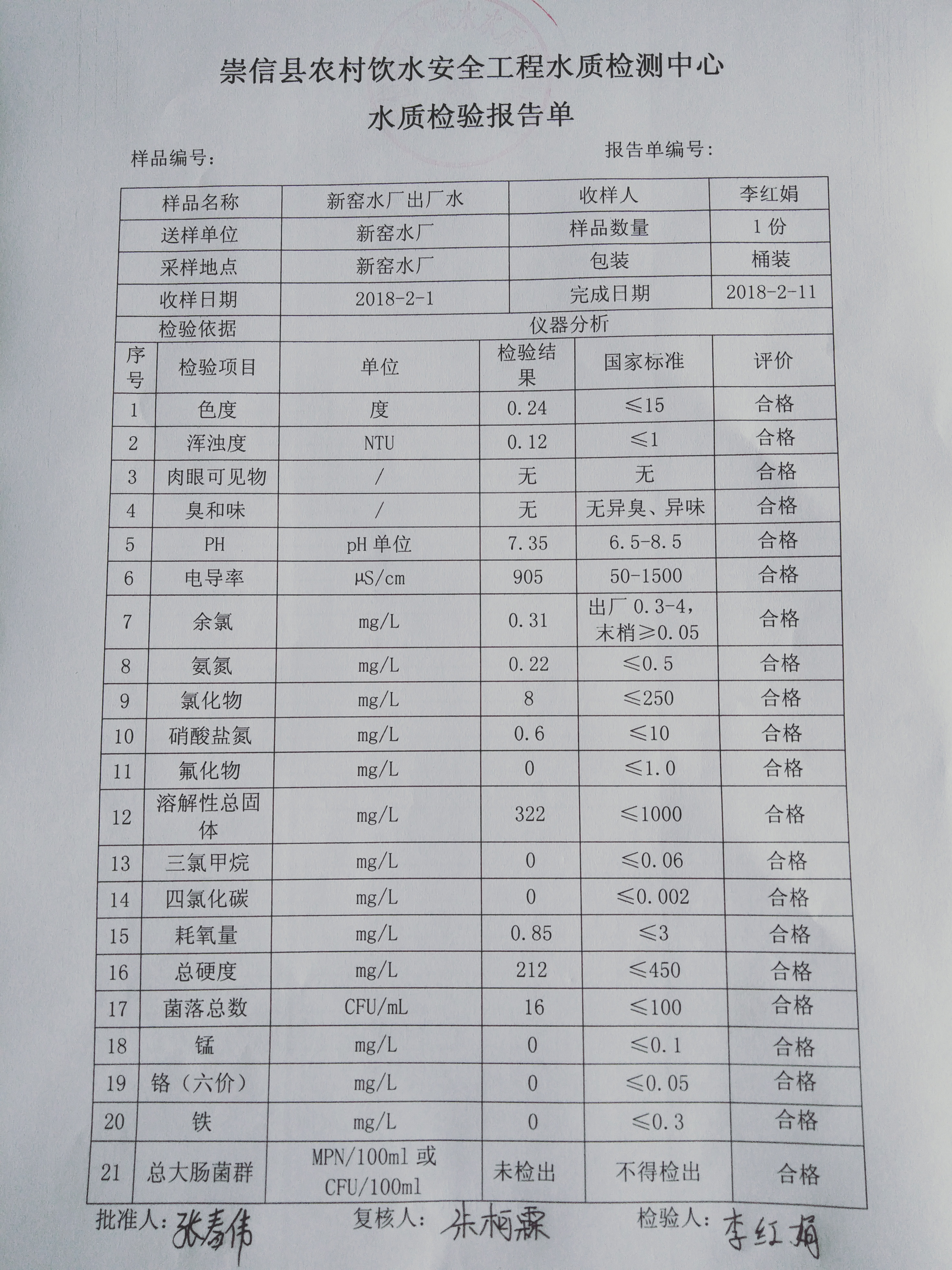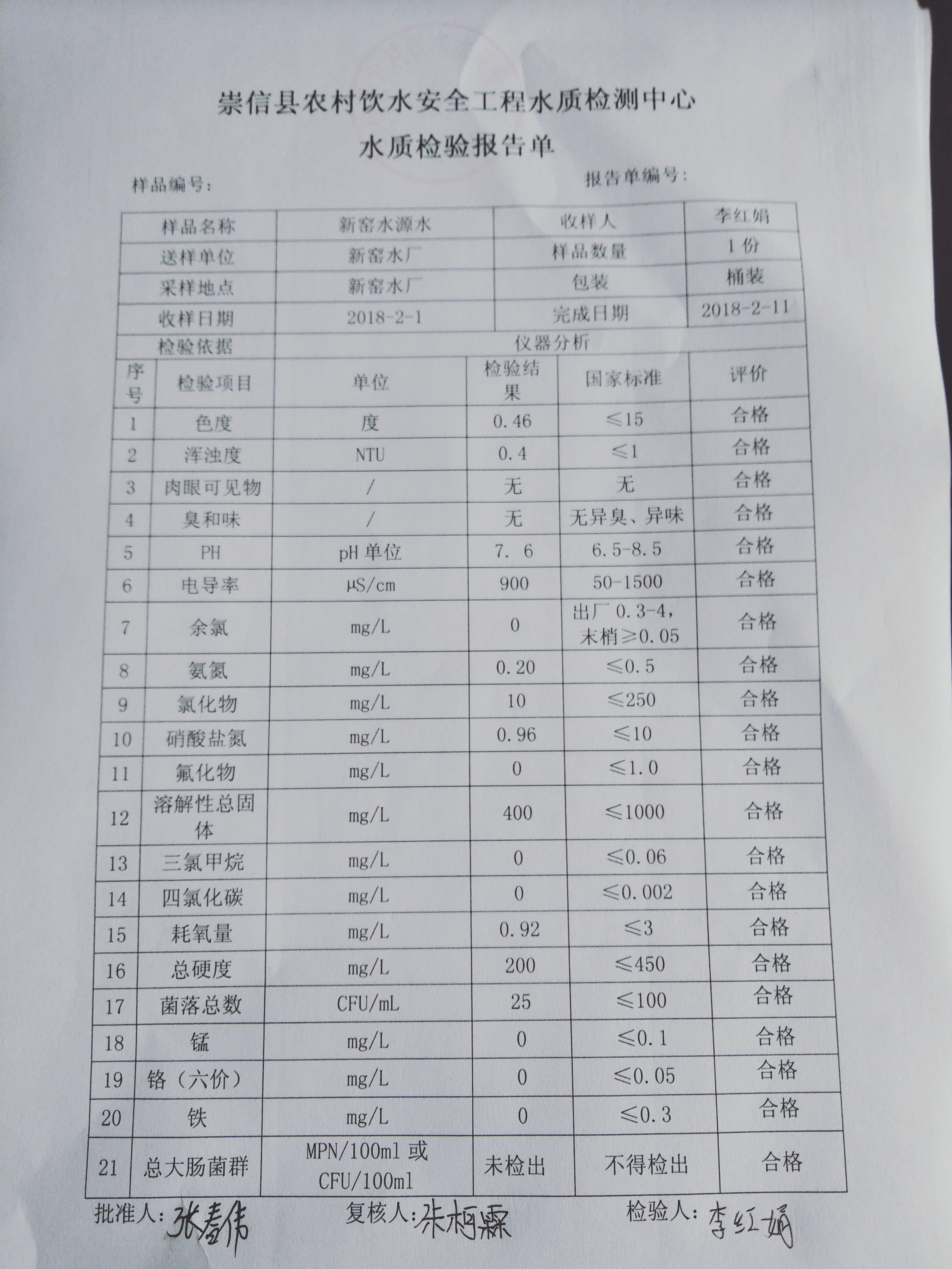 2018年新窑水厂2月份水质检测报告单 发文日期:2018-03-09 11:50 来源:崇信县水务局 作者:崇信水务局 编辑:崇信水务局 1520564608244 1520564627718 1520564647849 扫一扫在手机打开当前页 上一篇: 2018年杜家沟水厂2月份水质检测报告单 下一篇: 2018年左营沟水厂2月份水质检测报告单
