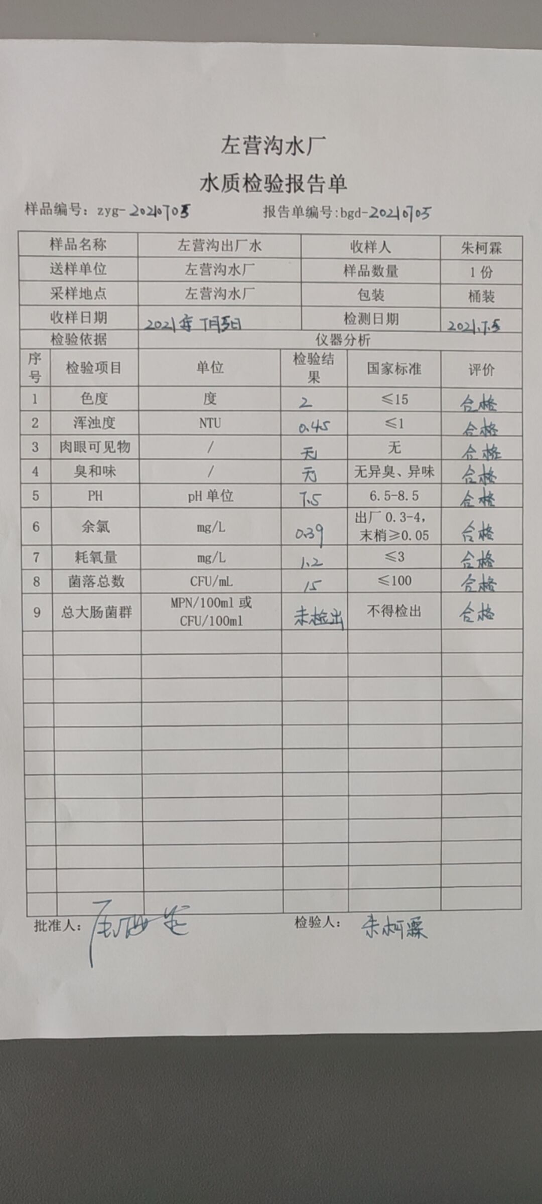 2021年7月左营沟水厂水质检测报告单 发文日期:2021-07-12 00:00 来源:崇信县水务局 作者:崇信水务局 编辑:崇信水务局 C:fakepathQQ图片20210712174759.jpg 扫一扫在手机打开当前页 上一篇: 停水通知 下一篇: 2021年7月左营沟水厂水质检测报告单