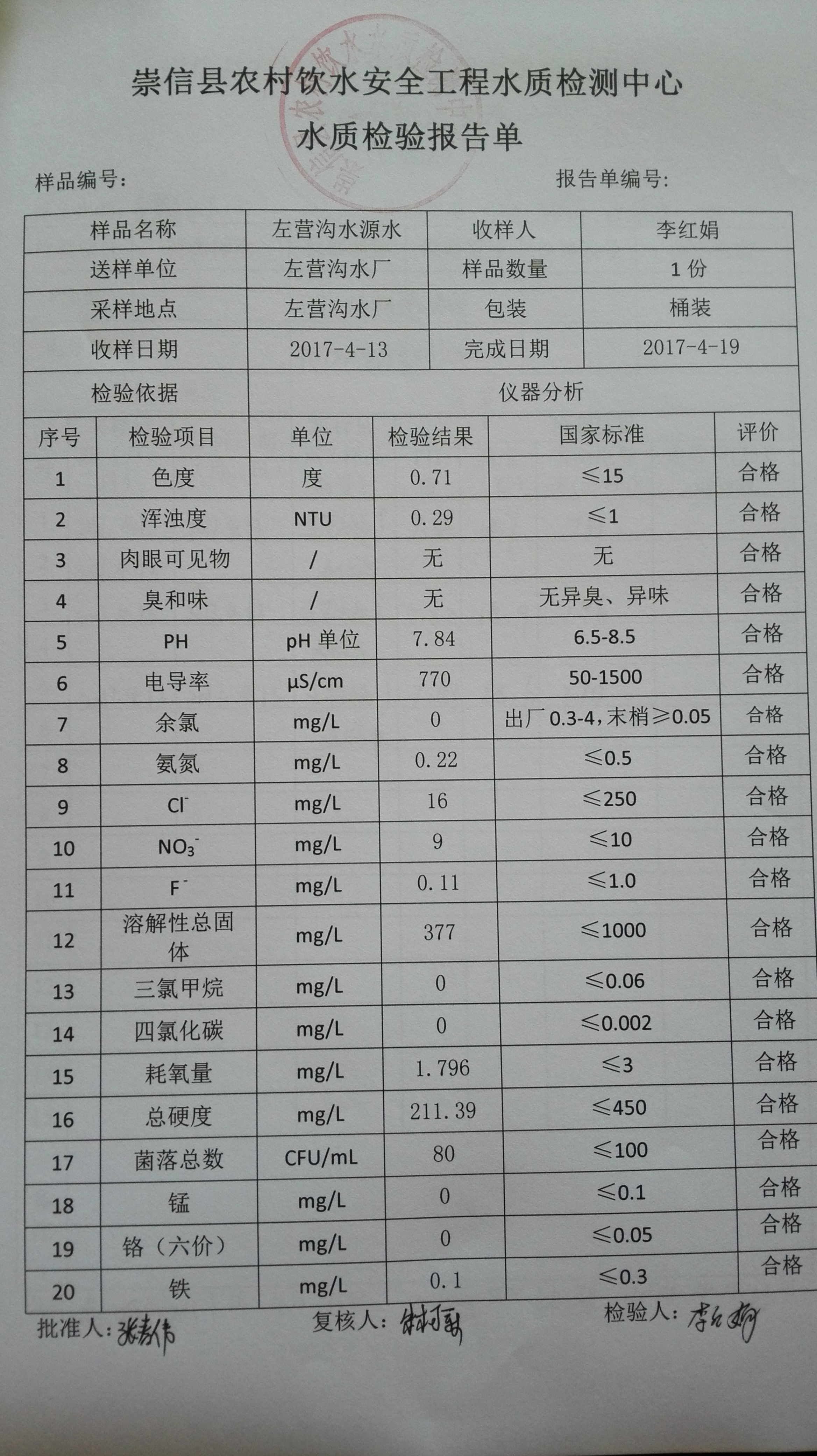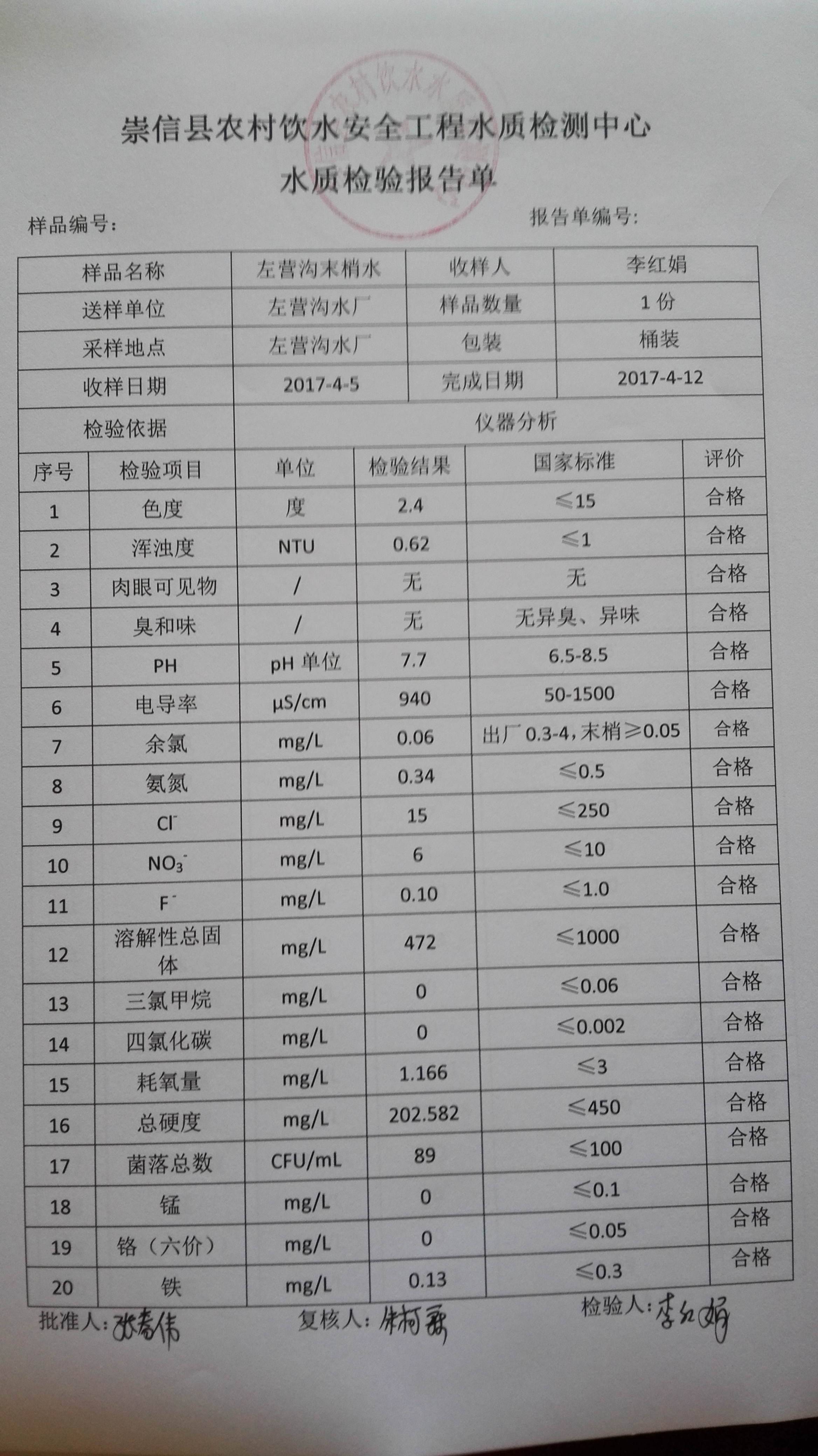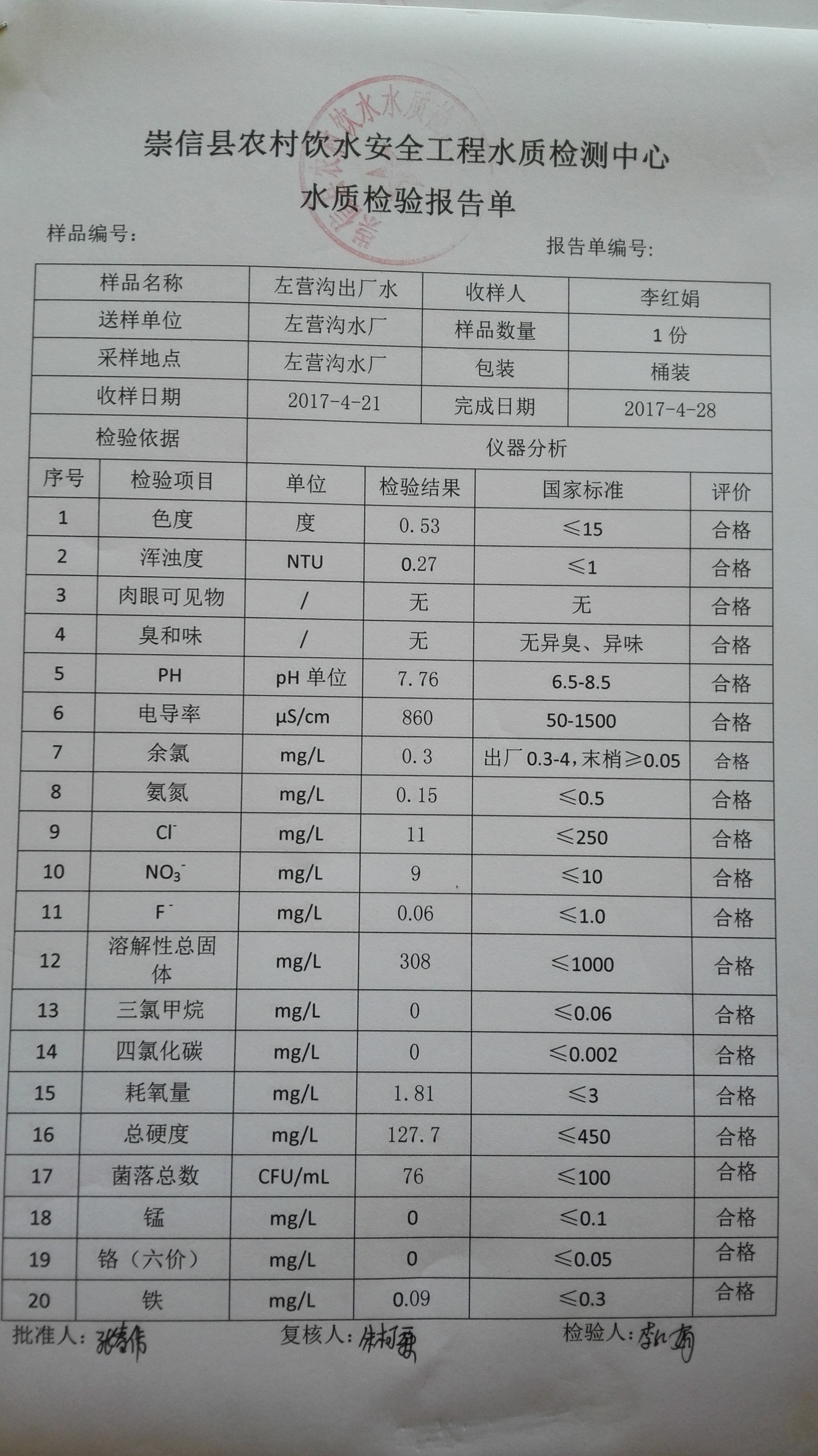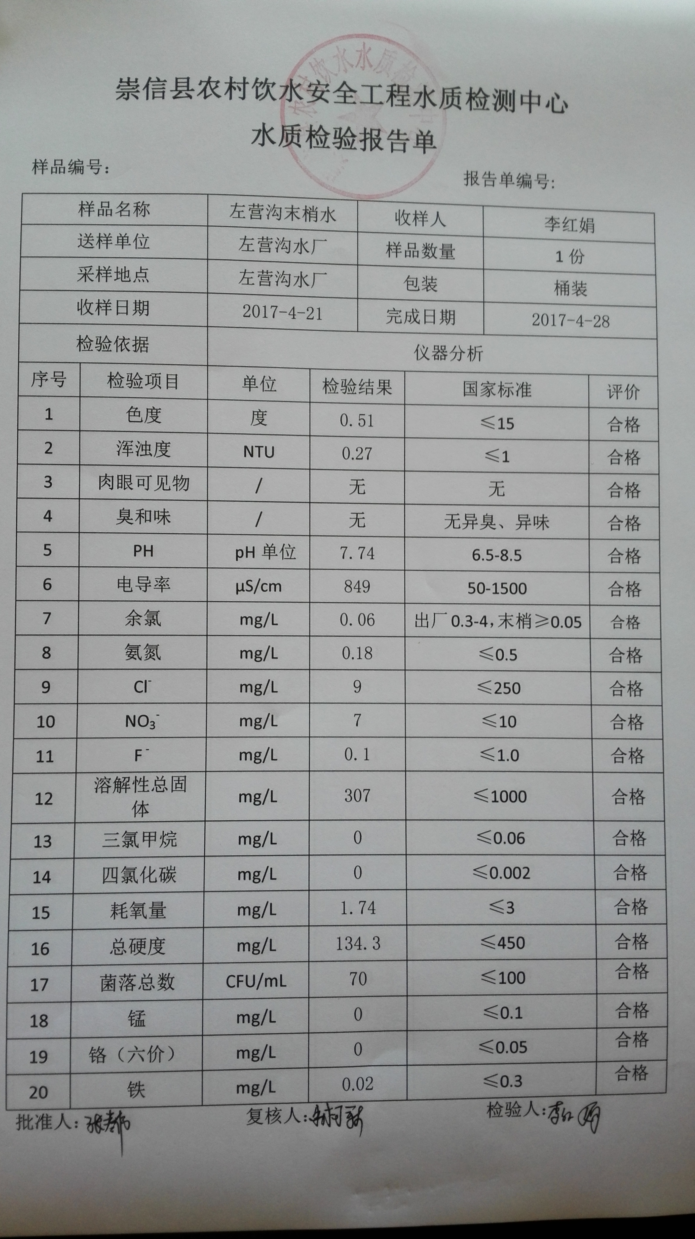 2017年4月份左营沟水厂水质检测报告单 发文日期:2017-09-28 15:35 来源:崇信县水务局 作者:崇信水务局 编辑:崇信水务局 1506575596127 1506575609652 1506575620601 1506575677850 1506575691458 1506575703925 1506575718227 1506575728684 1506575744237 扫一扫在手机打开当前页 上一篇: 2017年5月份左营沟水厂水质检测报告单 下一篇: 2017年3月份左营沟水厂水质检测报告单