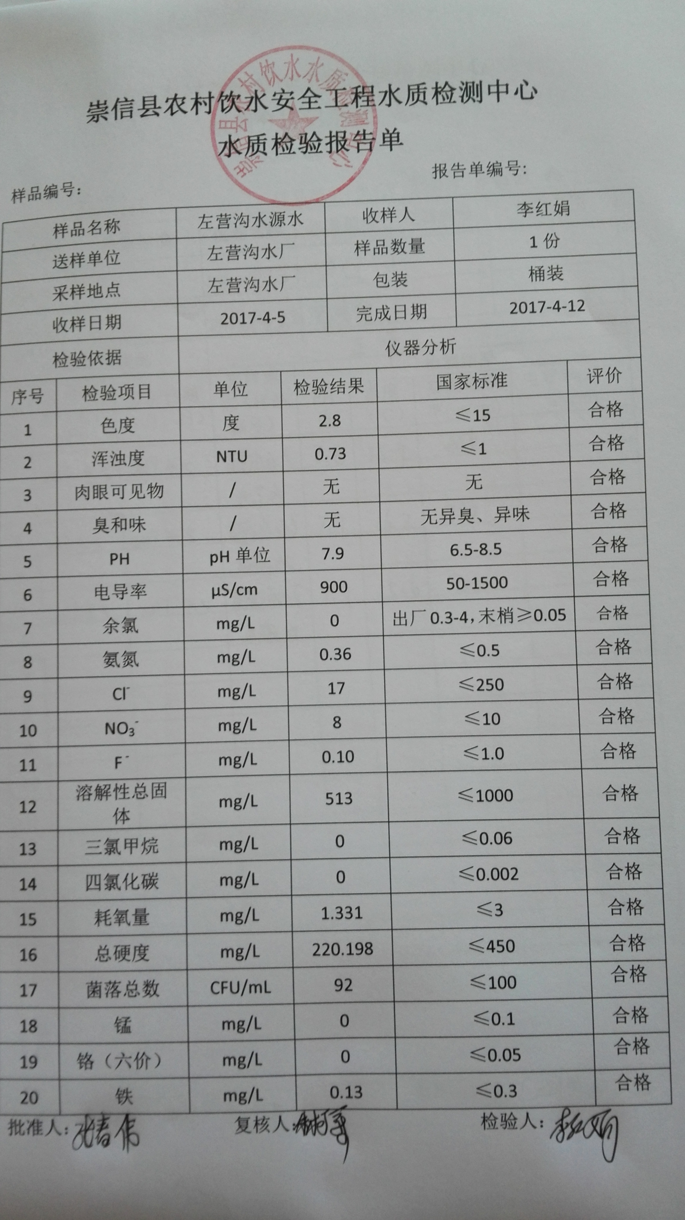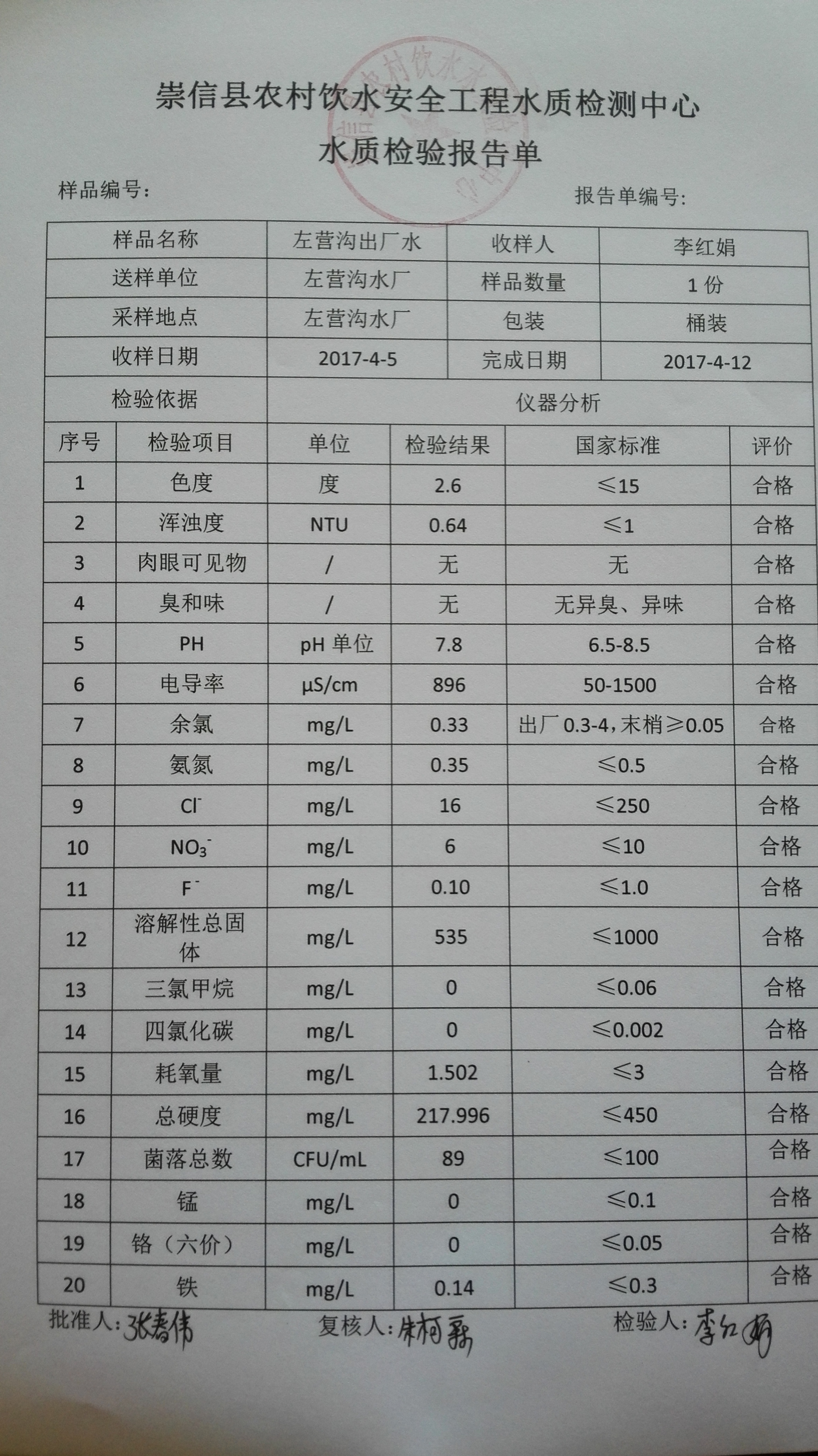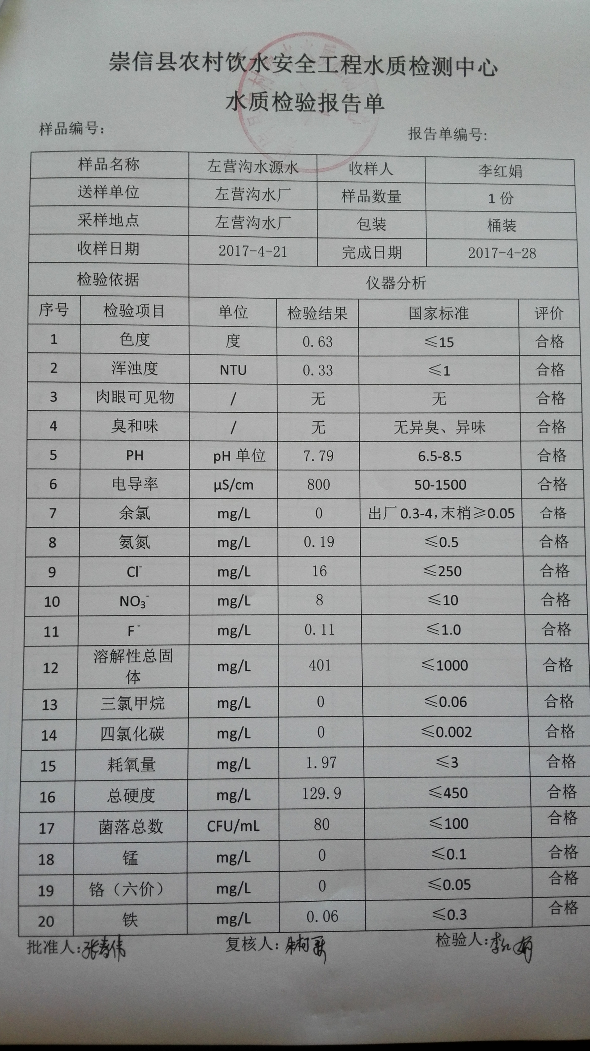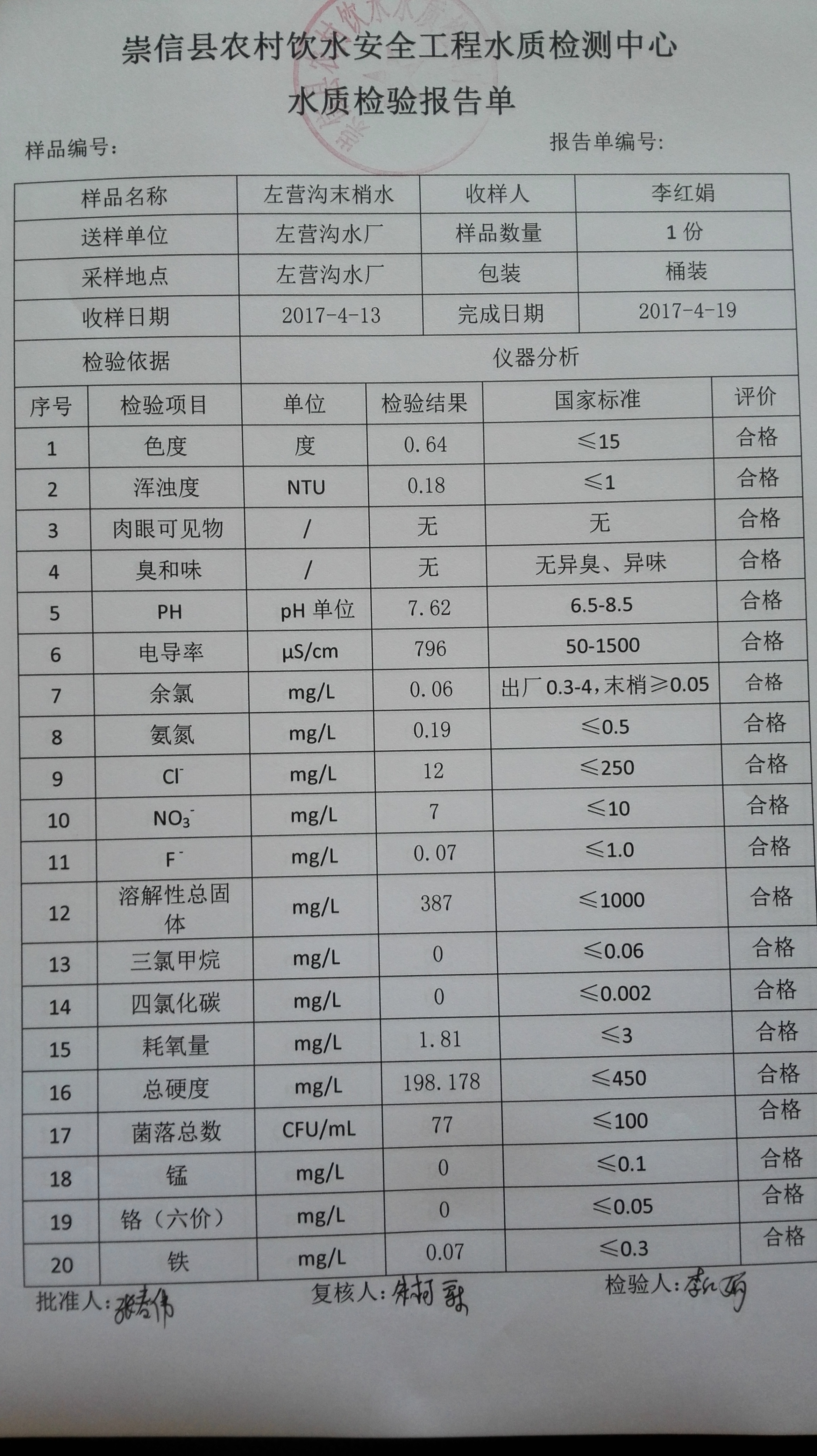2017年4月份左营沟水厂水质检测报告单 发文日期:2017-09-28 15:35 来源:崇信县水务局 作者:崇信水务局 编辑:崇信水务局 1506575596127 1506575609652 1506575620601 1506575677850 1506575691458 1506575703925 1506575718227 1506575728684 1506575744237 扫一扫在手机打开当前页 上一篇: 2017年5月份左营沟水厂水质检测报告单 下一篇: 2017年3月份左营沟水厂水质检测报告单