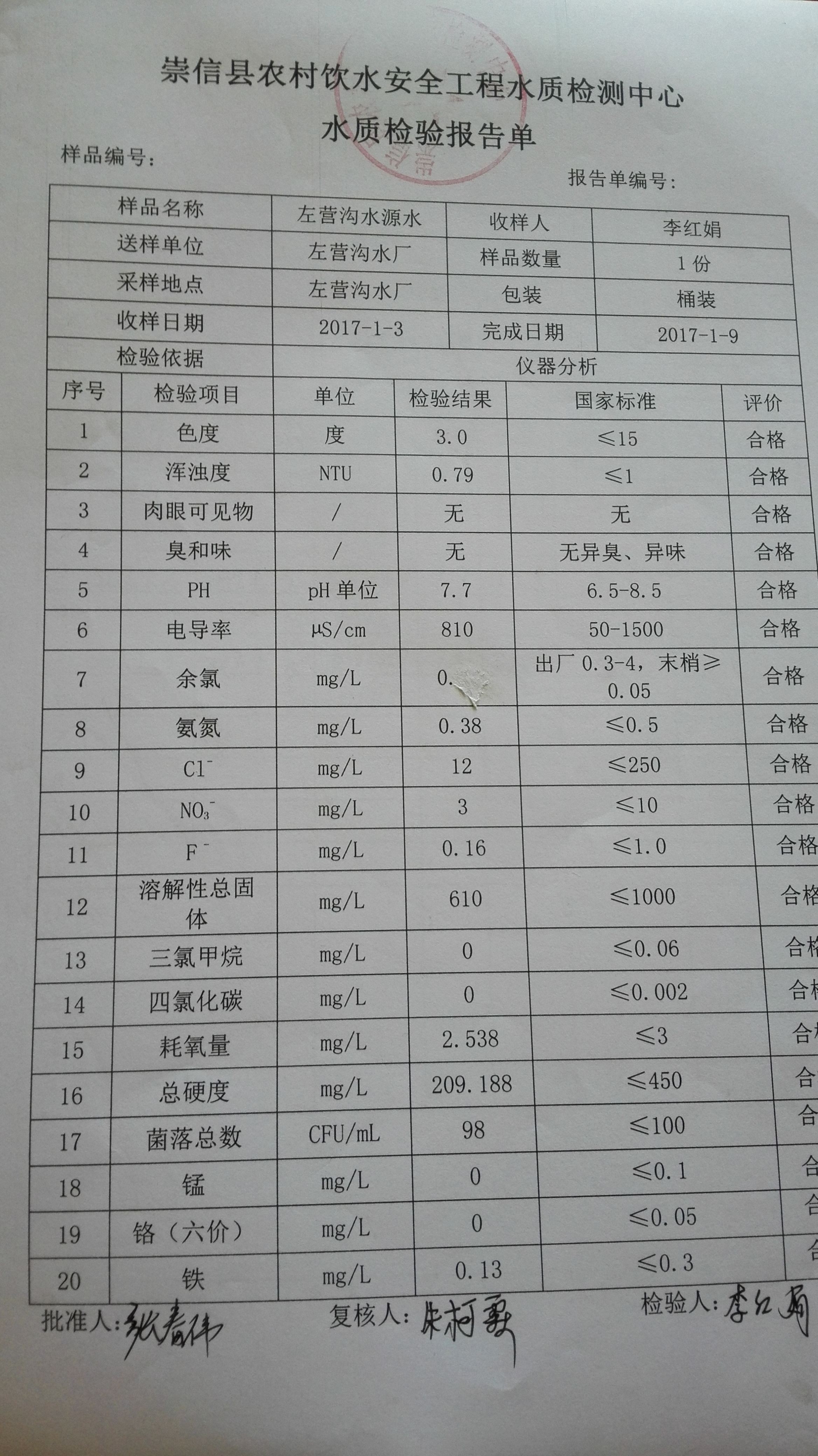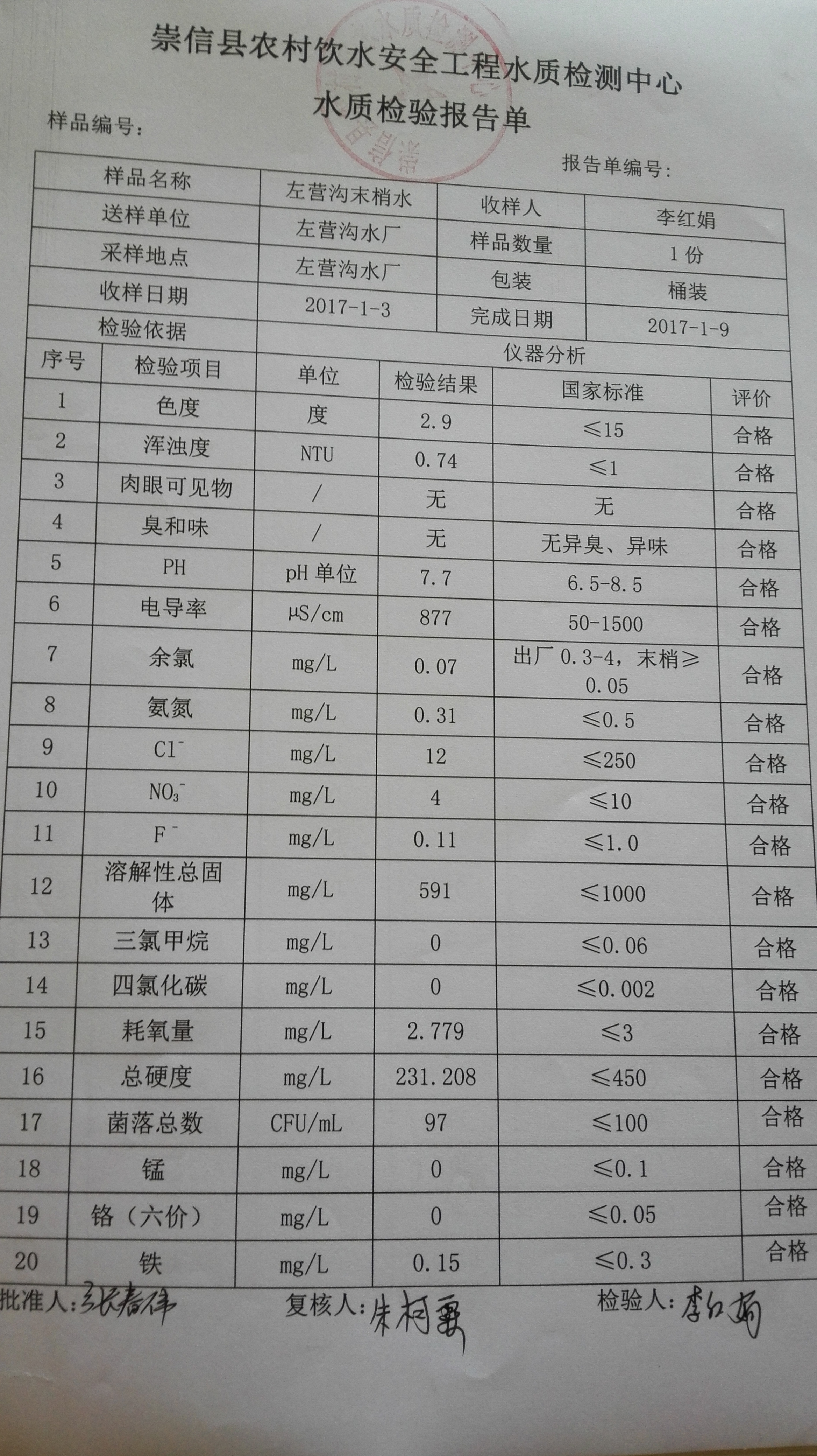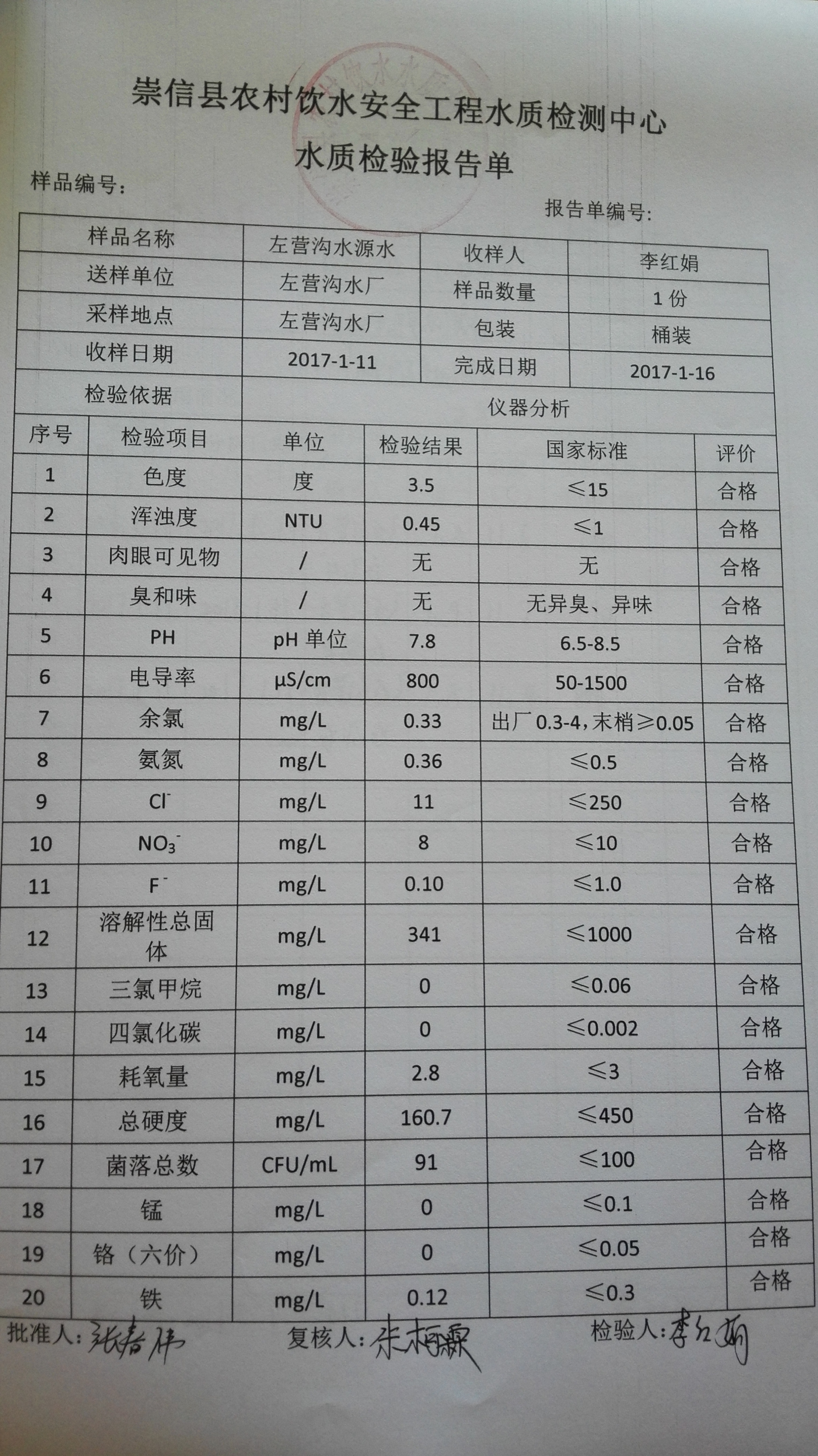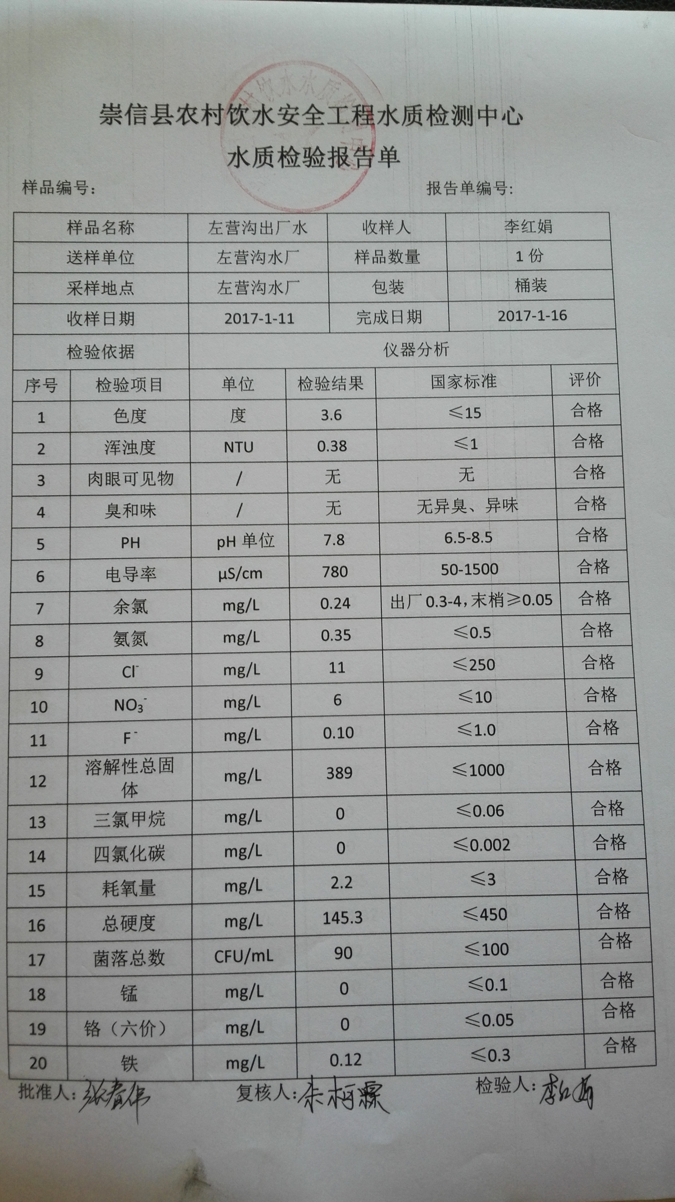 2017年1月份左营沟水厂水质检测报告单 发文日期:2017-09-28 13:43 来源:崇信县水务局 作者:崇信水务局 编辑:崇信水务局 1506575070634 1506575116420 1506575129663 1506575145368 1506575160956 1506575178777 1506575201244 1506575219089 1506575231609 扫一扫在手机打开当前页 上一篇: 2017年2月份左营沟水厂水质检测报告单 下一篇: 2017年6月份新窑水厂水质检测报告单