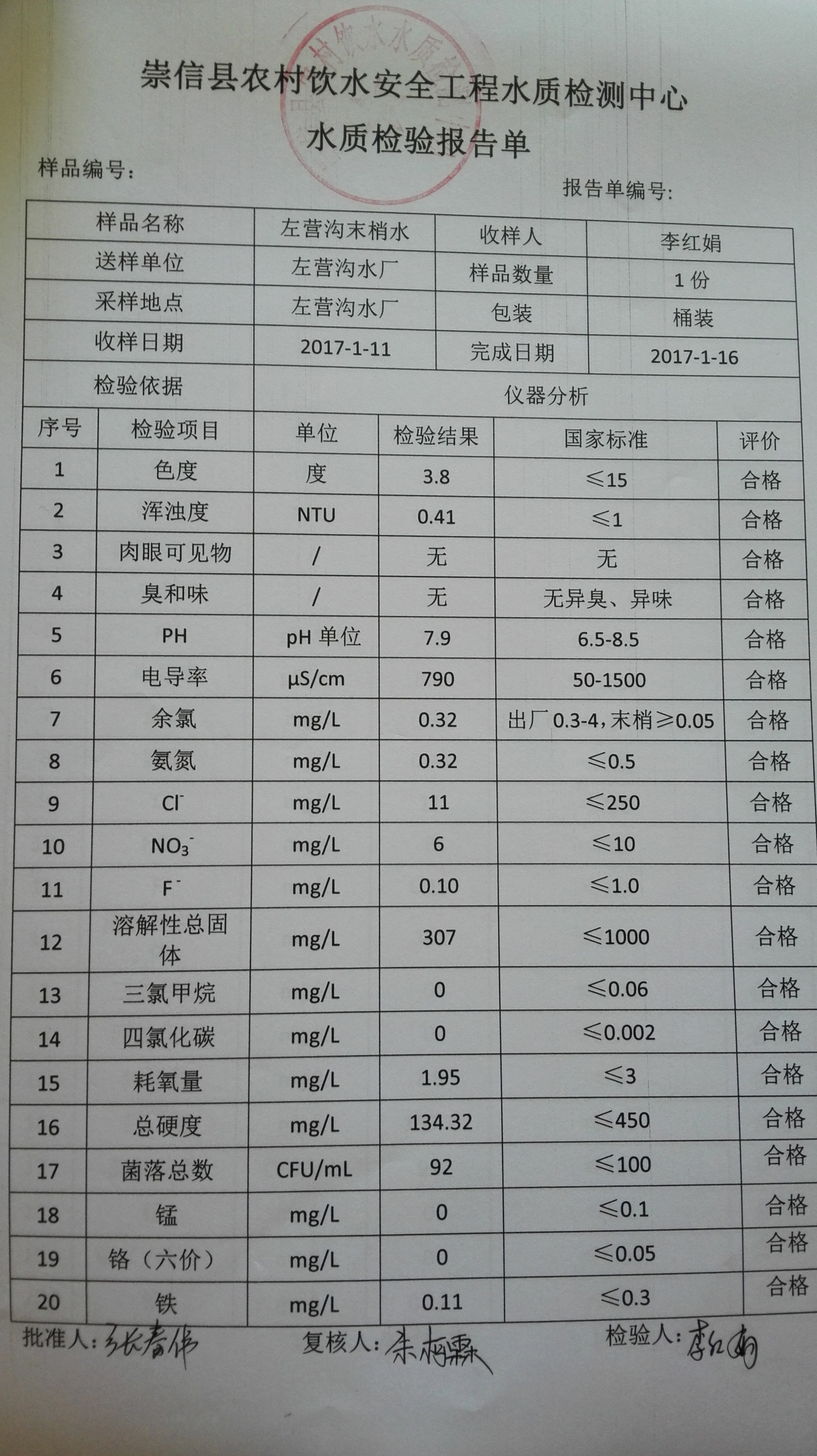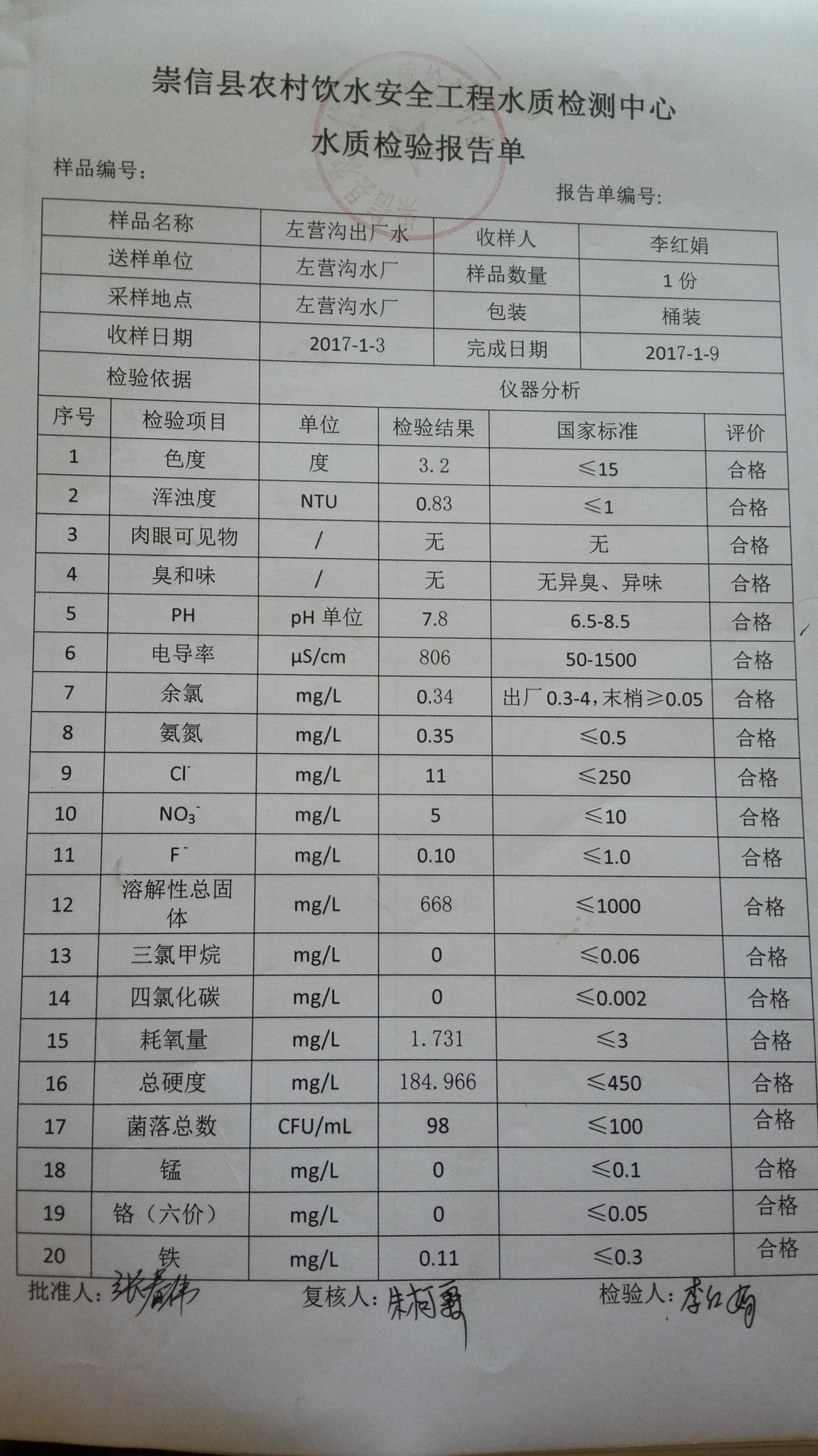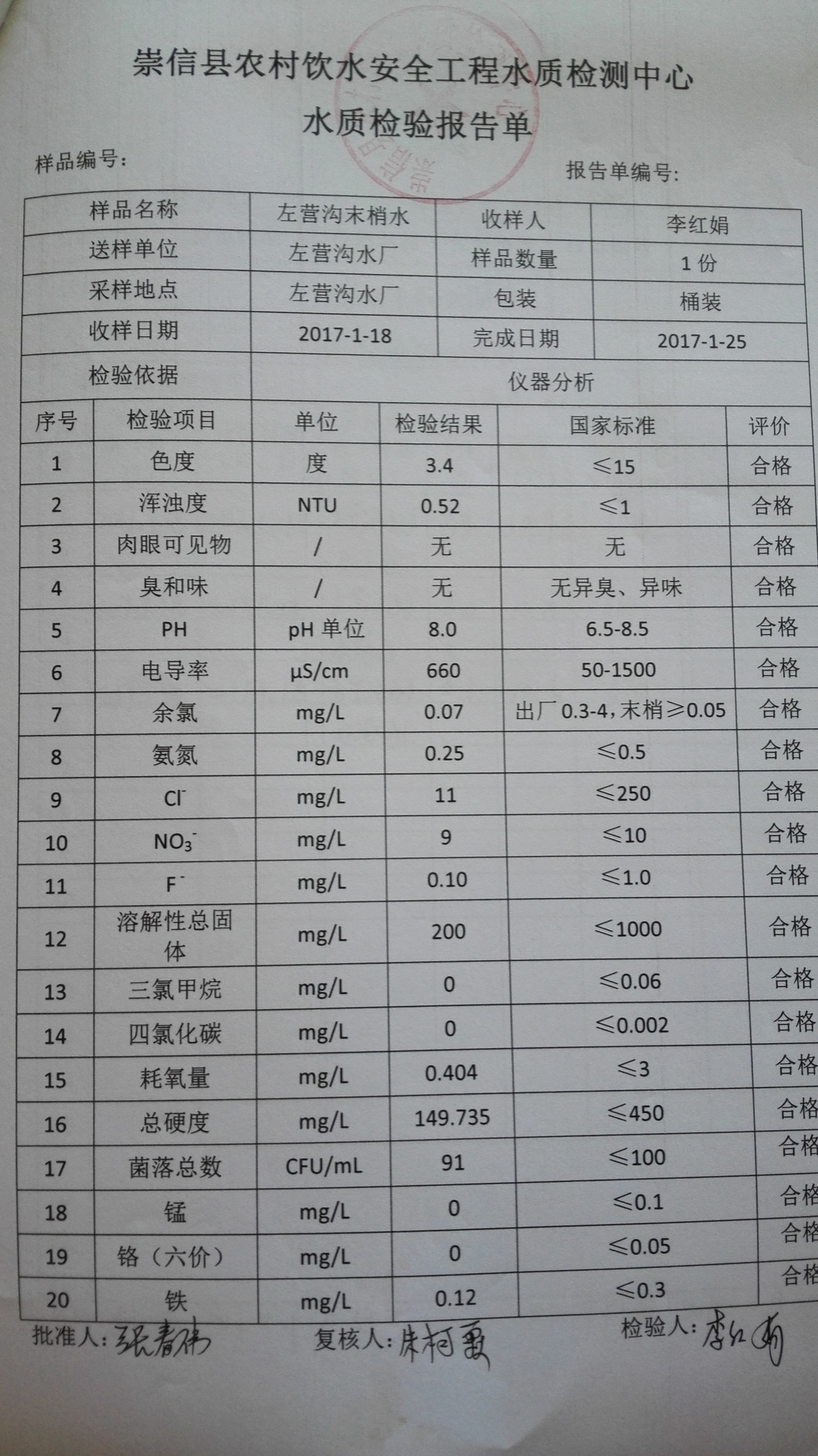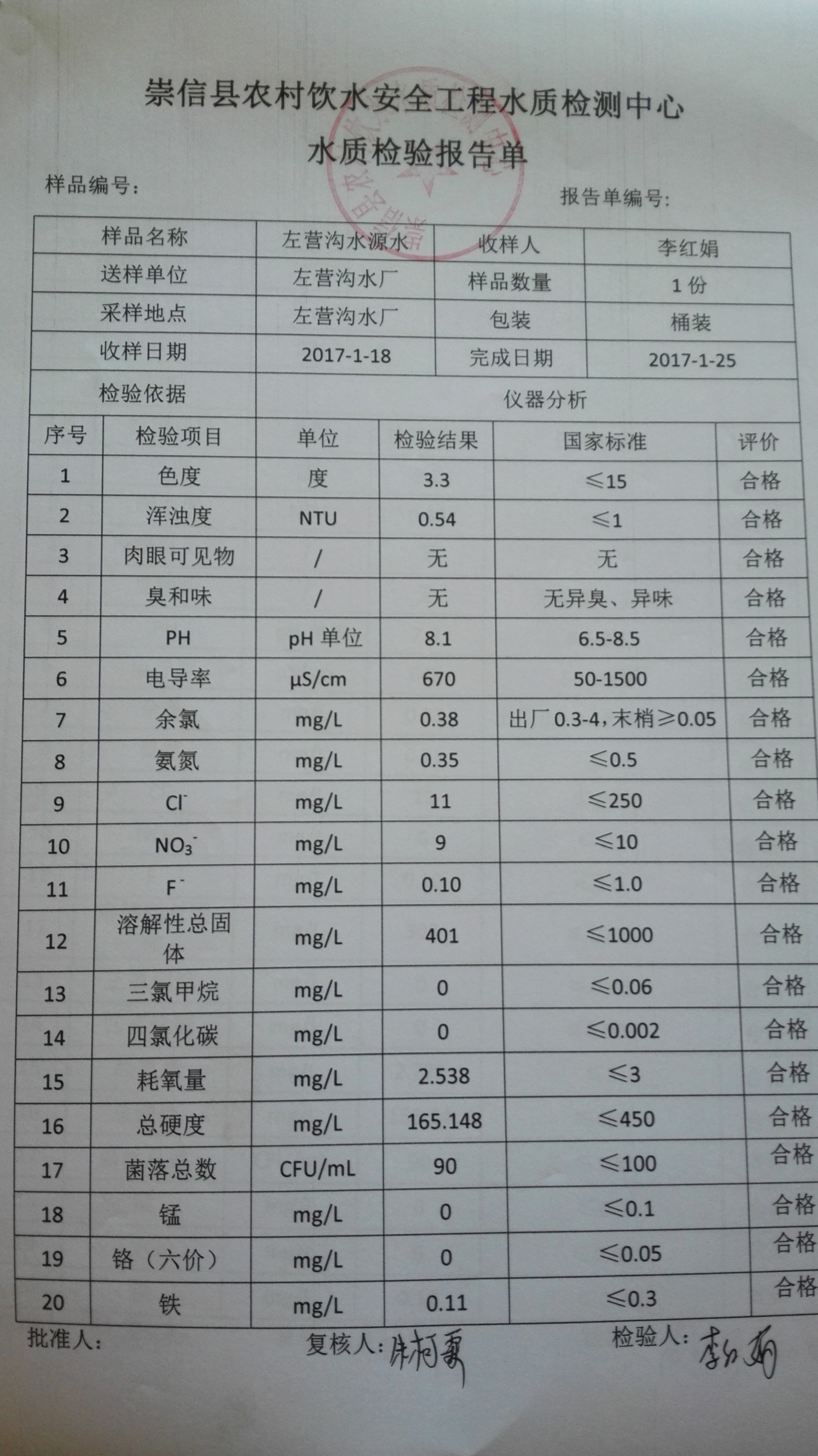 2017年1月份左营沟水厂水质检测报告单 发文日期:2017-09-28 13:43 来源:崇信县水务局 作者:崇信水务局 编辑:崇信水务局 1506575070634 1506575116420 1506575129663 1506575145368 1506575160956 1506575178777 1506575201244 1506575219089 1506575231609 扫一扫在手机打开当前页 上一篇: 2017年2月份左营沟水厂水质检测报告单 下一篇: 2017年6月份新窑水厂水质检测报告单