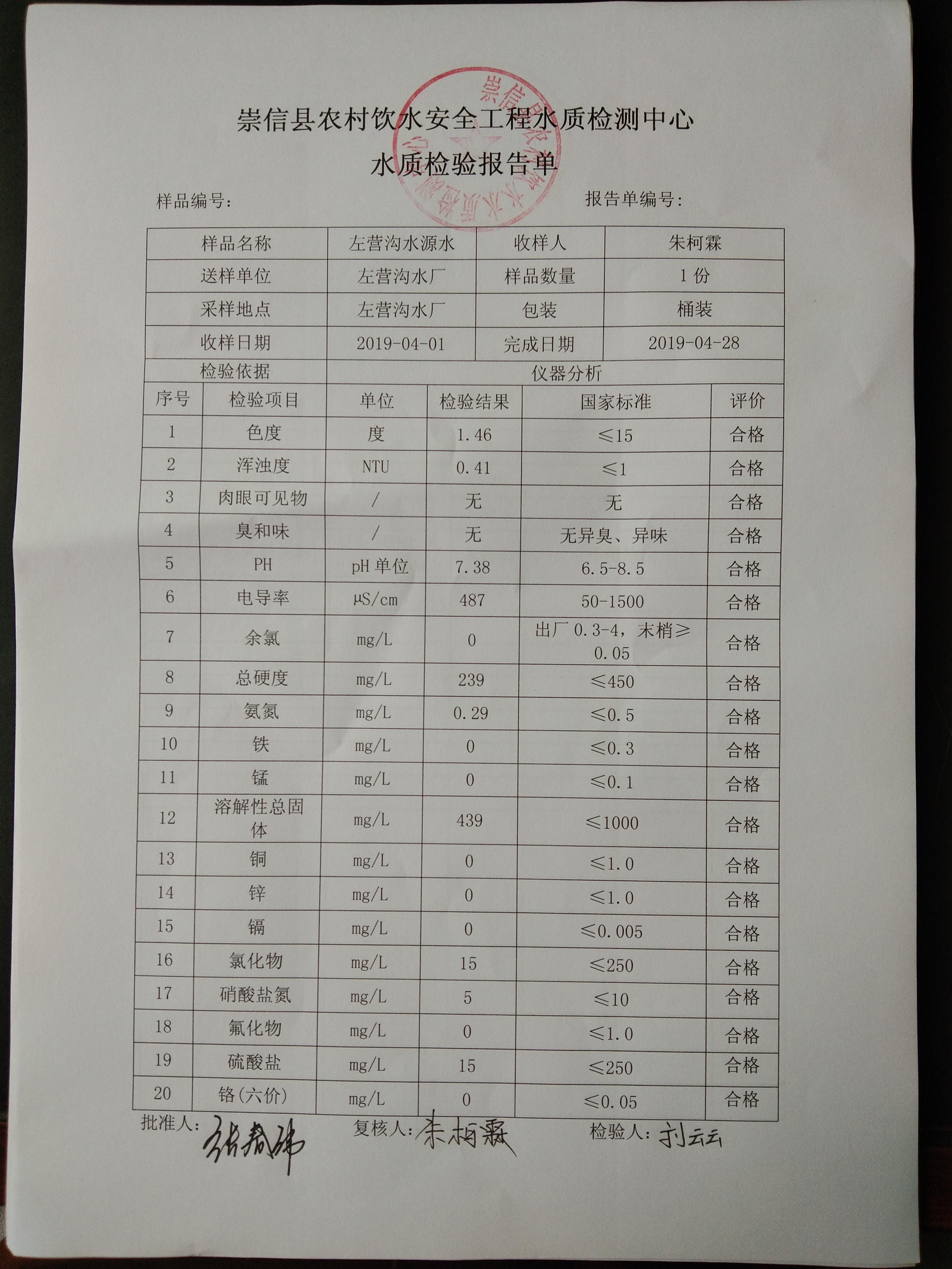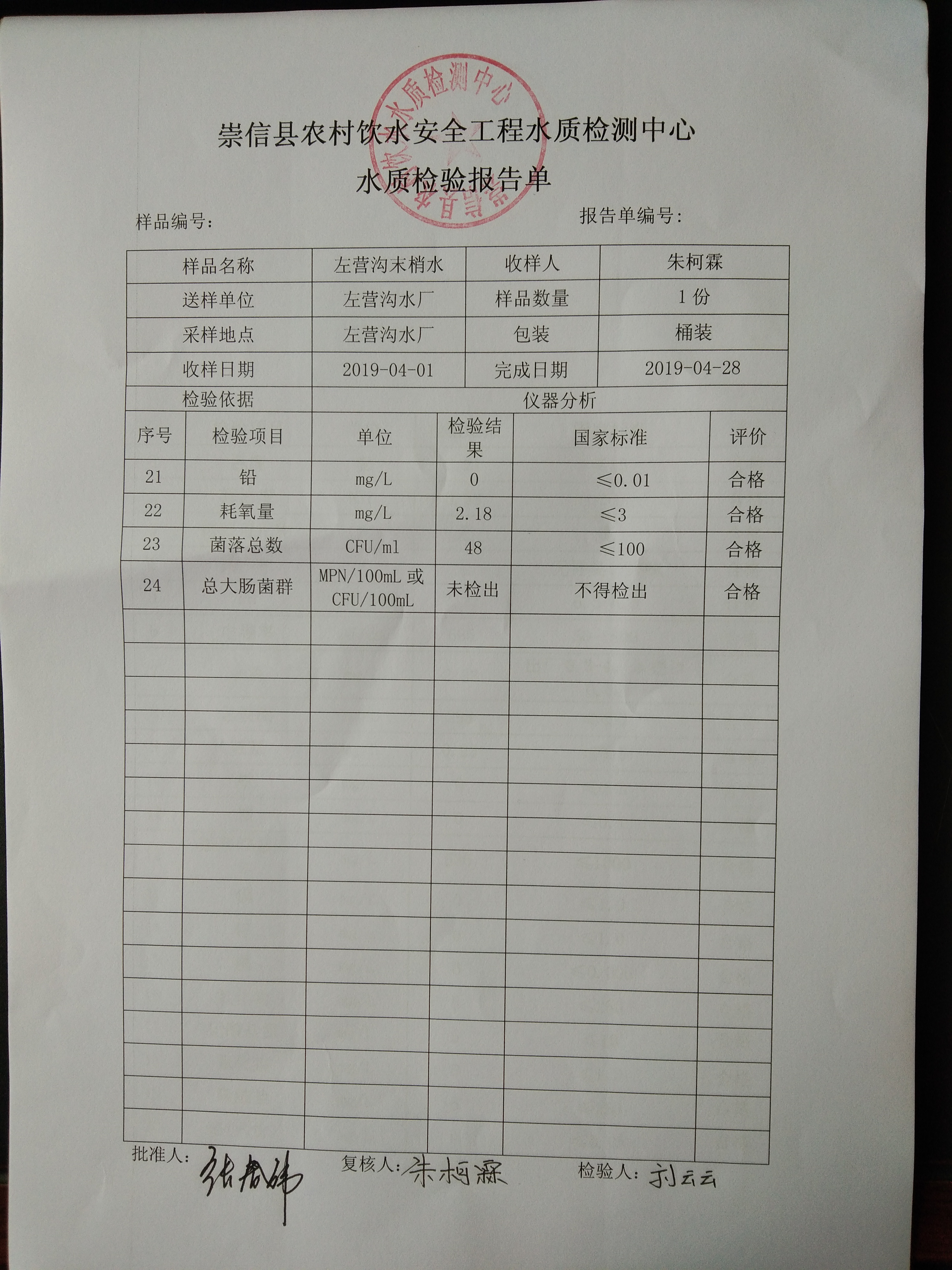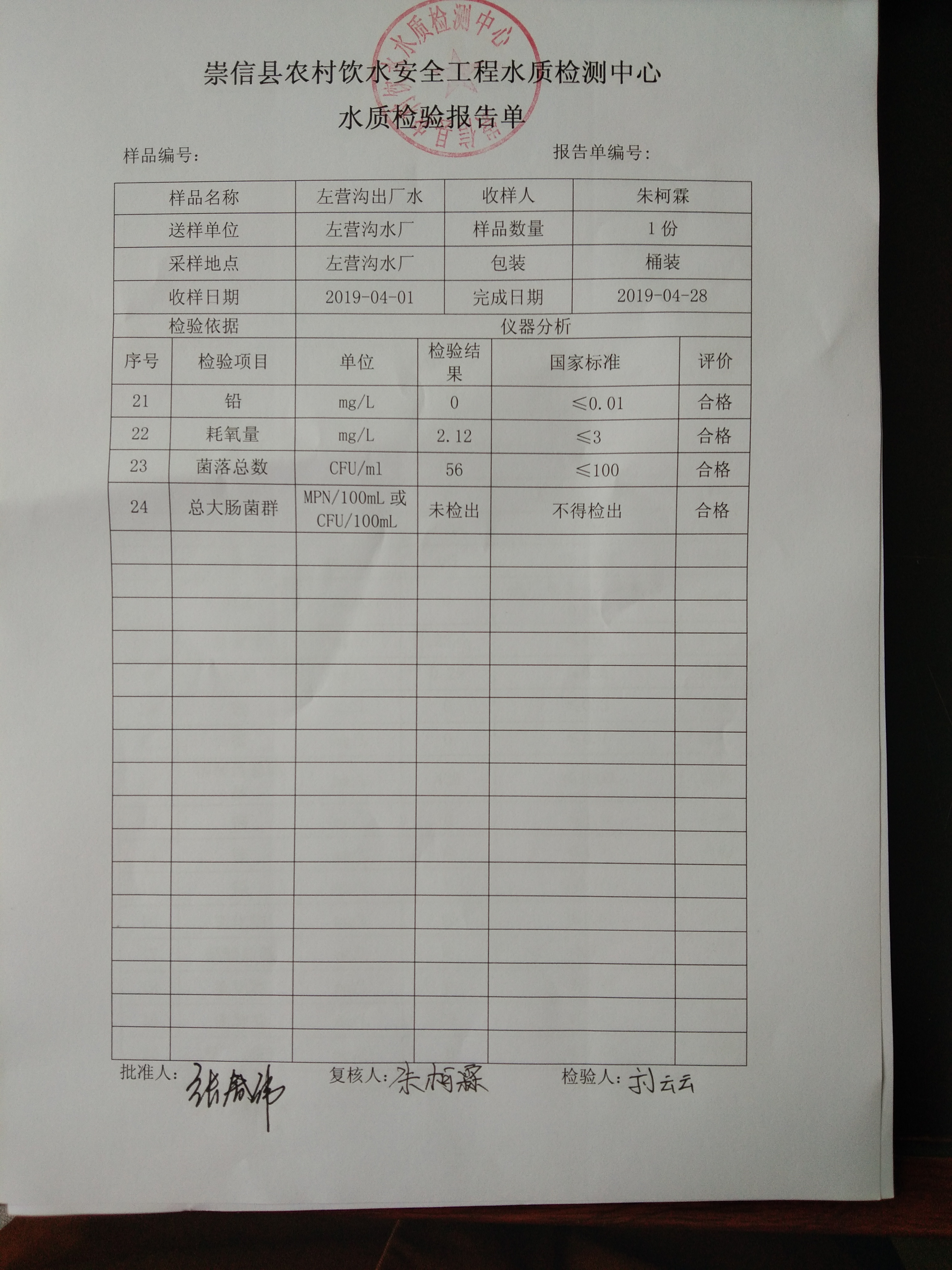2019年左营沟水厂水质检测报告 发文日期:2019-04-30 00:00 来源:崇信县水务局 作者:崇信水务局 编辑:崇信水务局 IMG_20190430_100846 IMG_20190430_100854 IMG_20190430_100901 IMG_20190430_100907 IMG_20190430_100912 IMG_20190430_100919 扫一扫在手机打开当前页 上一篇: 2019年3月水质化验报告单 下一篇: 2019年4月散花沟水厂水质检测报告