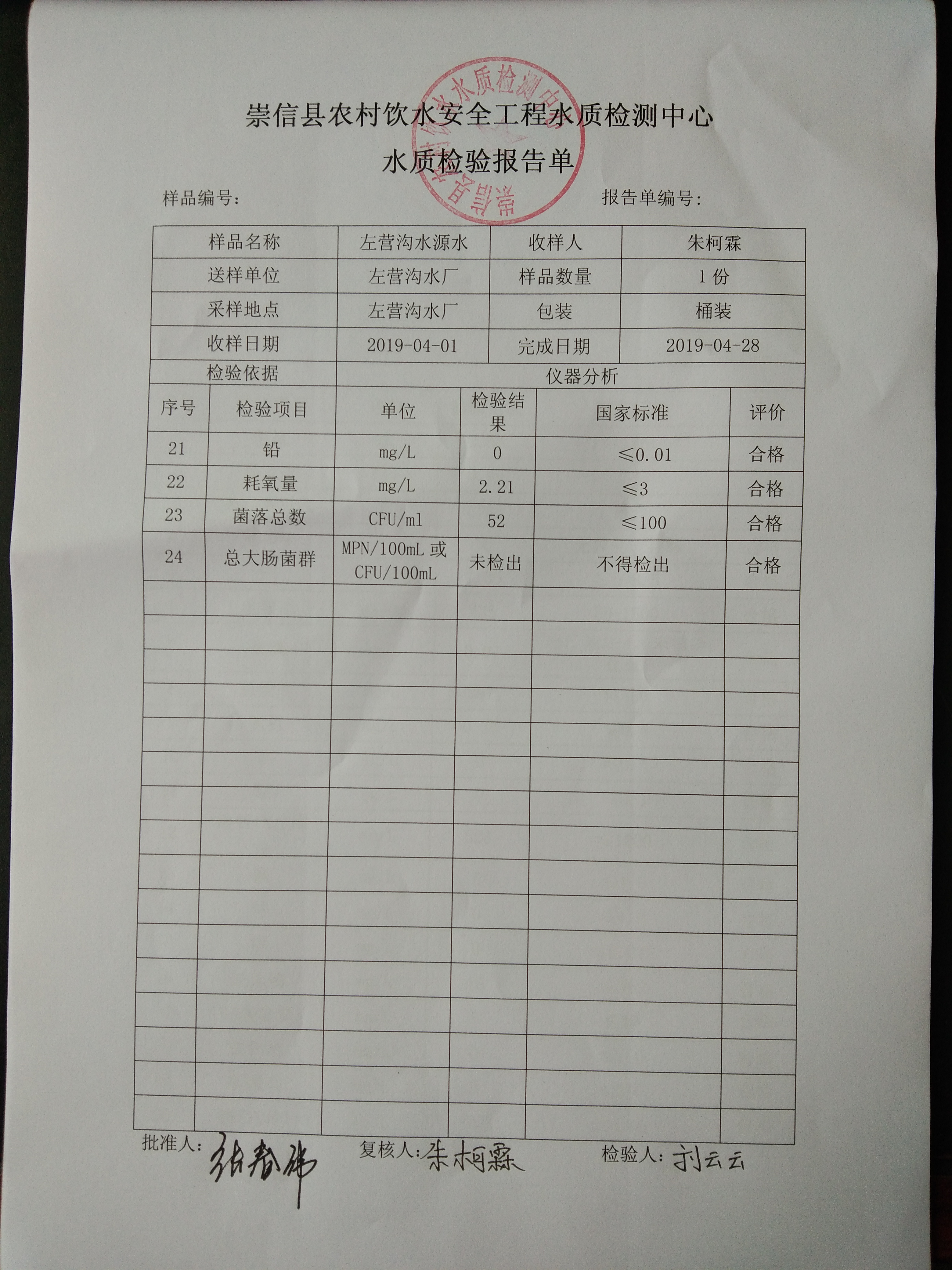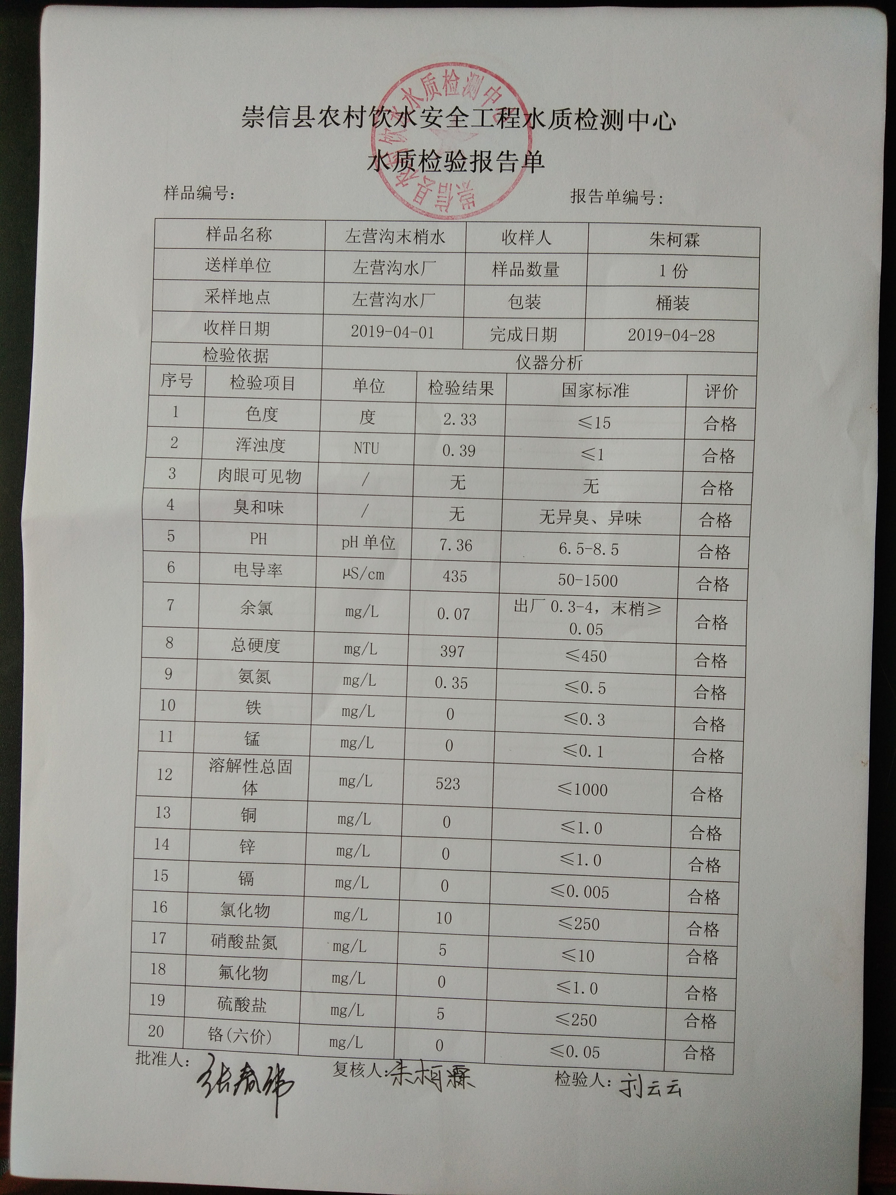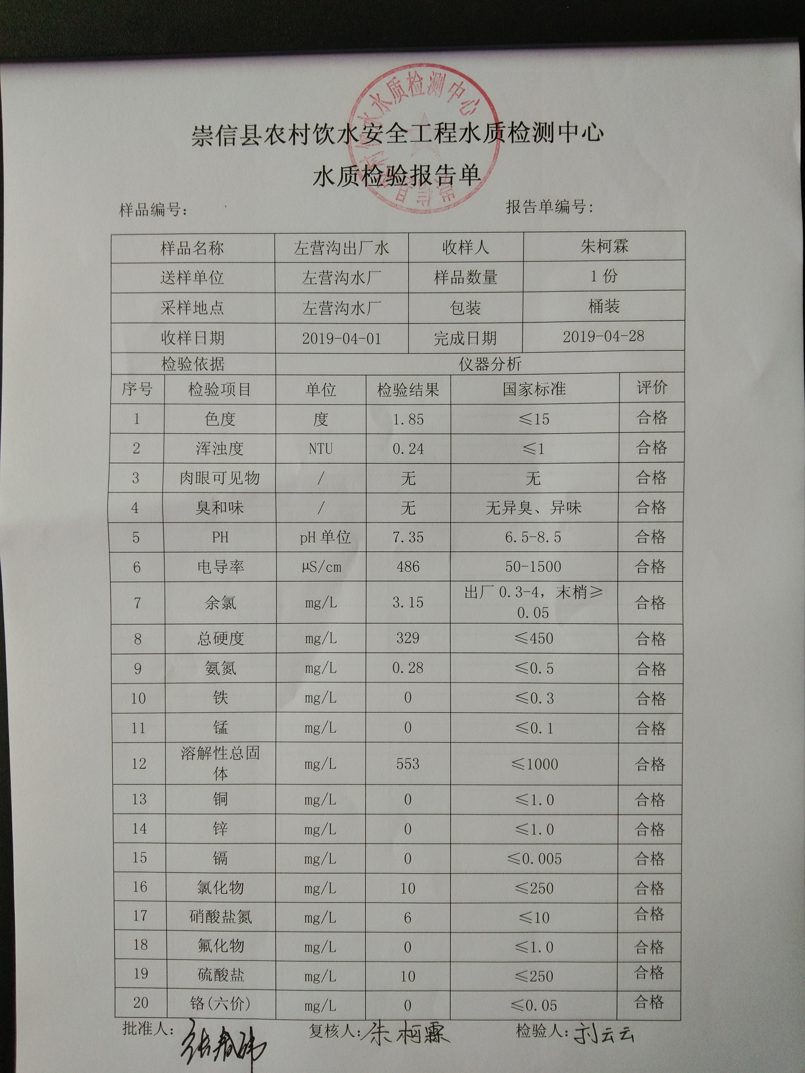 2019年左营沟水厂水质检测报告 发文日期:2019-04-30 00:00 来源:崇信县水务局 作者:崇信水务局 编辑:崇信水务局 IMG_20190430_100846 IMG_20190430_100854 IMG_20190430_100901 IMG_20190430_100907 IMG_20190430_100912 IMG_20190430_100919 扫一扫在手机打开当前页 上一篇: 2019年3月水质化验报告单 下一篇: 2019年4月散花沟水厂水质检测报告
