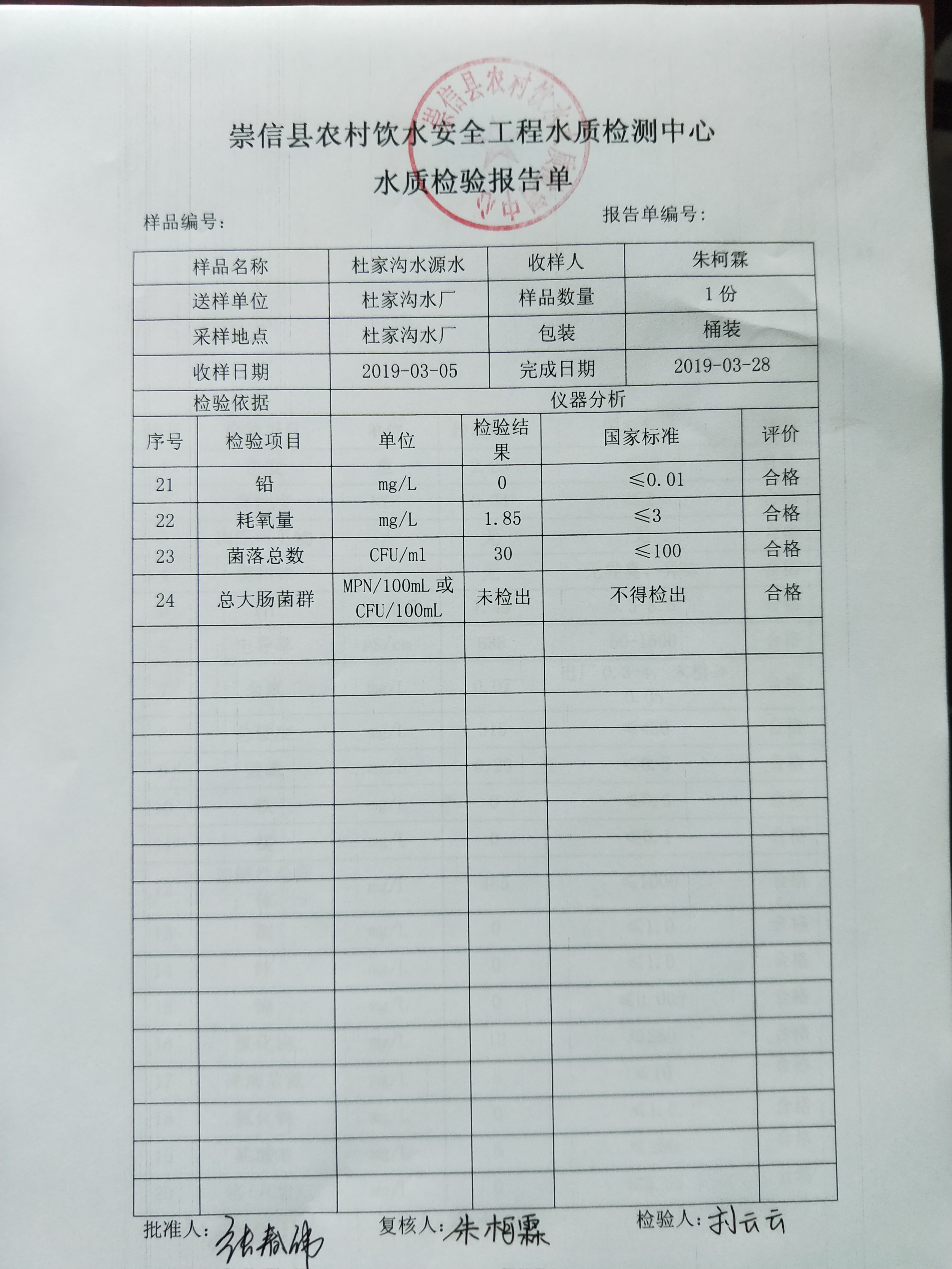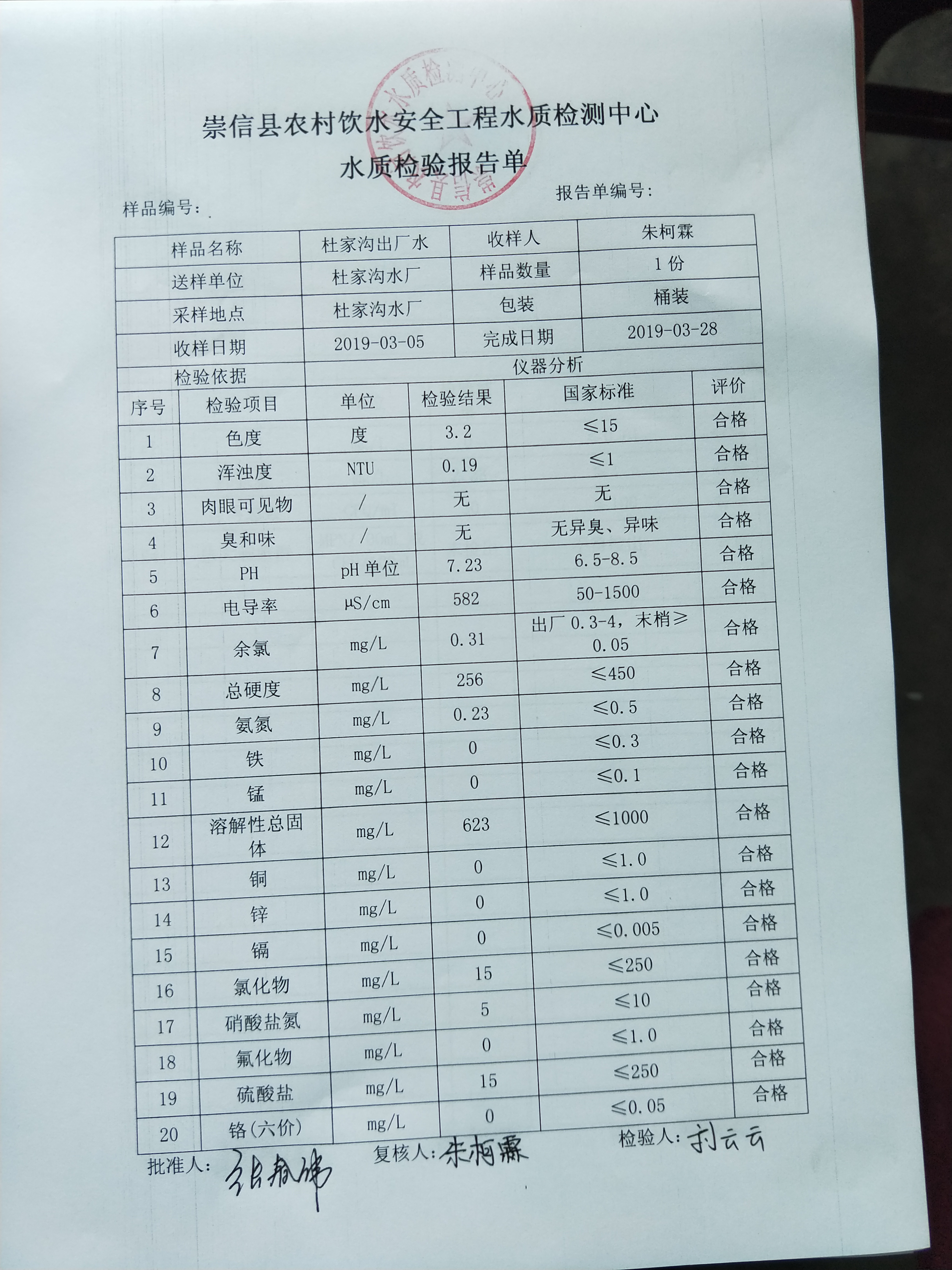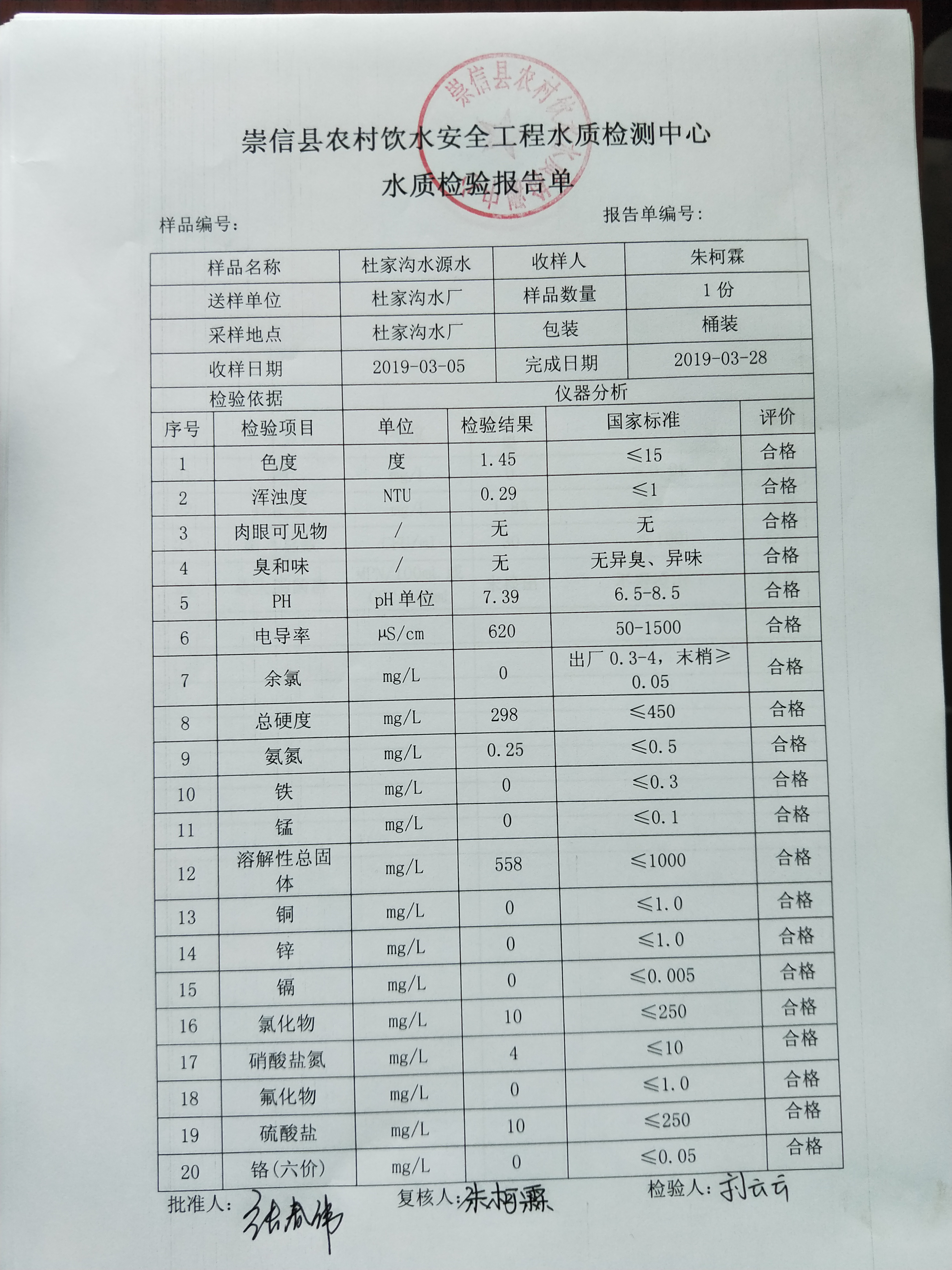 2019年3月杜家沟水厂水质检测报告单 发文日期:2019-04-08 16:17 来源:崇信县水务局 作者:崇信水务局 编辑:崇信水务局 IMG20190408150649 IMG20190408150620 IMG20190408150626 IMG20190408150632 IMG20190408150638 IMG20190408150643 扫一扫在手机打开当前页 上一篇: 2019年3月新窑水厂水质检测报告 下一篇: 2019年3月左营沟水厂水质检测报告单