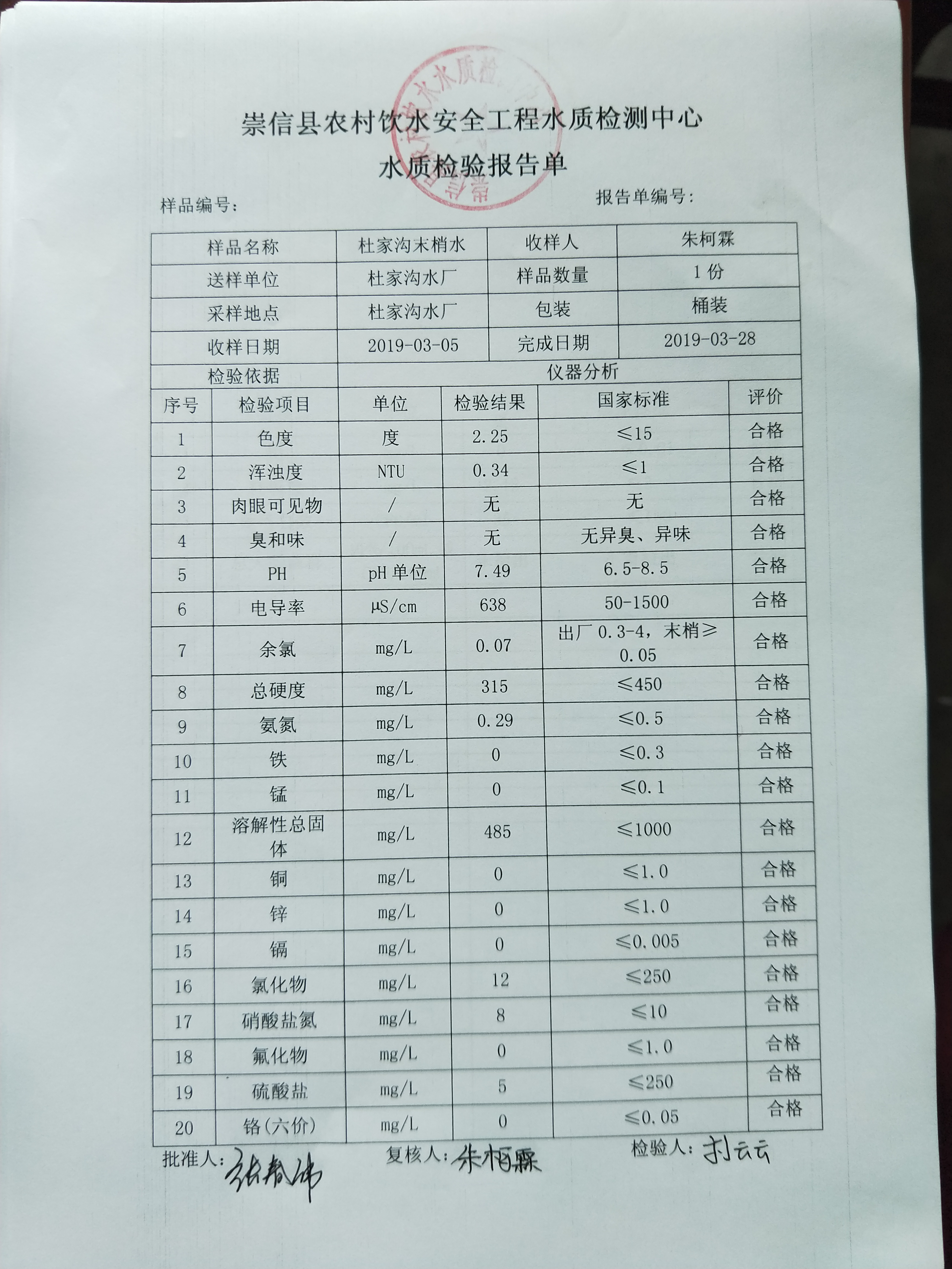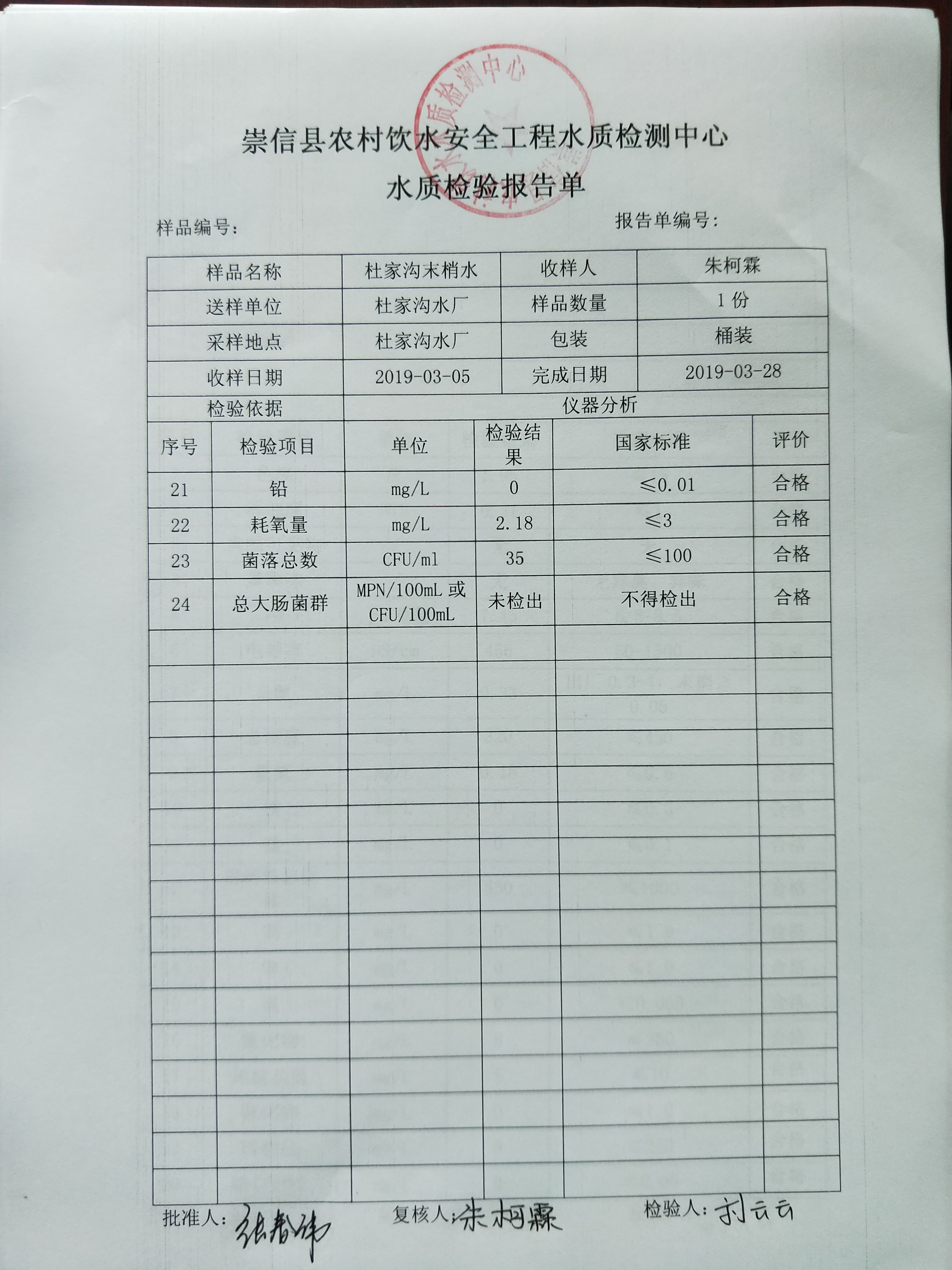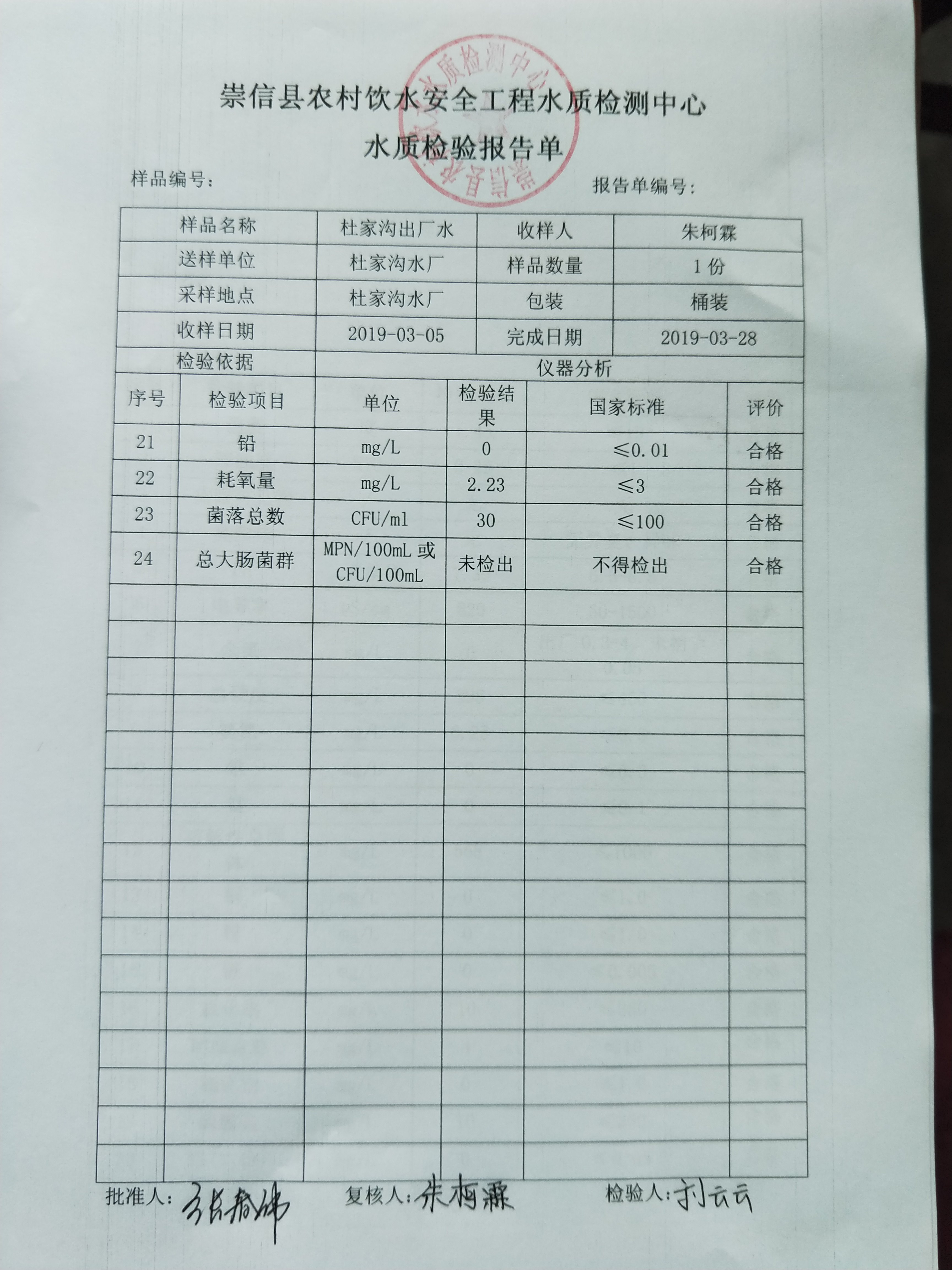 2019年3月杜家沟水厂水质检测报告单 发文日期:2019-04-08 16:17 来源:崇信县水务局 作者:崇信水务局 编辑:崇信水务局 IMG20190408150649 IMG20190408150620 IMG20190408150626 IMG20190408150632 IMG20190408150638 IMG20190408150643 扫一扫在手机打开当前页 上一篇: 2019年3月新窑水厂水质检测报告 下一篇: 2019年3月左营沟水厂水质检测报告单