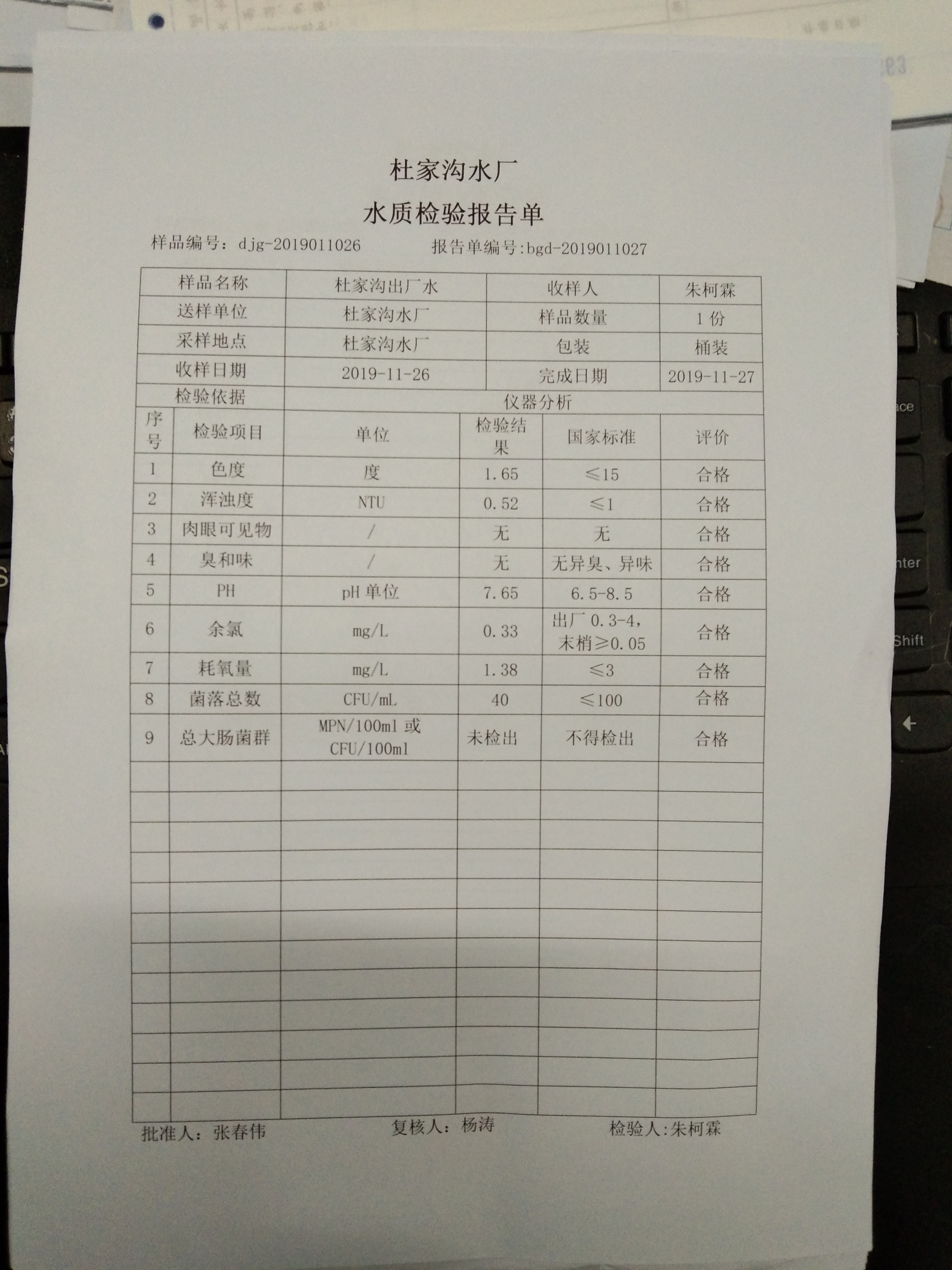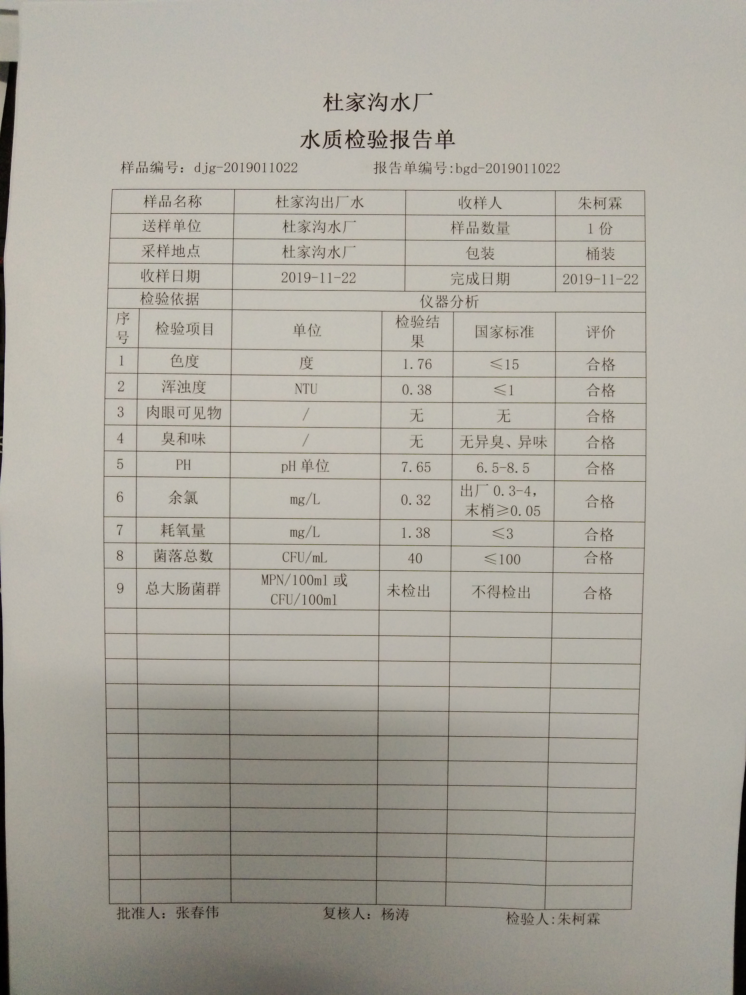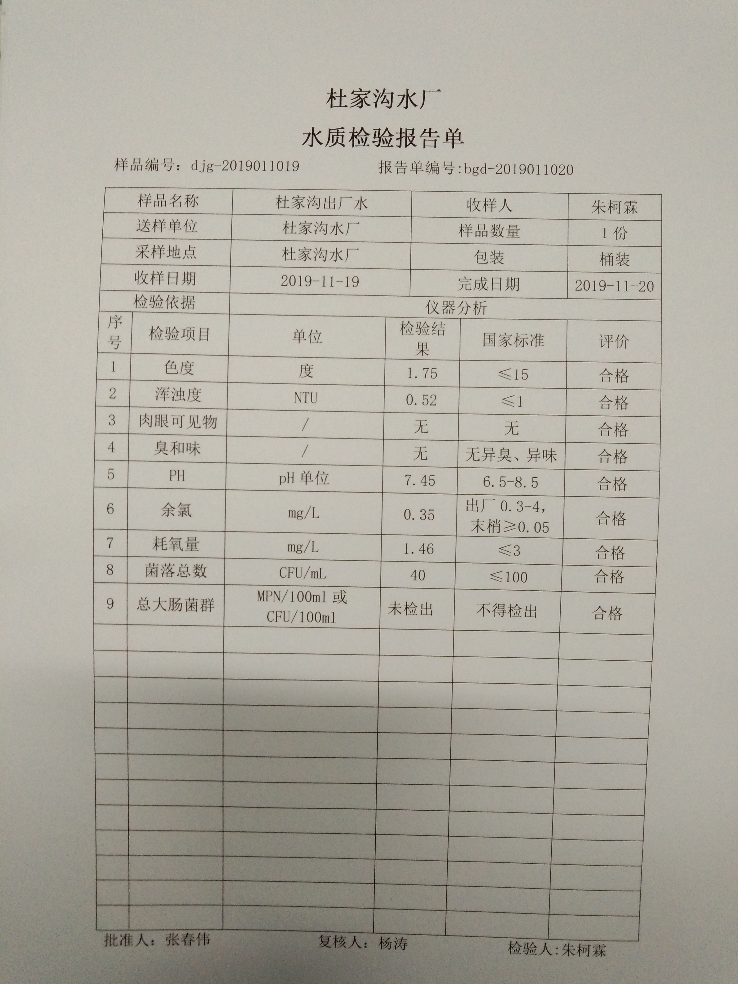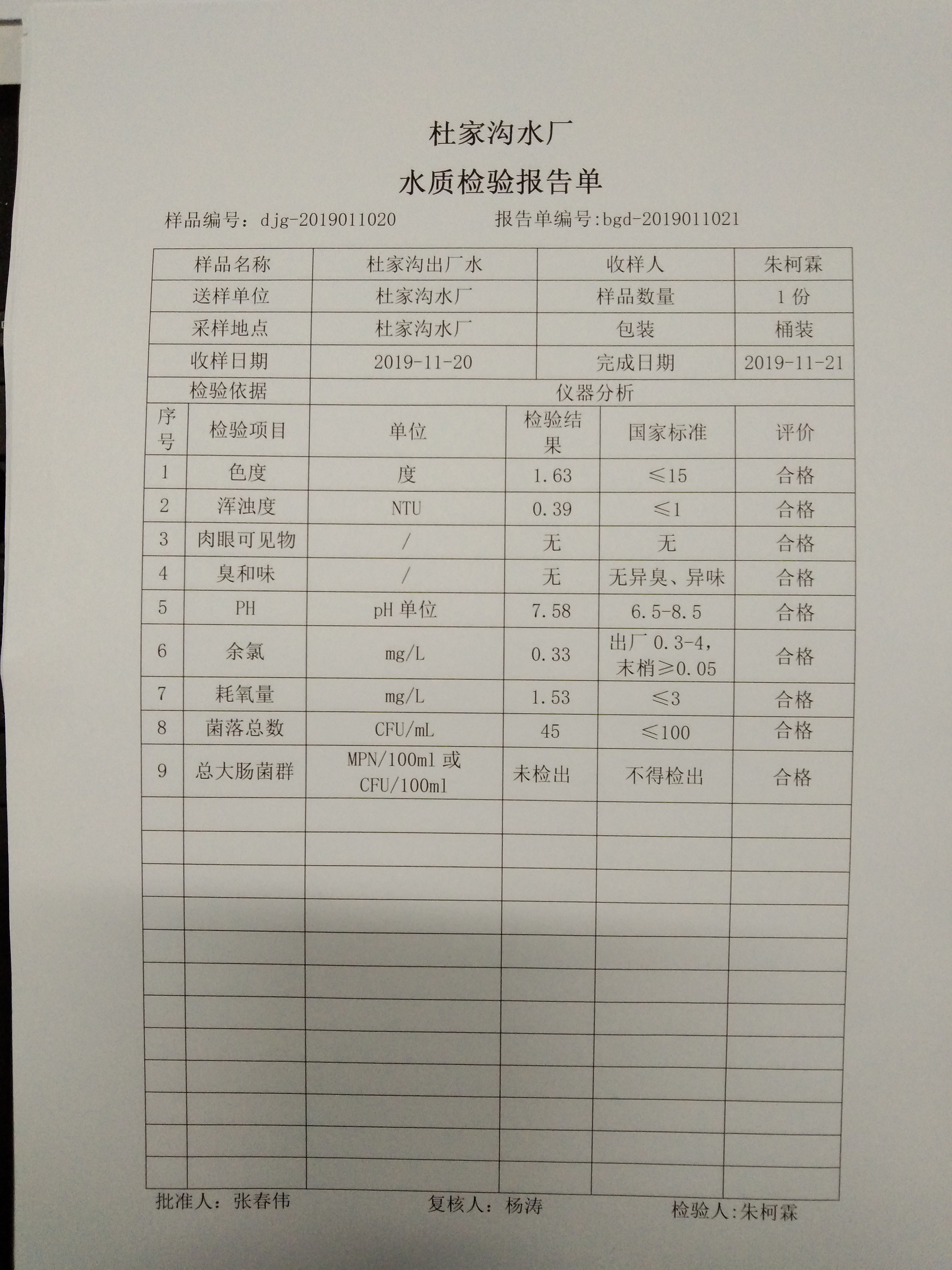2019年杜家沟水厂11月份下半月水质检验报告单 发文日期:2019-12-24 00:00 来源:机构分类-崇信信息公开 作者:崇信水务局 编辑:崇信水务局 IMG_20191224_172928 IMG_20191224_172933 IMG_20191224_172937 IMG_20191224_172942 IMG_20191224_172949 IMG_20191224_172955 IMG_20191224_173016 IMG_20191224_173033 扫一扫在手机打开当前页 上一篇: 2019年杜家沟水厂10月份上半月水质检验报告单 下一篇: 2019年杜家沟水厂11月份上半月水质检验报告单