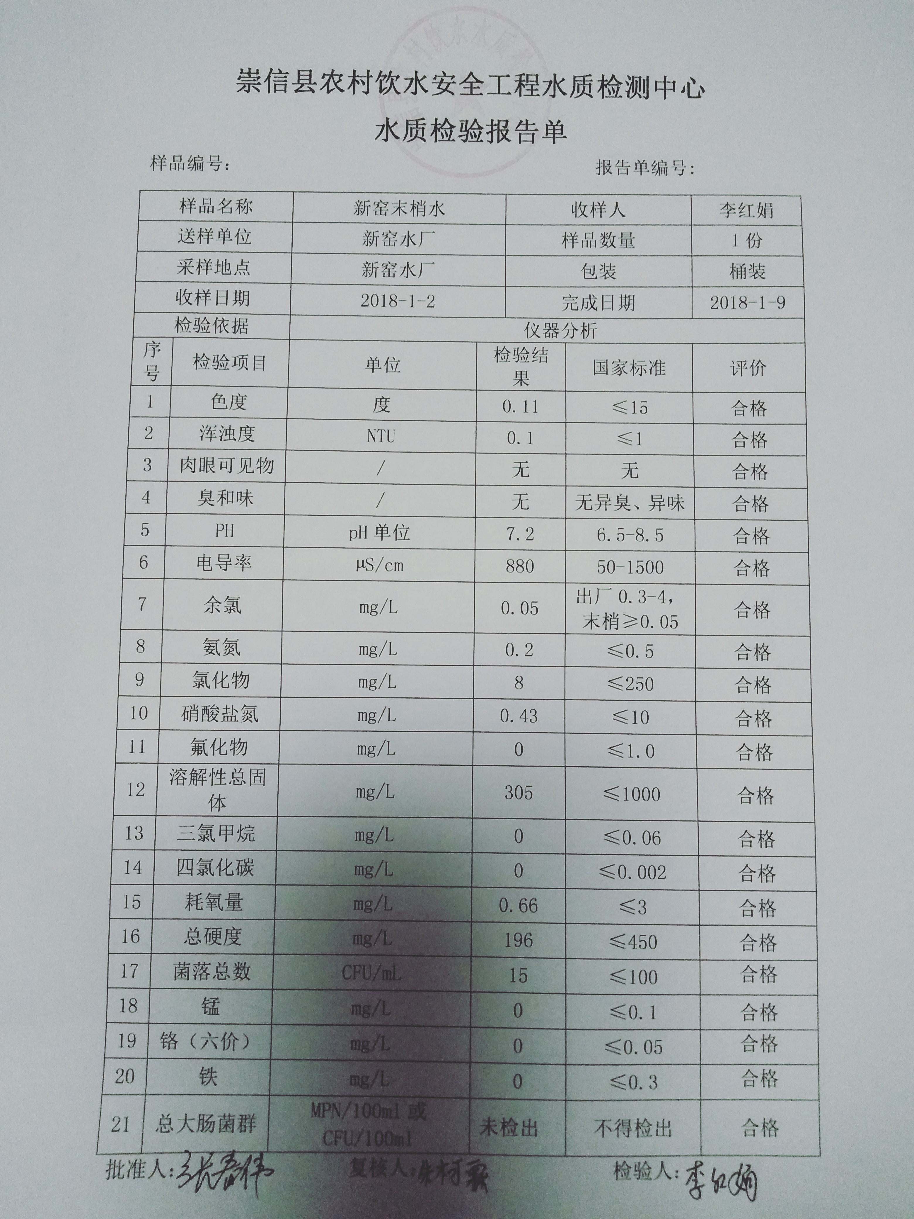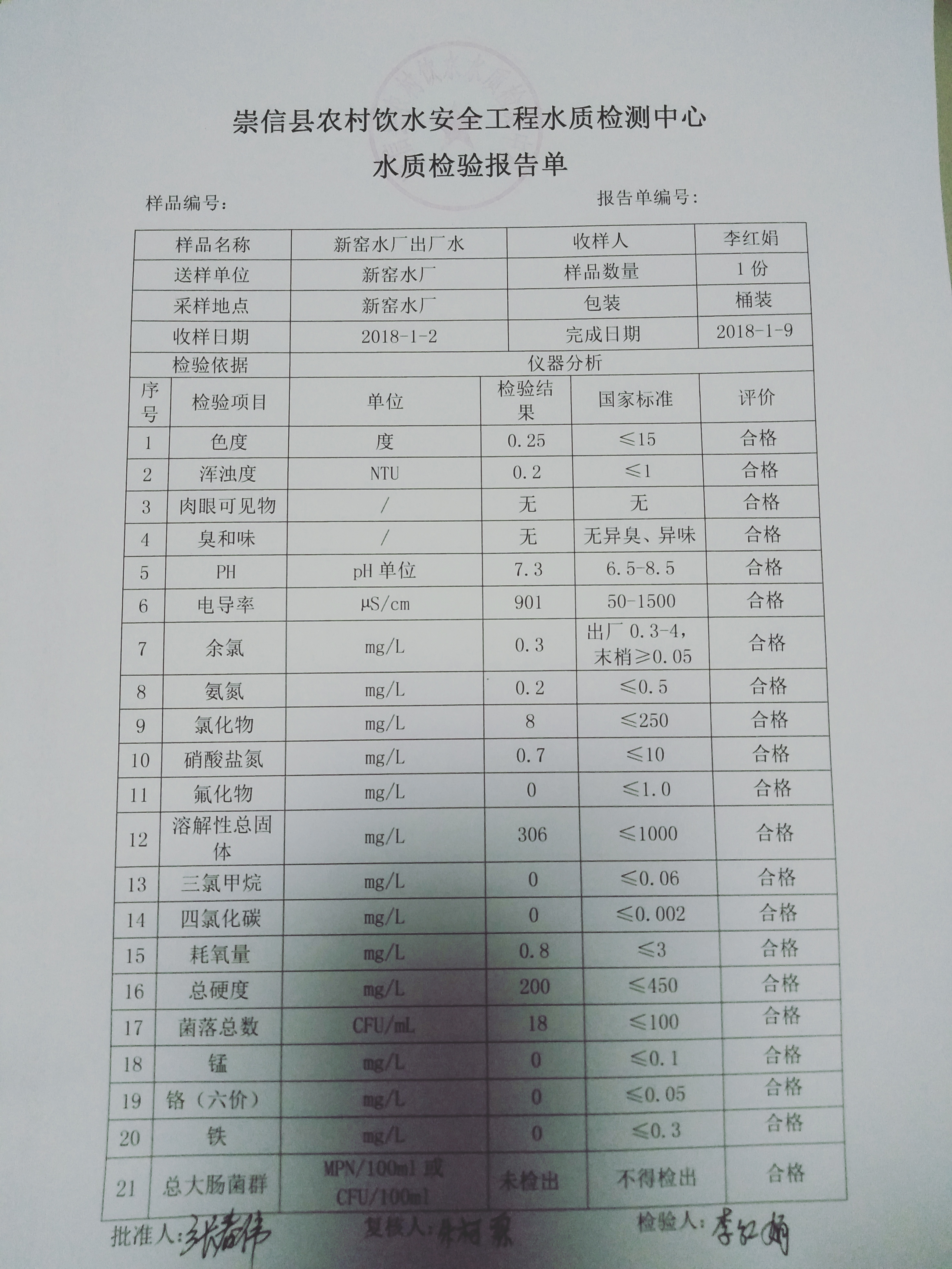 2018年1月份新窑水厂水质检测报告单