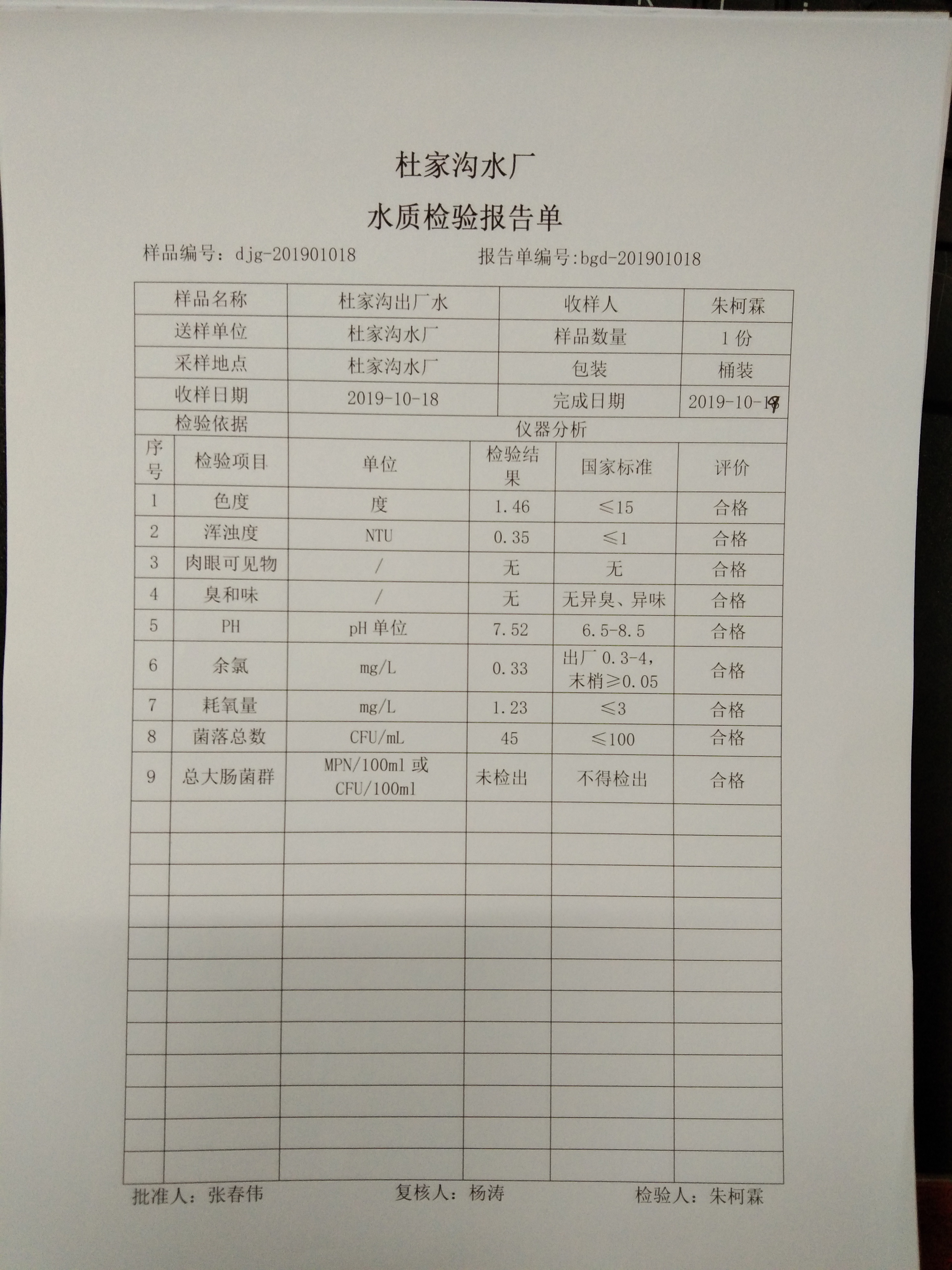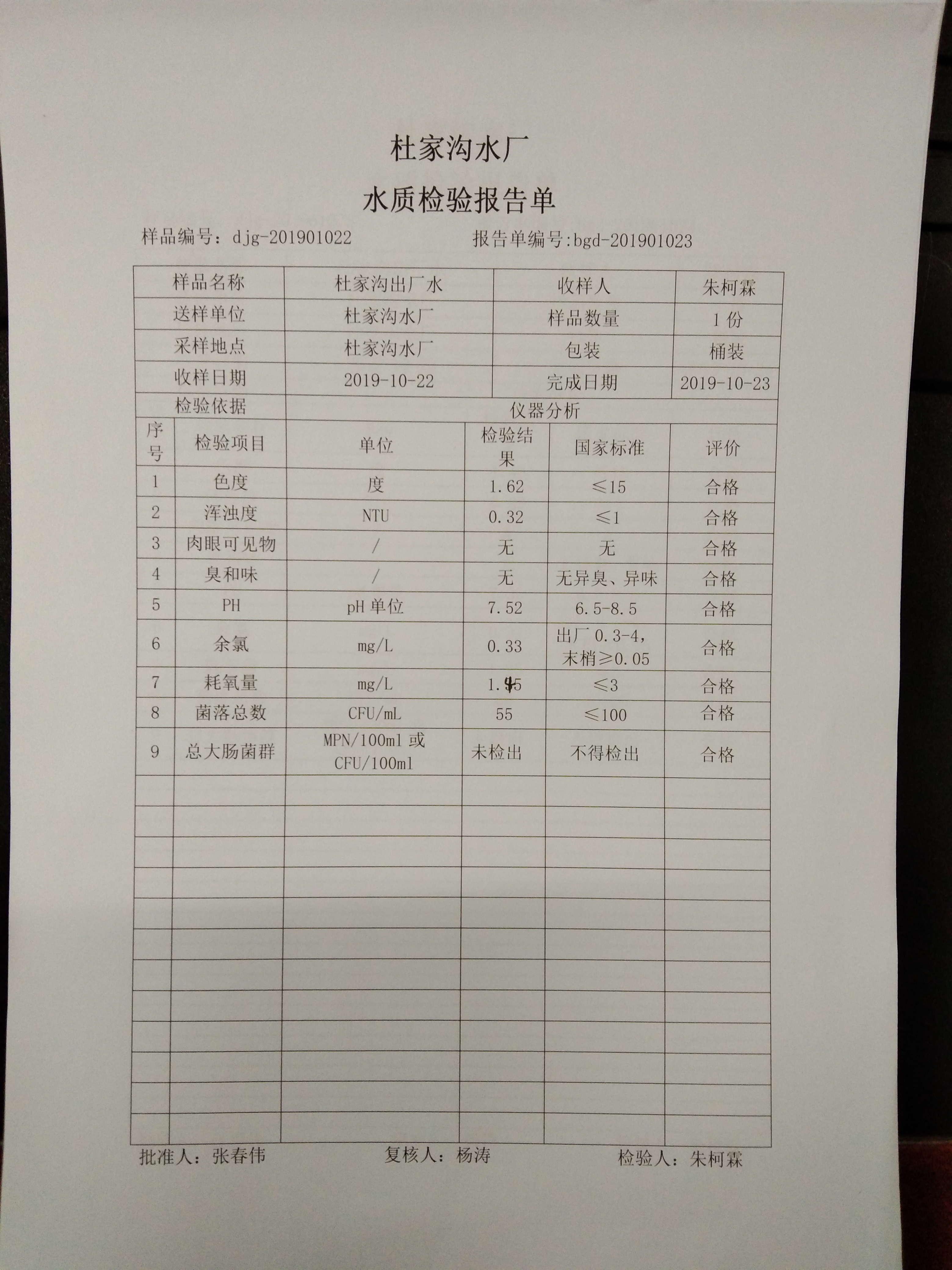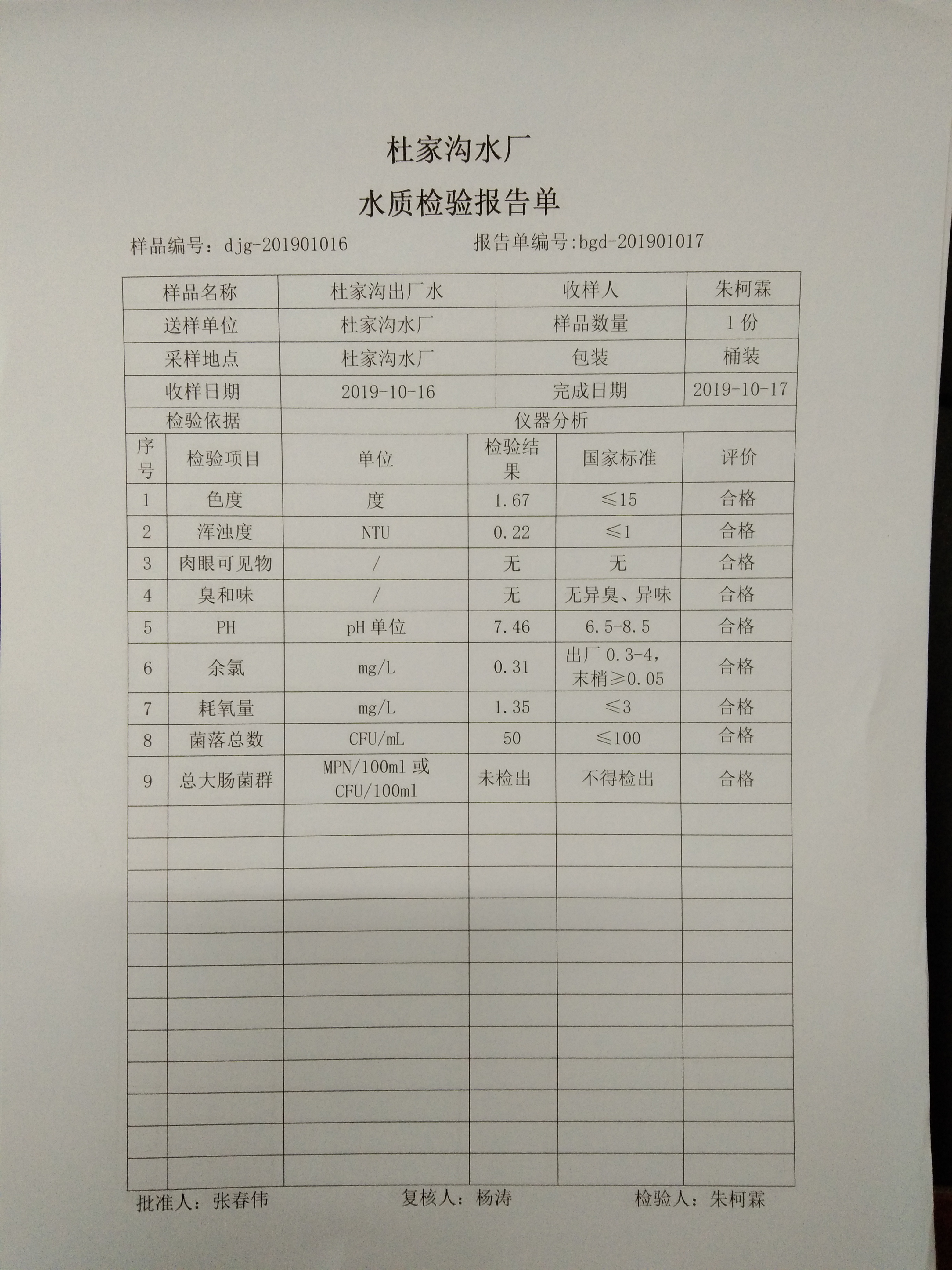 2019年杜家沟水厂10月份下半月水质检验报告单