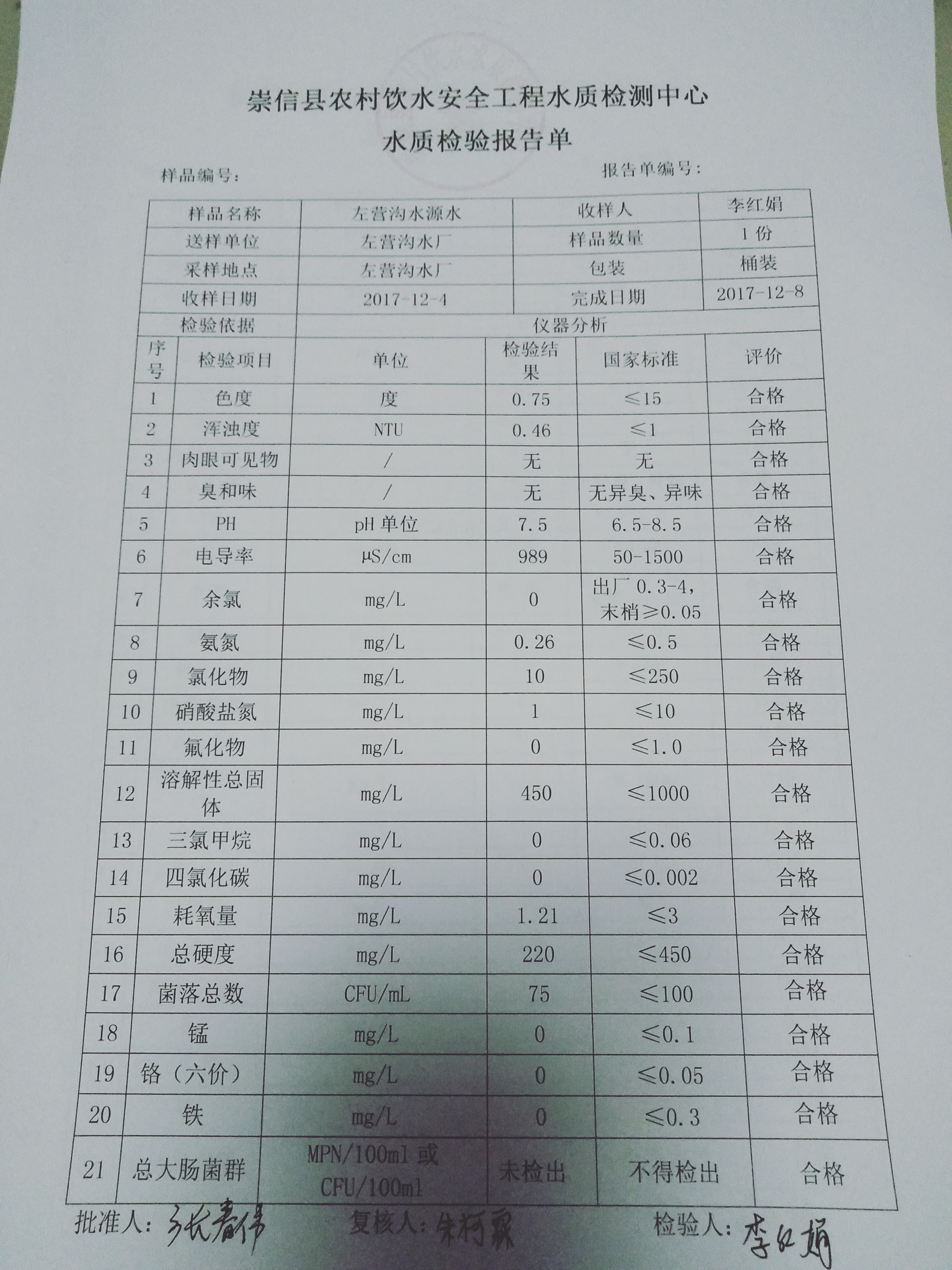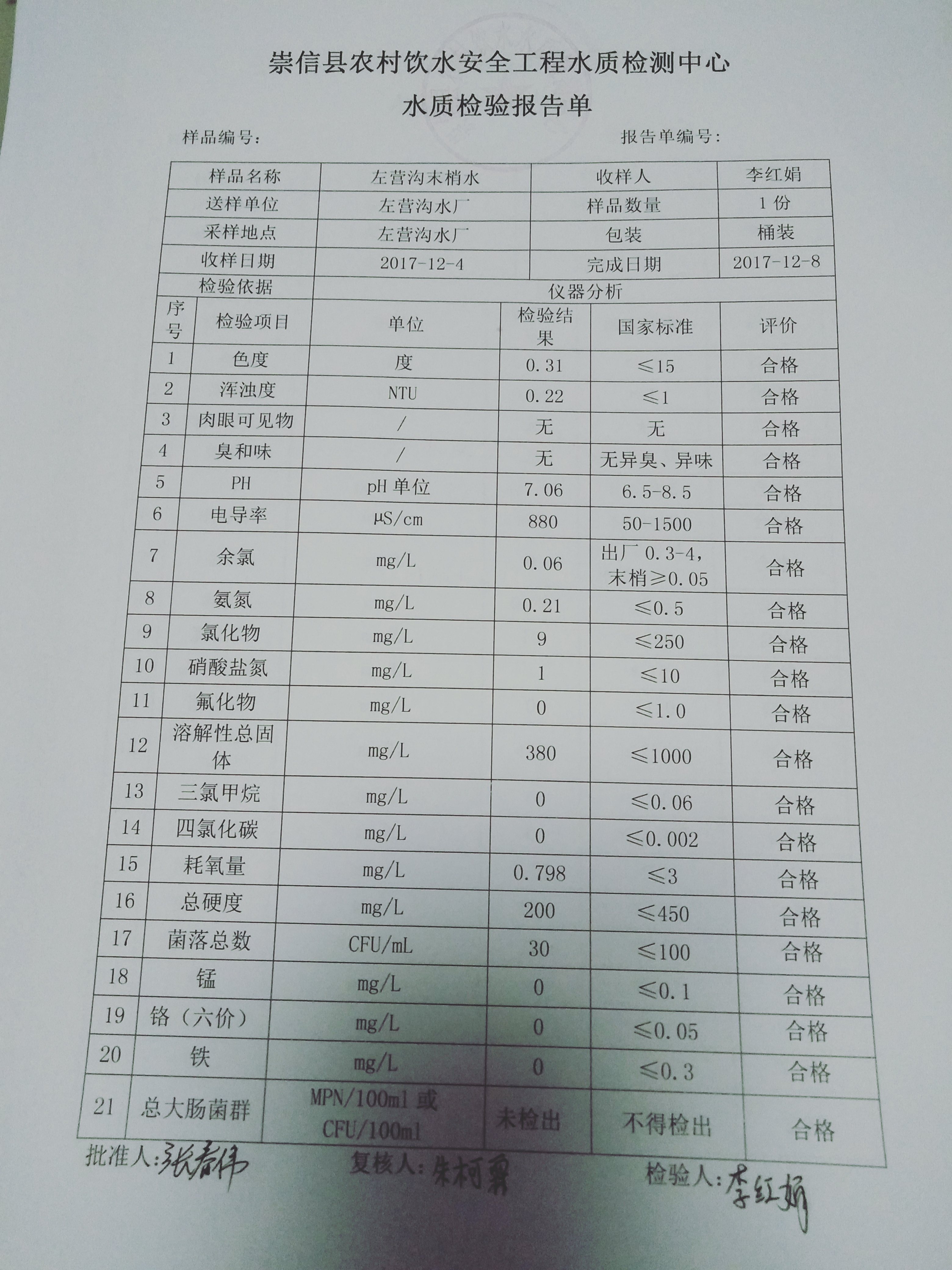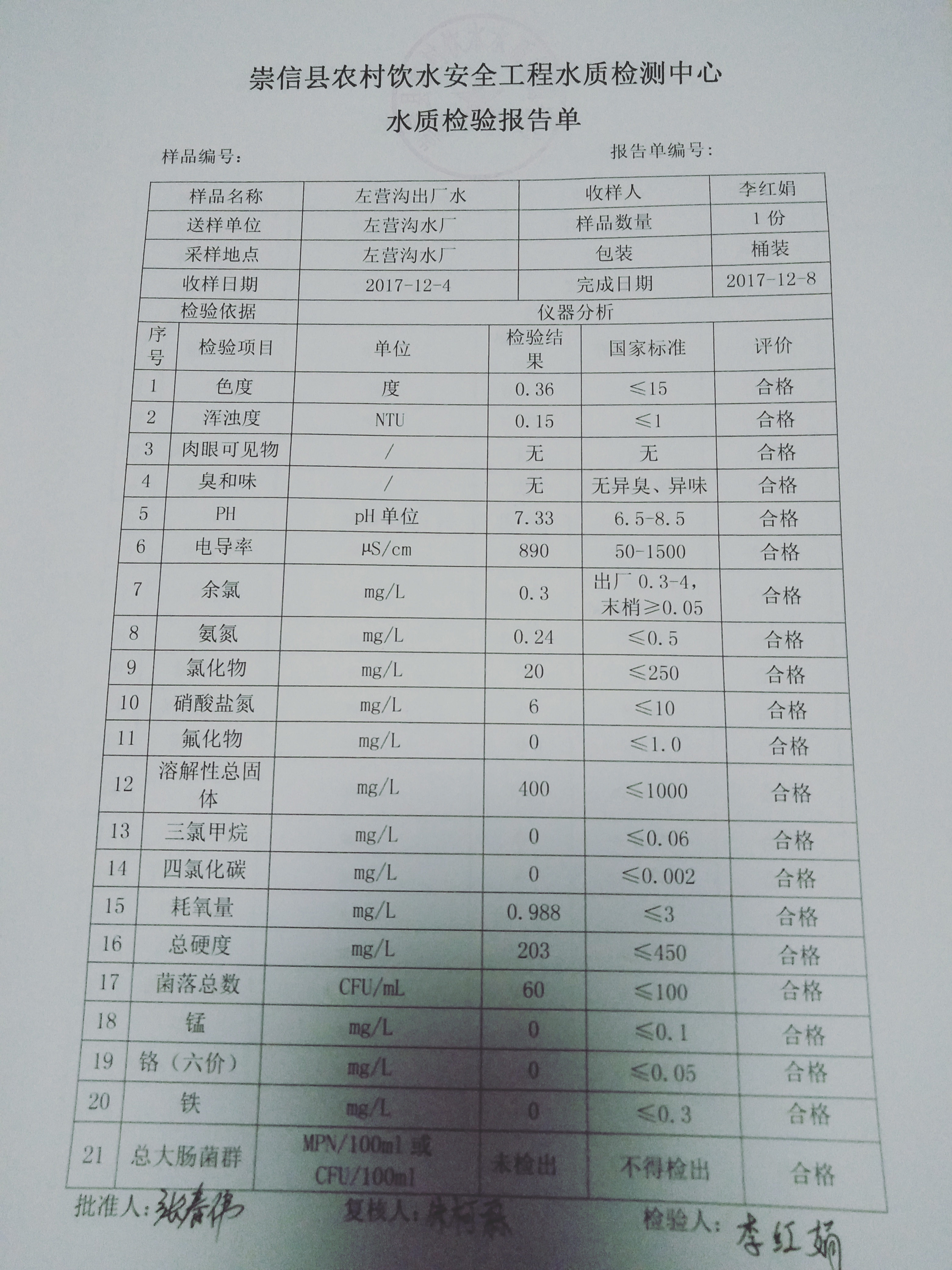 2017年12月份左营沟水厂水质检测报告单 发文日期:2018-01-30 23:16 来源:崇信县水务局 作者:崇信水务局 编辑:崇信水务局 IMG20180130222354 IMG20180130222407 IMG20180130222416 扫一扫在手机打开当前页 上一篇: 2017年12月份新窑水厂水质检测报告单 下一篇: 2017年11月份散花沟水厂水质检测报告单