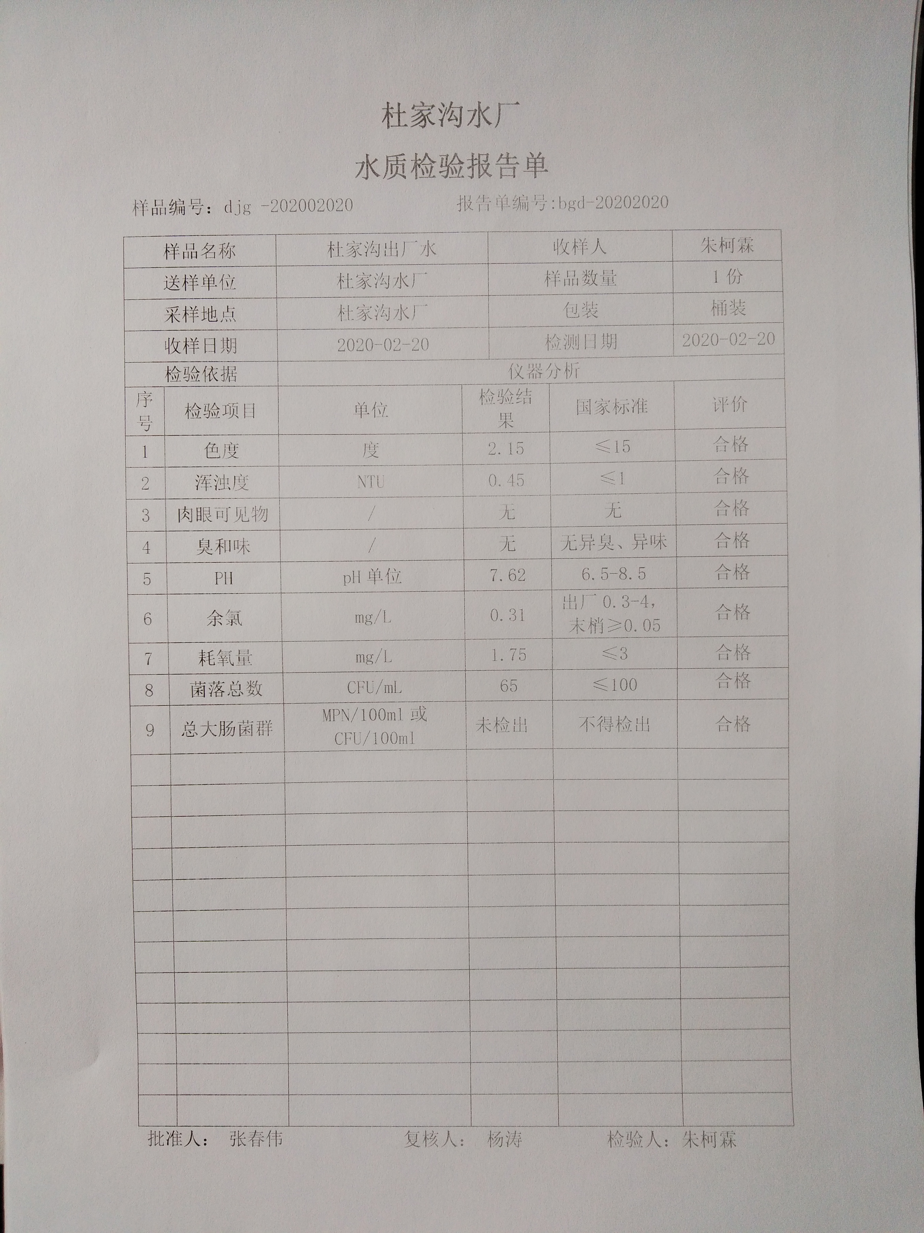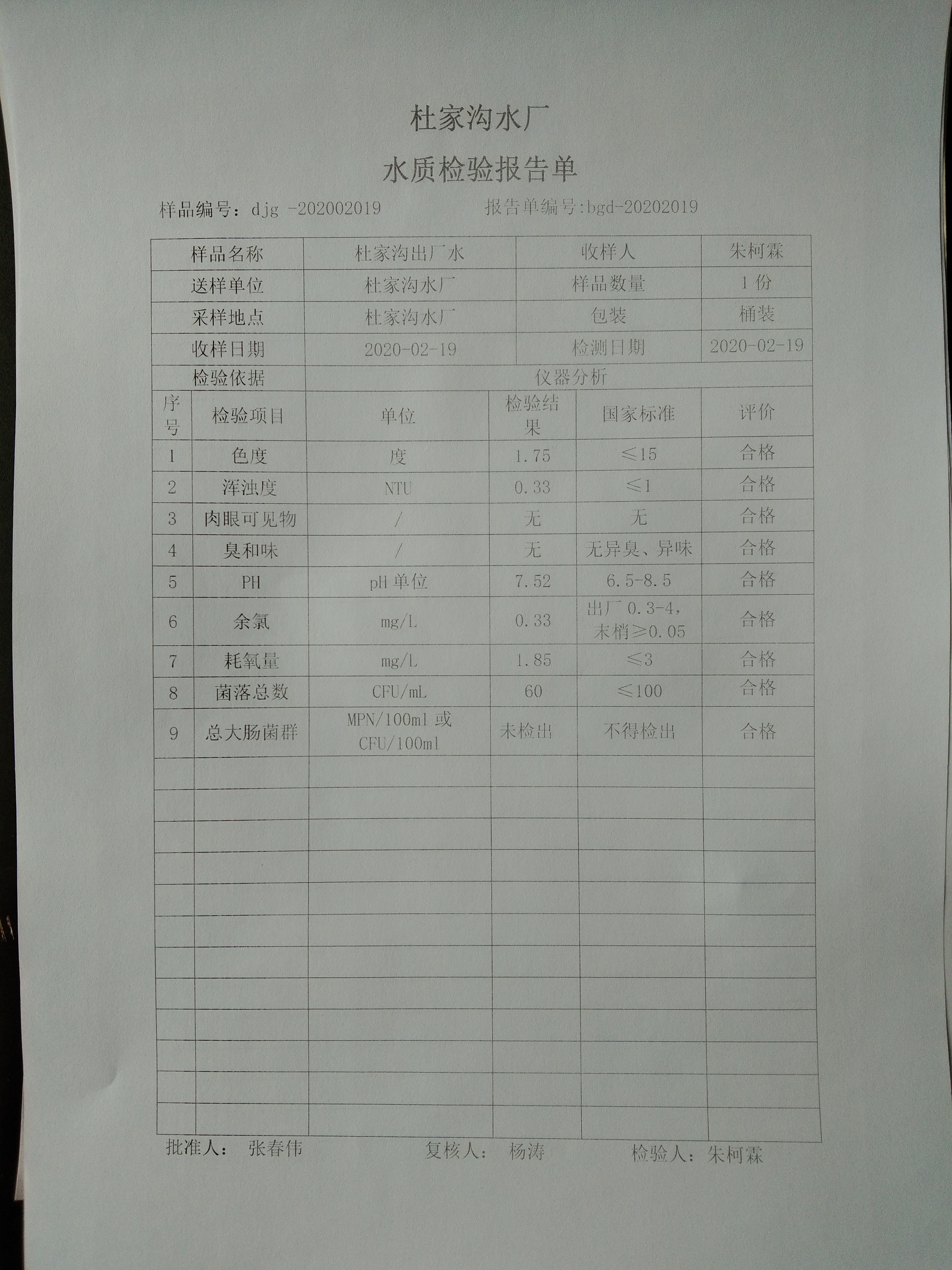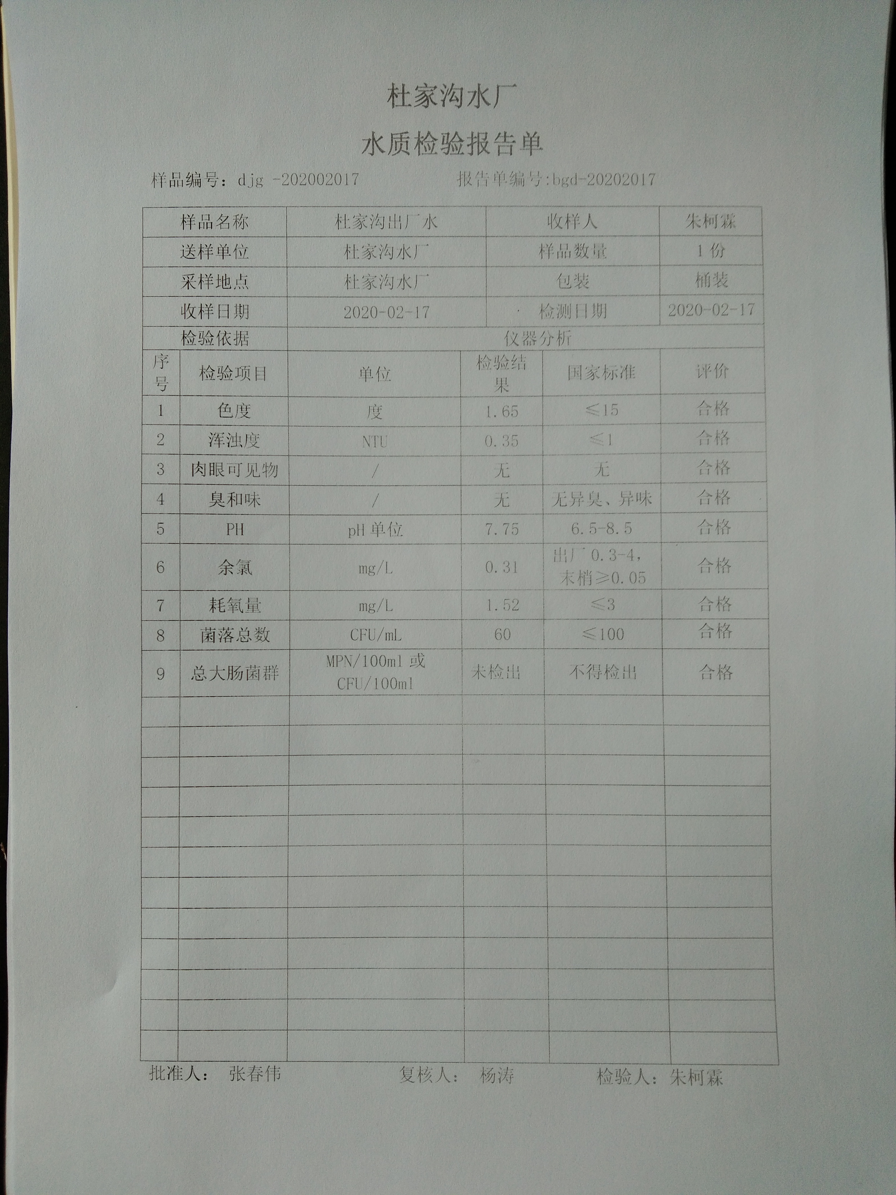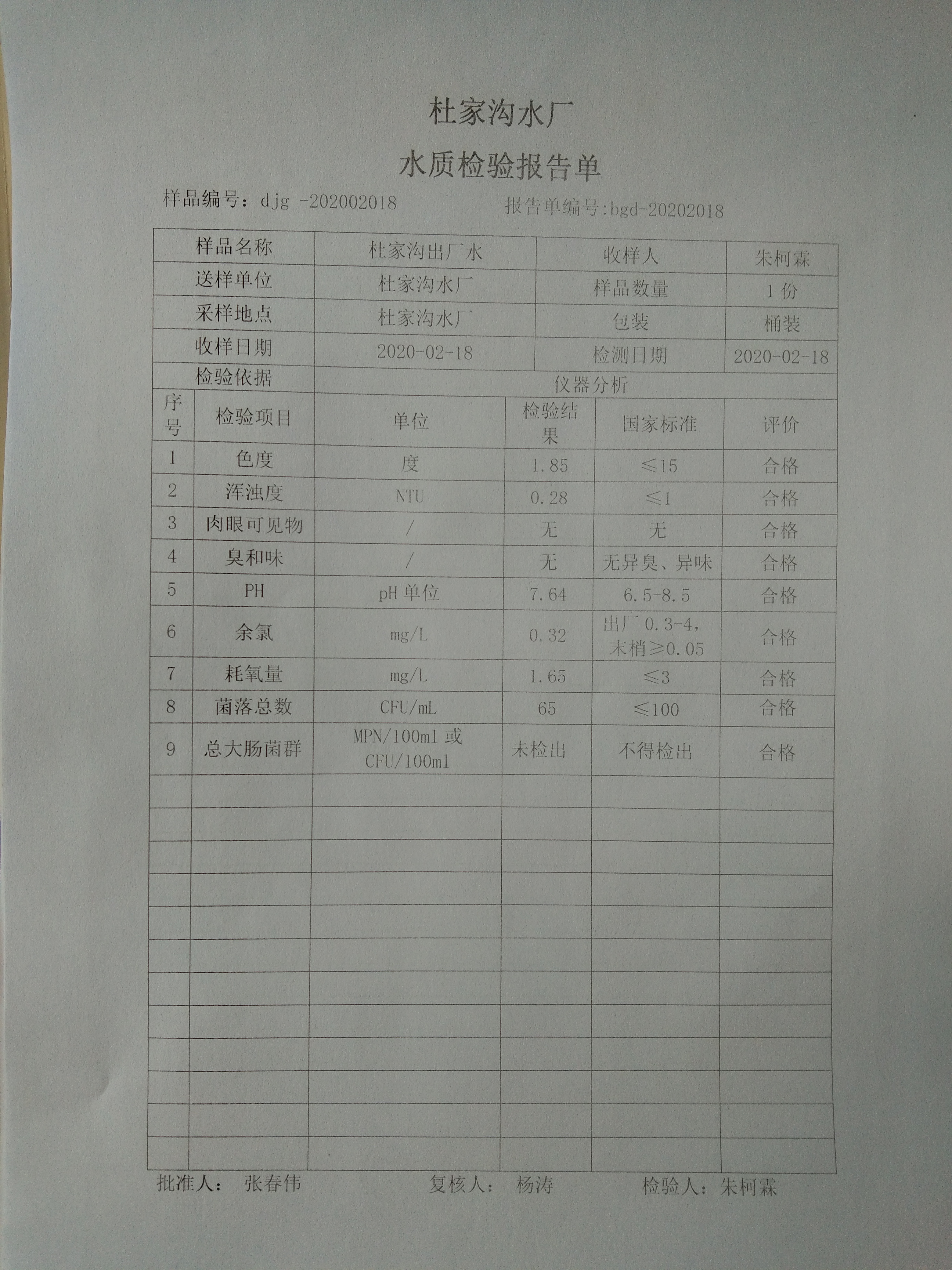 2020年2月份2.17—2.20杜家沟水厂水质日检报告单 发文日期:2020-02-20 00:00 来源:崇信县水务局 作者:崇信水务局 编辑:星云科技 IMG_20200220_144042 IMG_20200220_144049 IMG_20200220_144101 IMG_20200220_144126 扫一扫在手机打开当前页 上一篇: 2020年1月份下半月左营沟水厂水质日检报告单 下一篇: 2020年1月份下半月杜家沟水厂水质日检报告单